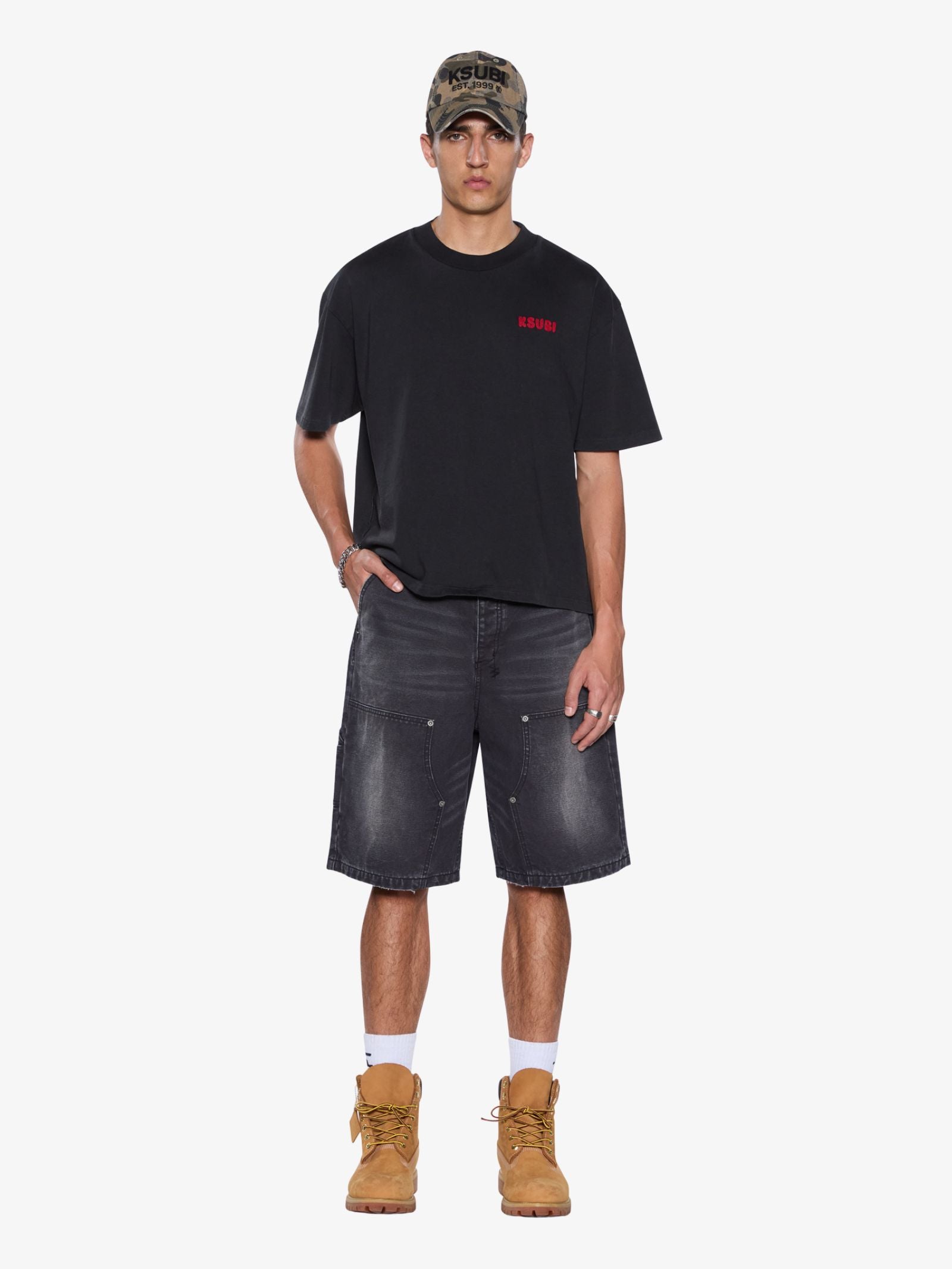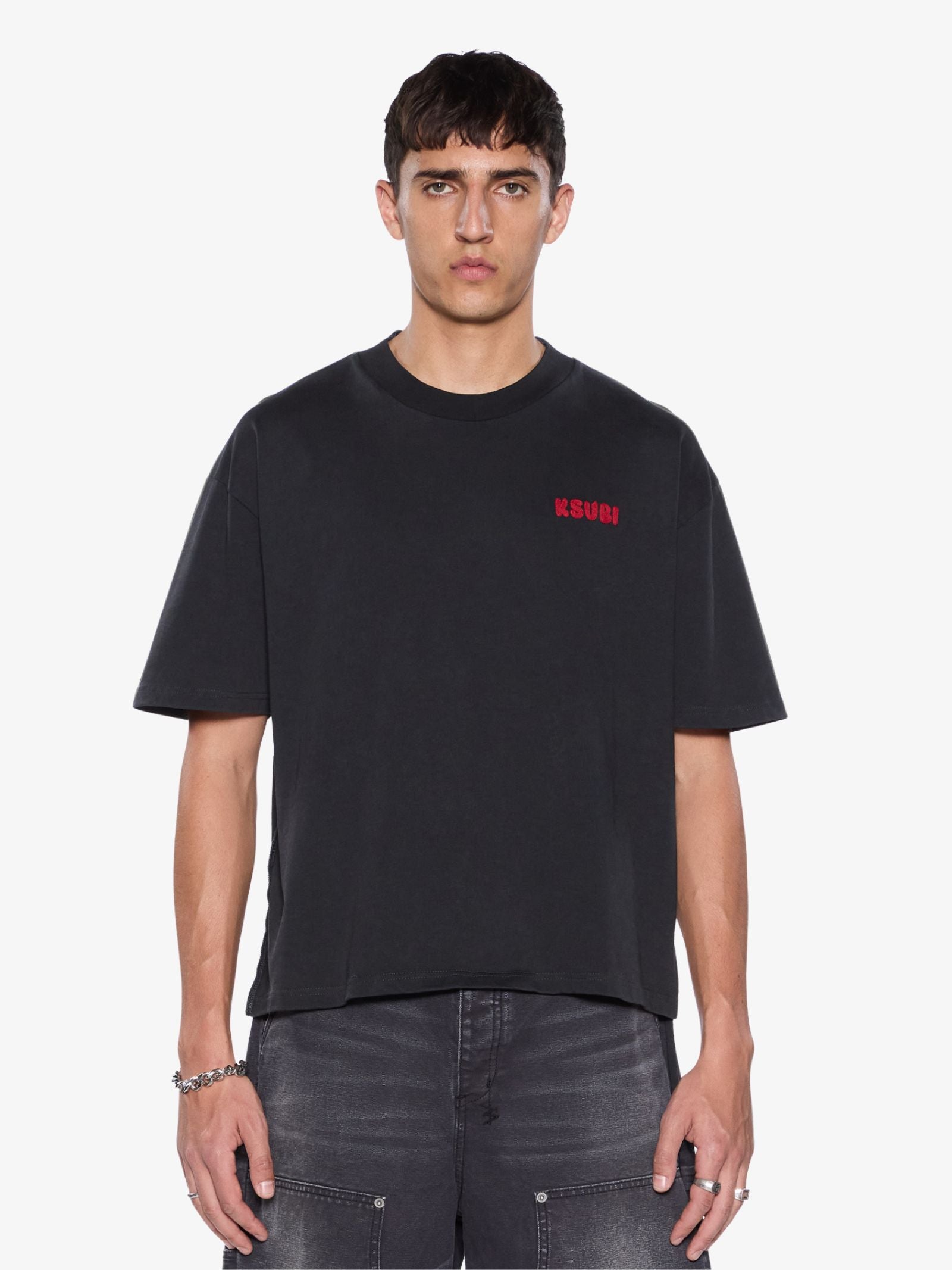 The Mekanik Halen Ss Tee by Ksubi is a short sleeve crew neck t-shirt cut with a relaxed, cropped fit. It is constructed from a washed charcoal jersey fabric and features a small red embroidered KSUBI logo on the front chest. The back panel features large, red, chain-stitched embroidery reading 'KSUBI DENIM Royalty SINCE 1999' across the shoulders.