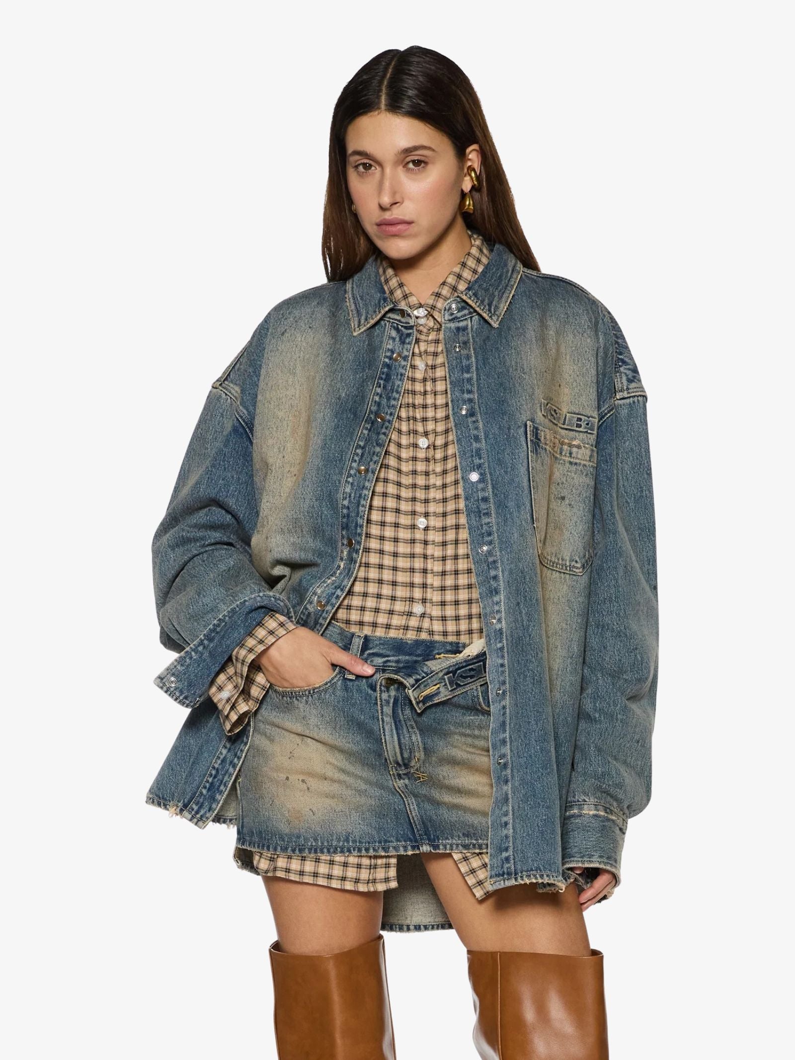 The Oversized Long Sleeve Shirt Dune by Ksubi is made from premium indigo denim with a heavy tinted wash and contrast fading. Designed with a curved hem, tiger eye snaps, and chest patch pocket, it’s finished with signature T-box embroidery.
