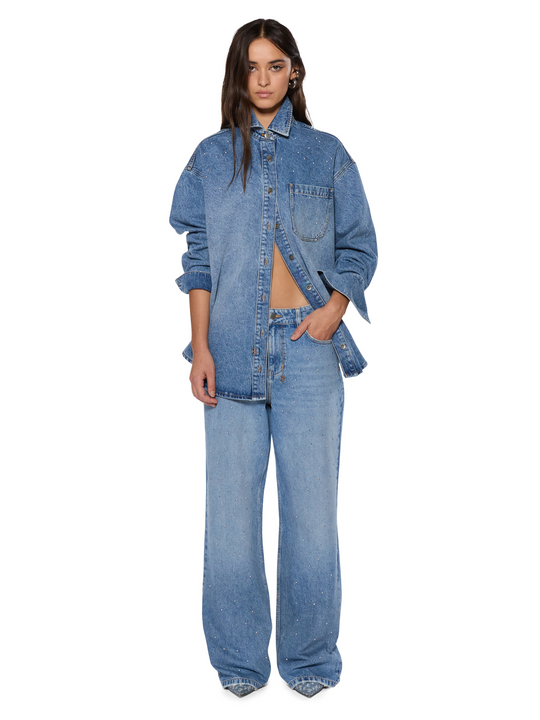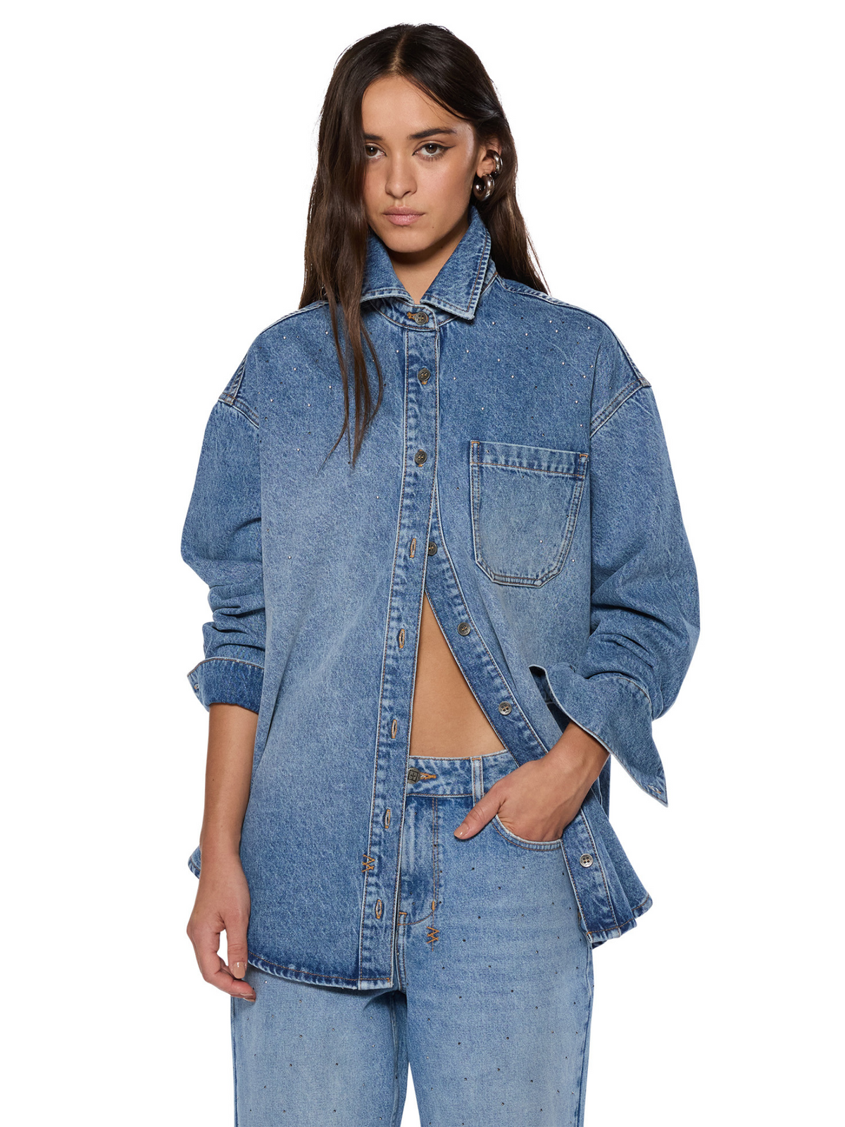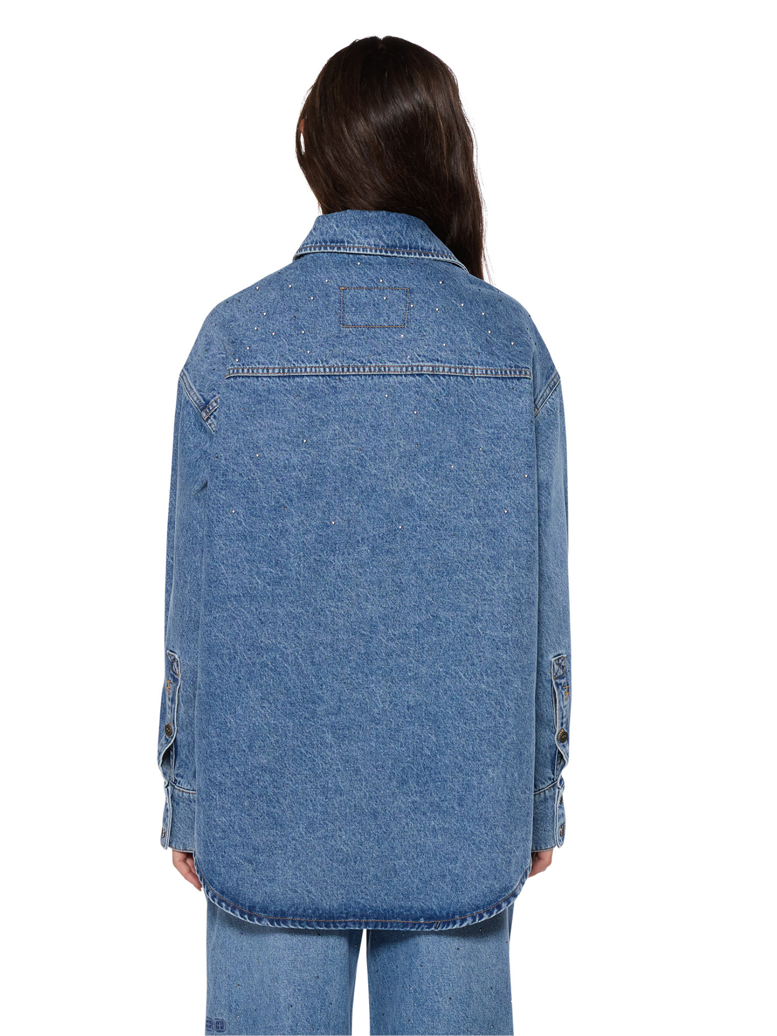 The Oversized LS Shirt in Komet by Ksubi is crafted from premium European rigid denim in a mid-blue stone wash. This shirt features an oversized silhouette, curved hem, and full-length sleeves.