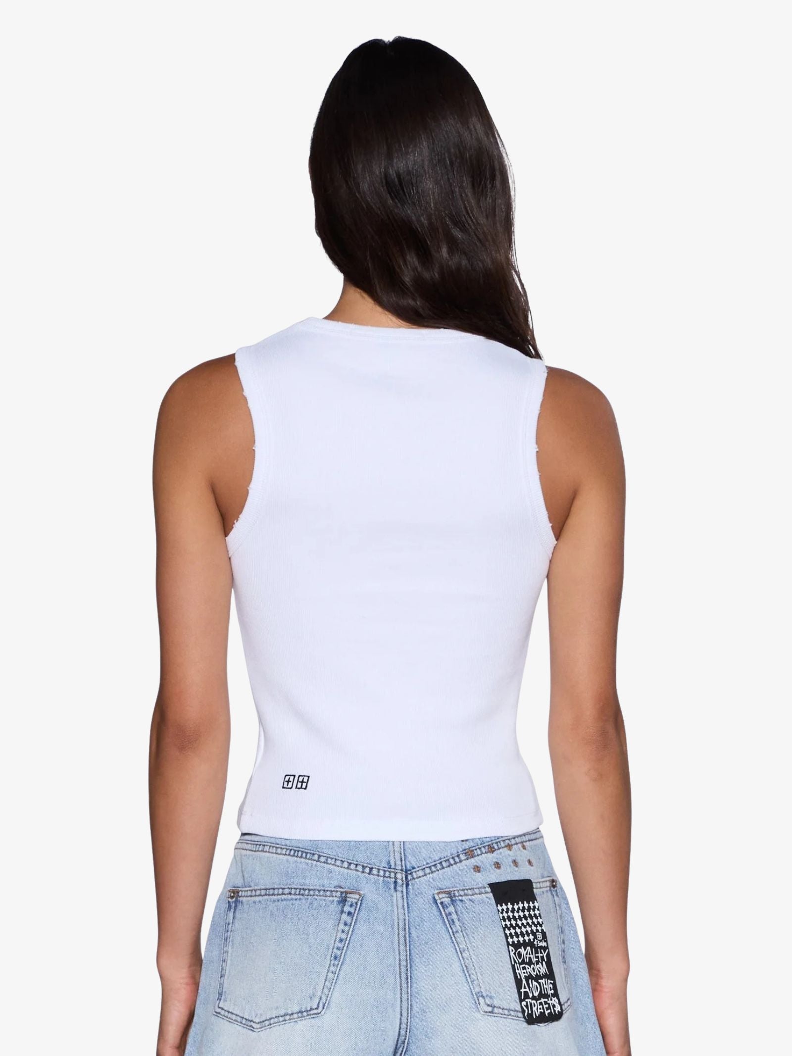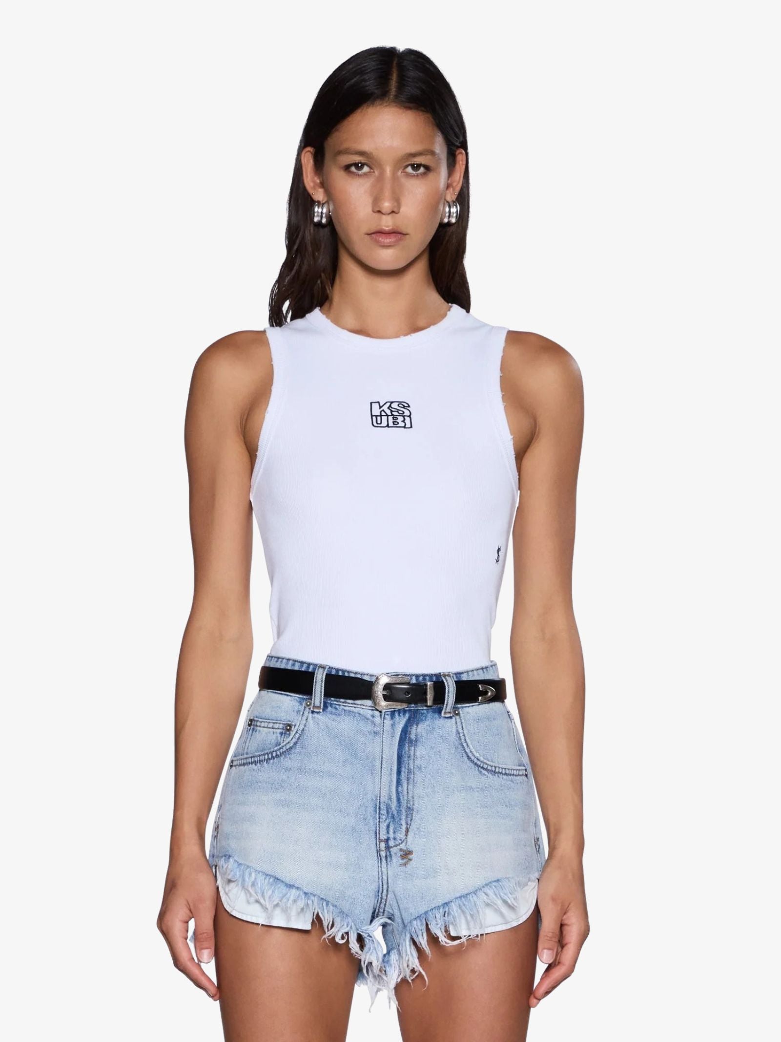 The Stacked Syndicate Tank by Ksubi is a fitted, full-length racerback tank constructed from a premium cotton blend rib fabric with a round neckline. This tank features self bind finishes on the neck and armhole openings, Ksubi logo embroidery on the front chest, T-box embroidery, and Ksubi cross dollar embroidery at the back hem.