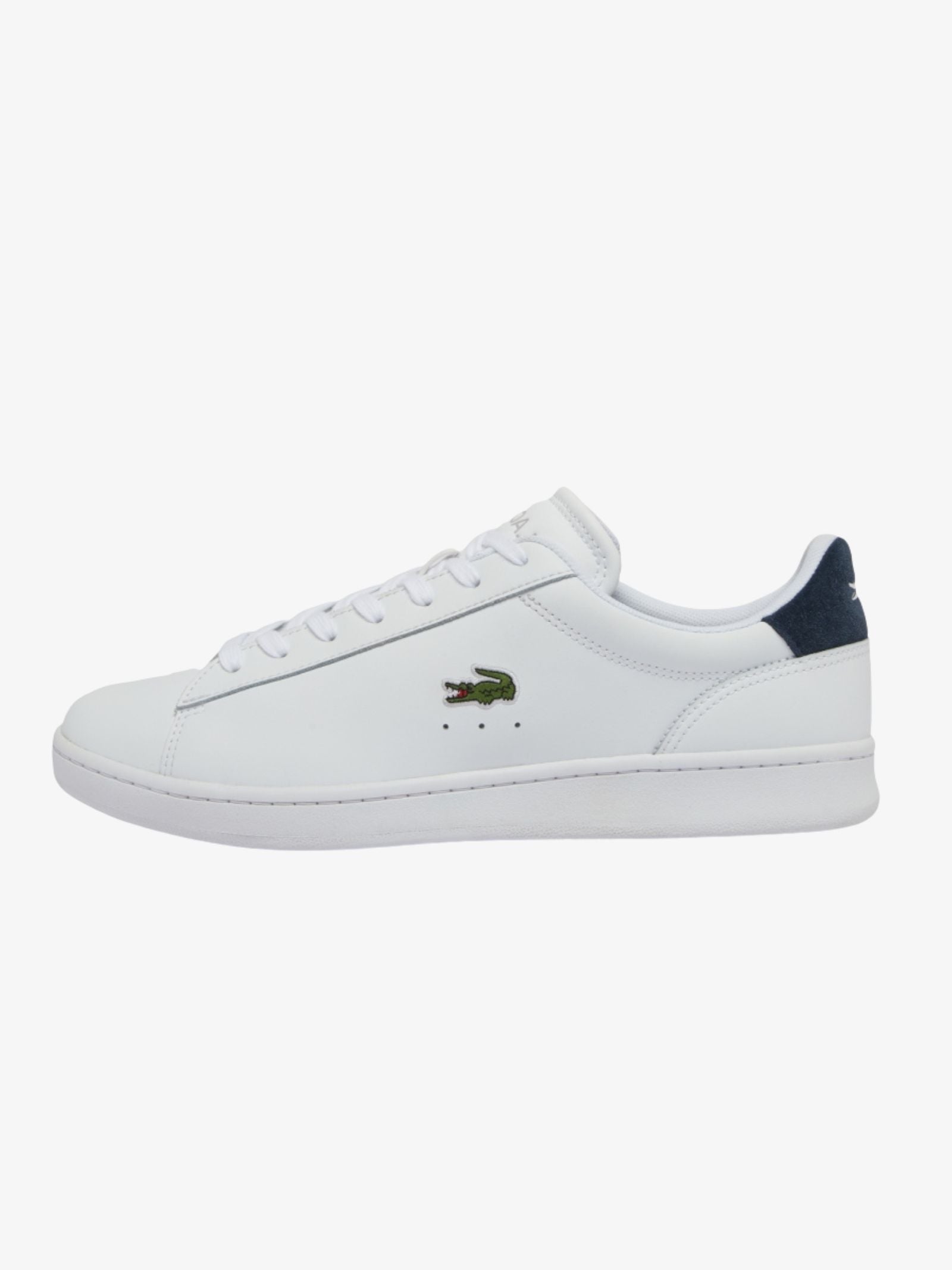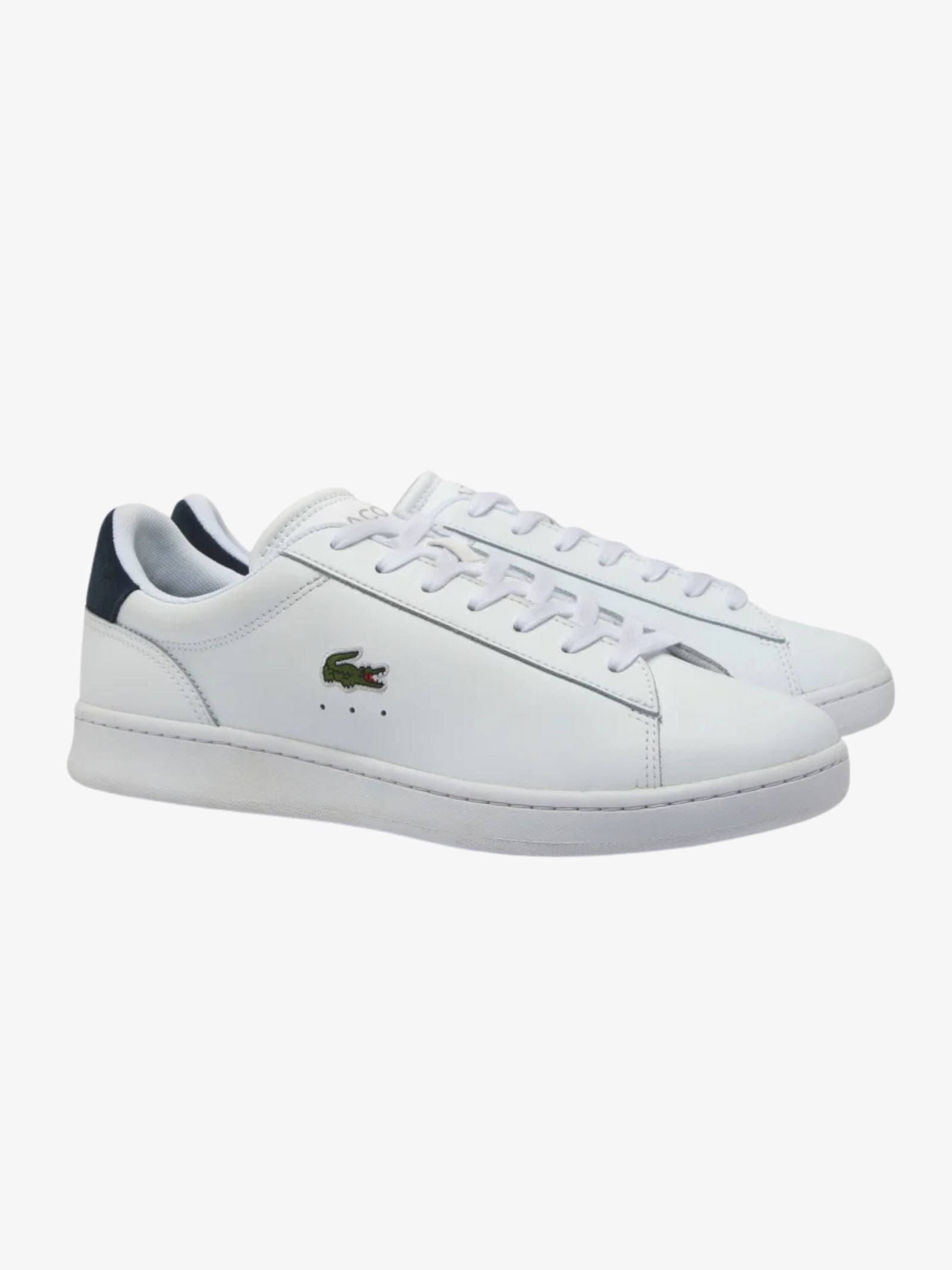 The Men's Carnaby Set Trainers by Lacoste is a classic court-style shoe with a coated leather upper, textile lining, and padded collar, finished with the signature green crocodile logo.