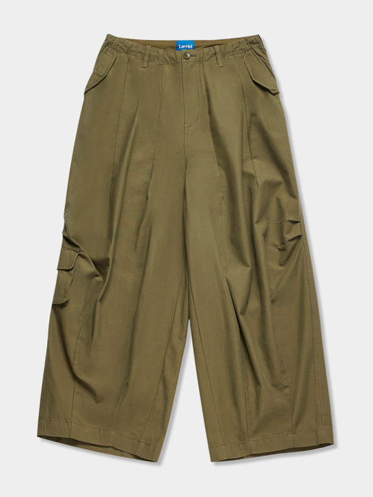 The Murphy Pant by Larriet offers a voluminous silhouette with a relaxed, utilitarian edge. Designed with knee pleats and darts at the waist and leg openings, it delivers structured volume and easy movement. A discreet drawstring waistband ensures comfort, while slant pockets with snap-button flaps and a bellow cargo pocket add functional detail.