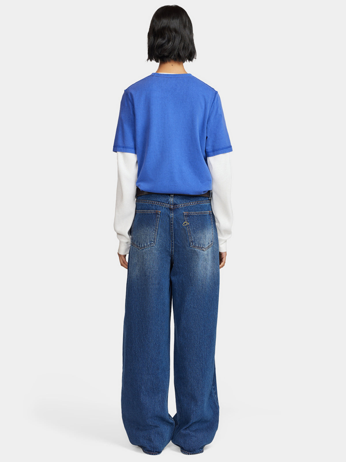 Step into a blend of classic and contemporary with the Wale Jean. Crafted from heavyweight denim in a stunning 70's wash, these Jeans offer a durable yet comfortable fit. On the back pocket, a distinctive cowboy hat embroidery adds a touch of unique character. The button fly ensures a timeless finish, while the modern, loose cut maintains a relaxed, trendsetting silhouette.