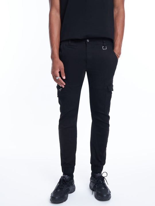 Constructed with a slim fit design, these utility pants feature elasticized cuffs and a waistband with belt loops. Additional cargo pockets are incorporated into the legs, along with back pockets equipped with a button and flap closure. Made with a blend of 98% cotton and 2% elastane, the fabric provides moderate stretch for optimal comfort and movement.