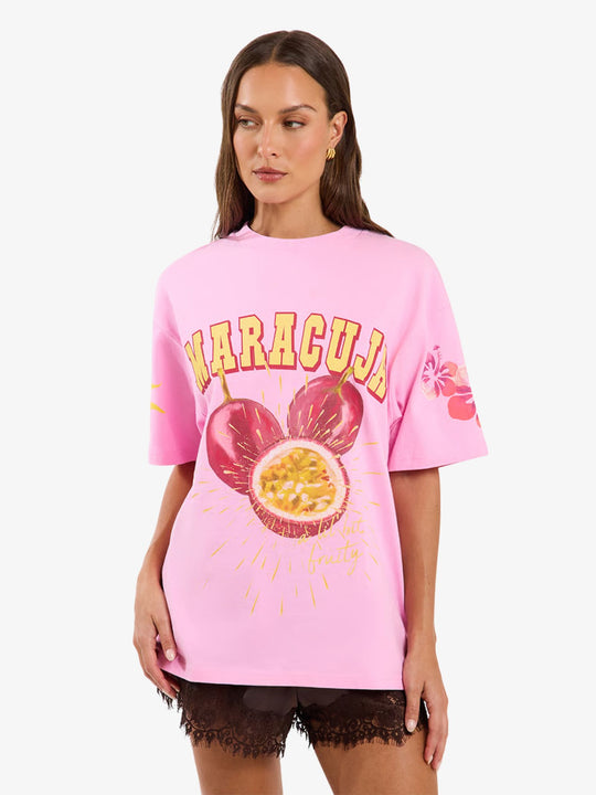The Maracuja Tee by Liido is a relaxed-fit top made from soft cotton jersey with statement graphic detailing. This shirt features a large fruit print on the front and additional graphics on the sleeves and back.