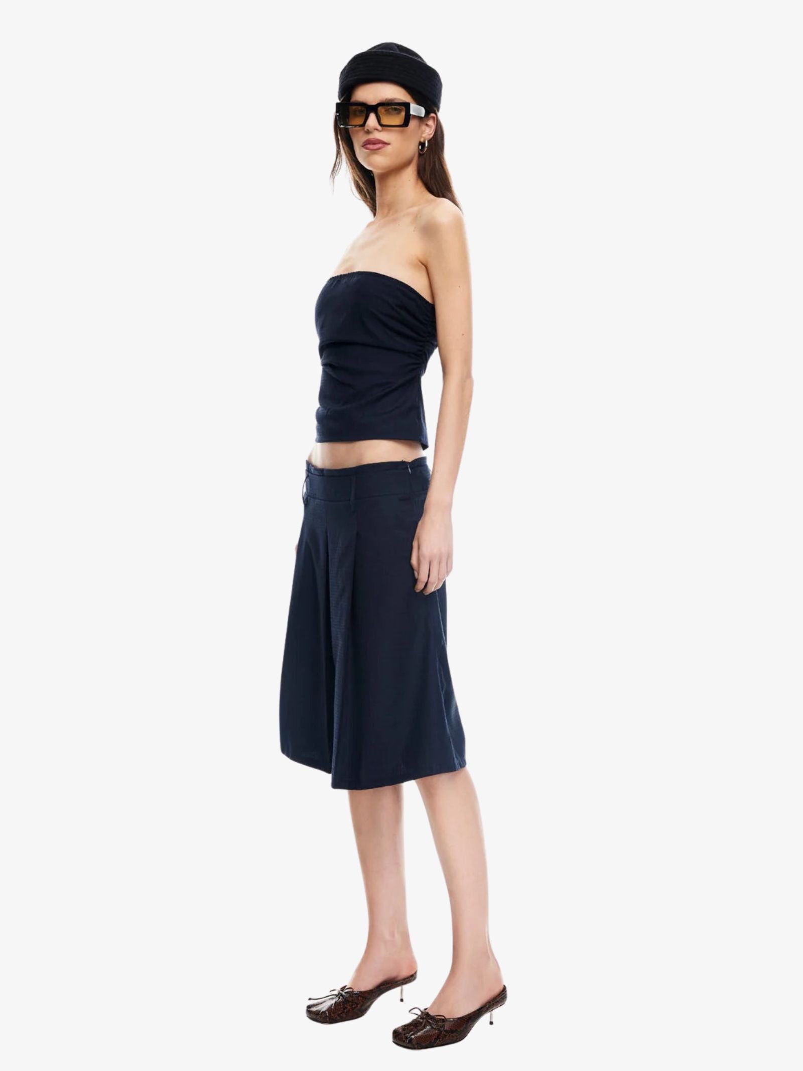 The Twilight Top from Lioness features a strapless design with ruched sides for a flattering, fitted silhouette. The bold plaid pattern adds a modern touch, perfect for pairing with a variety of outfits.