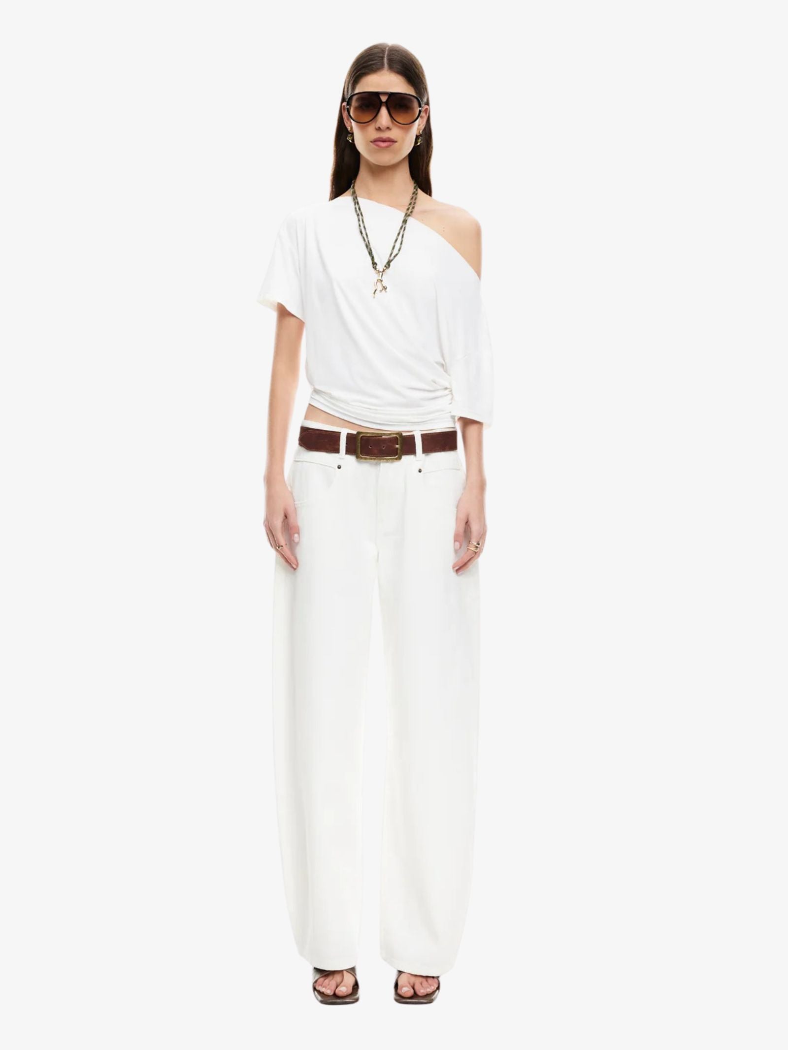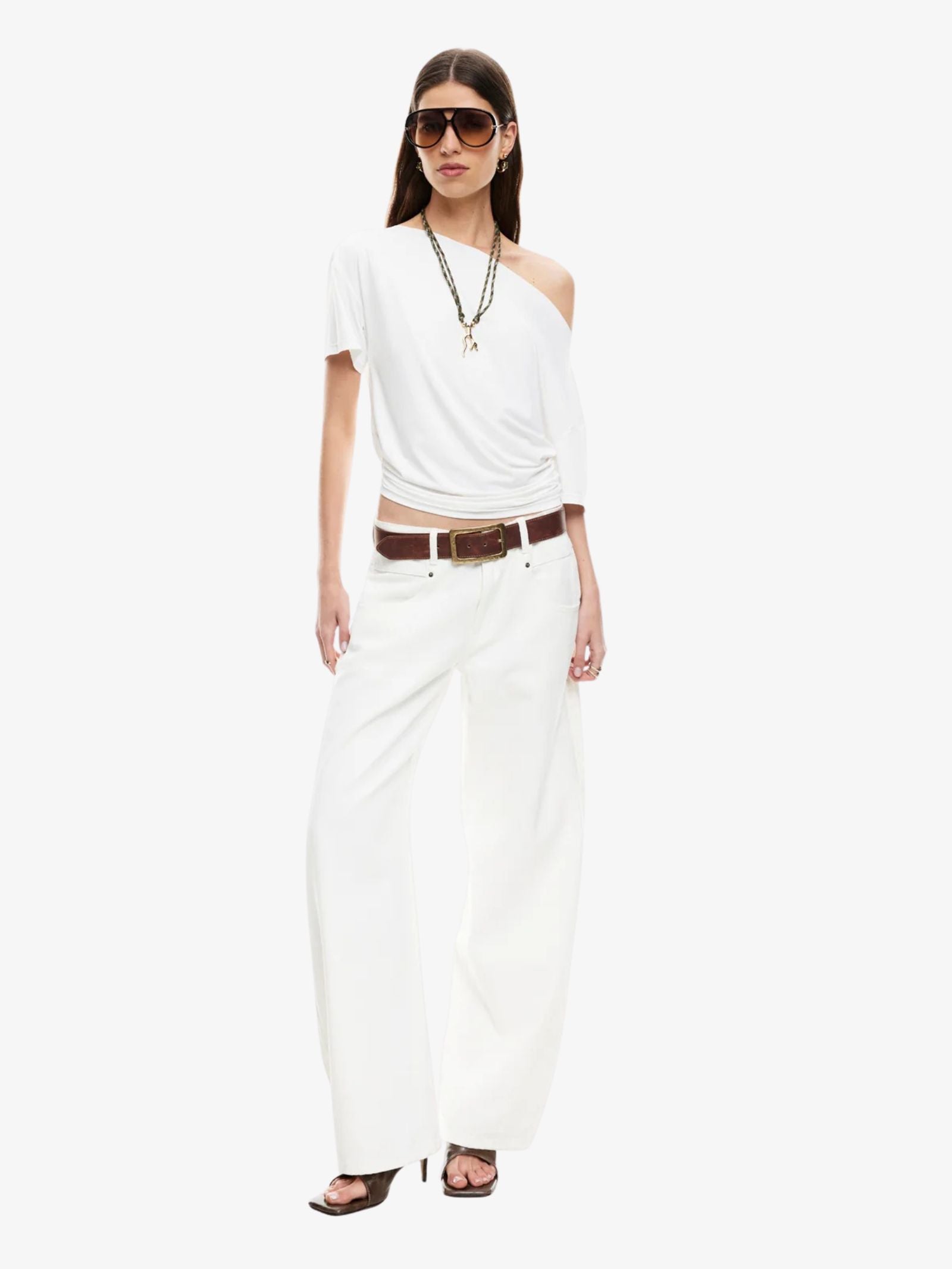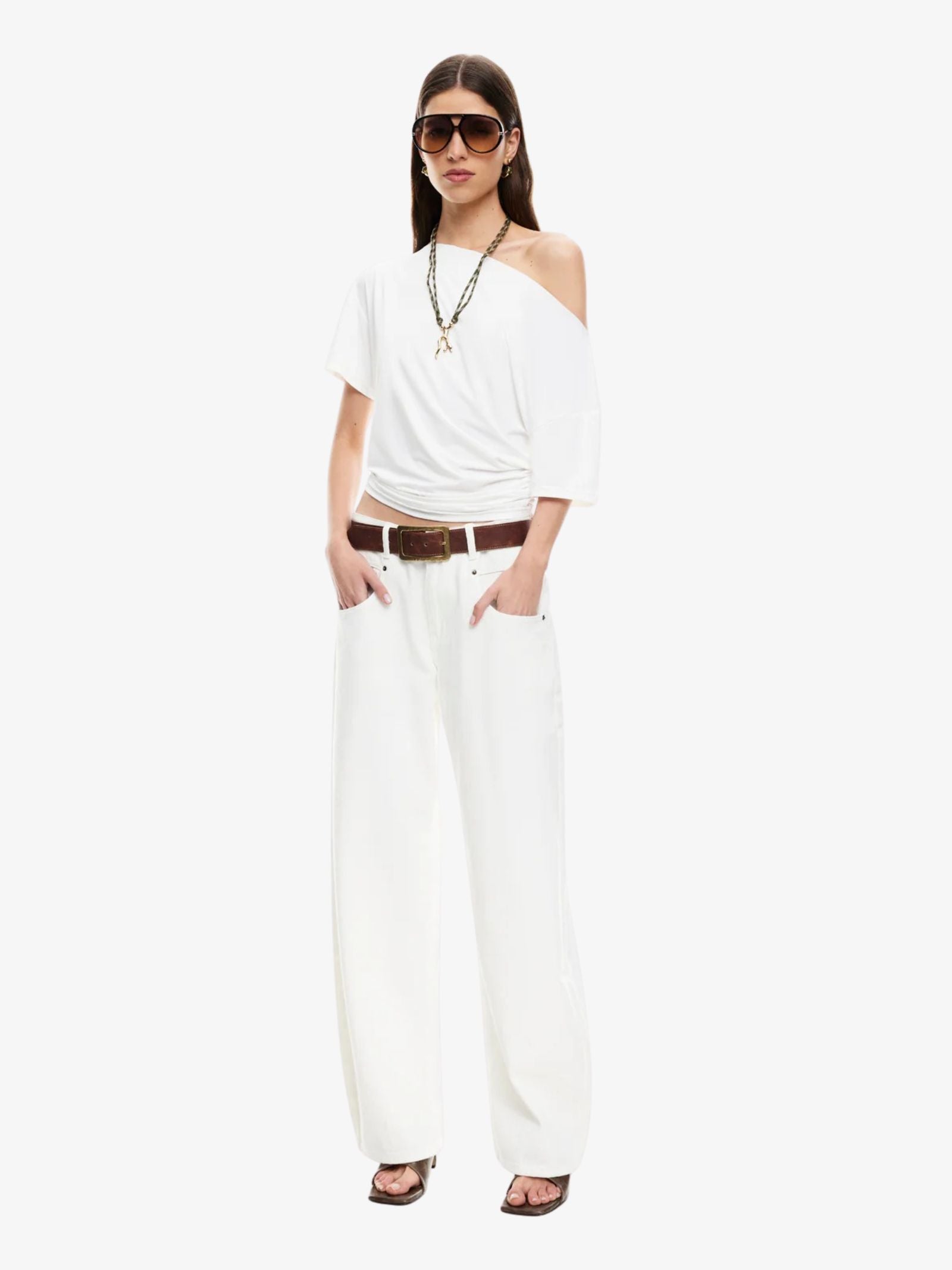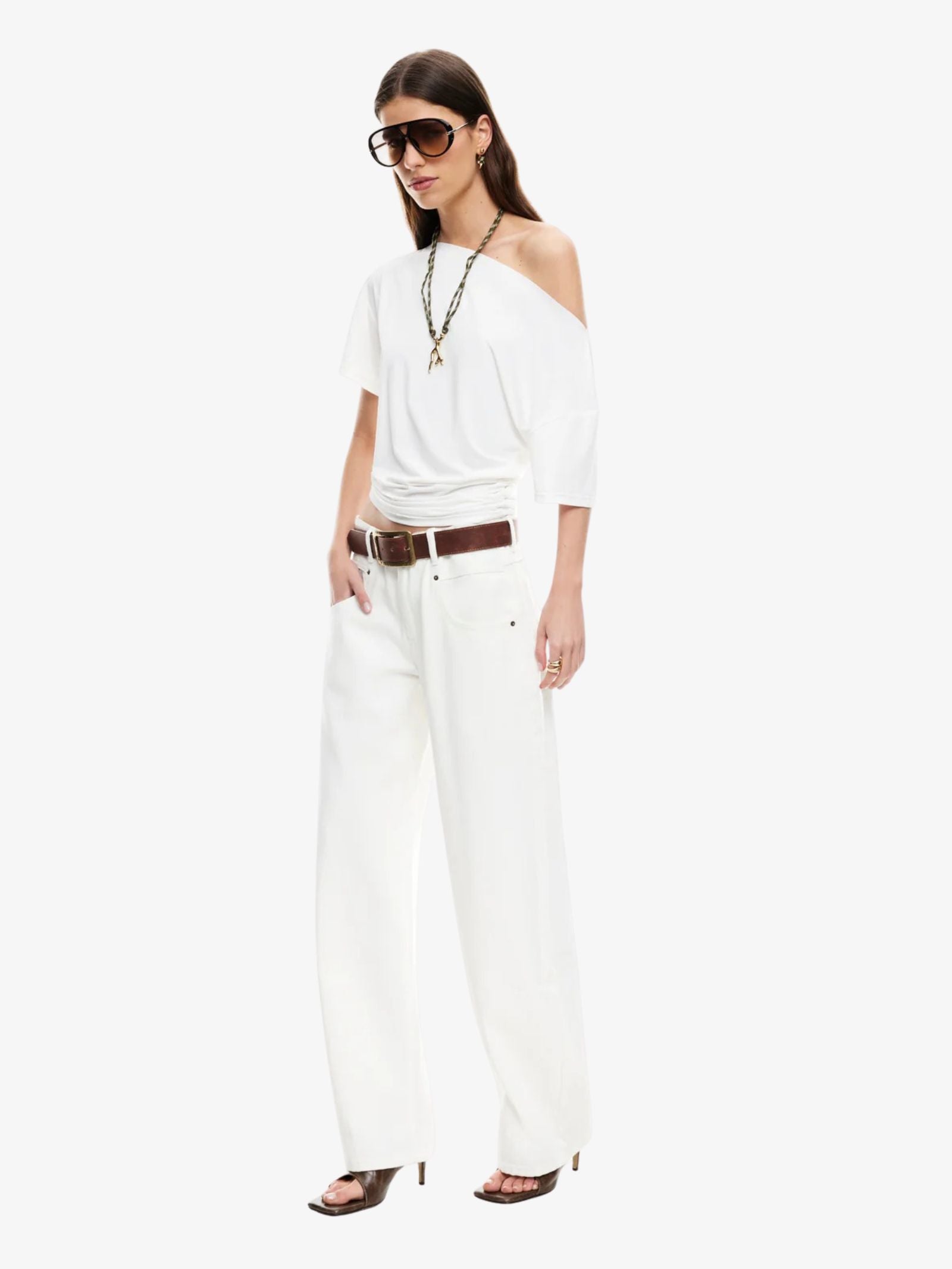 The Wildlands Tee by Lioness is made from a soft nylon and elastane blend and designed with a regular fit that runs true to size. This top is a great new basic, featuring an asymmetric off-shoulder neckline and subtle ruching detail on the sides.