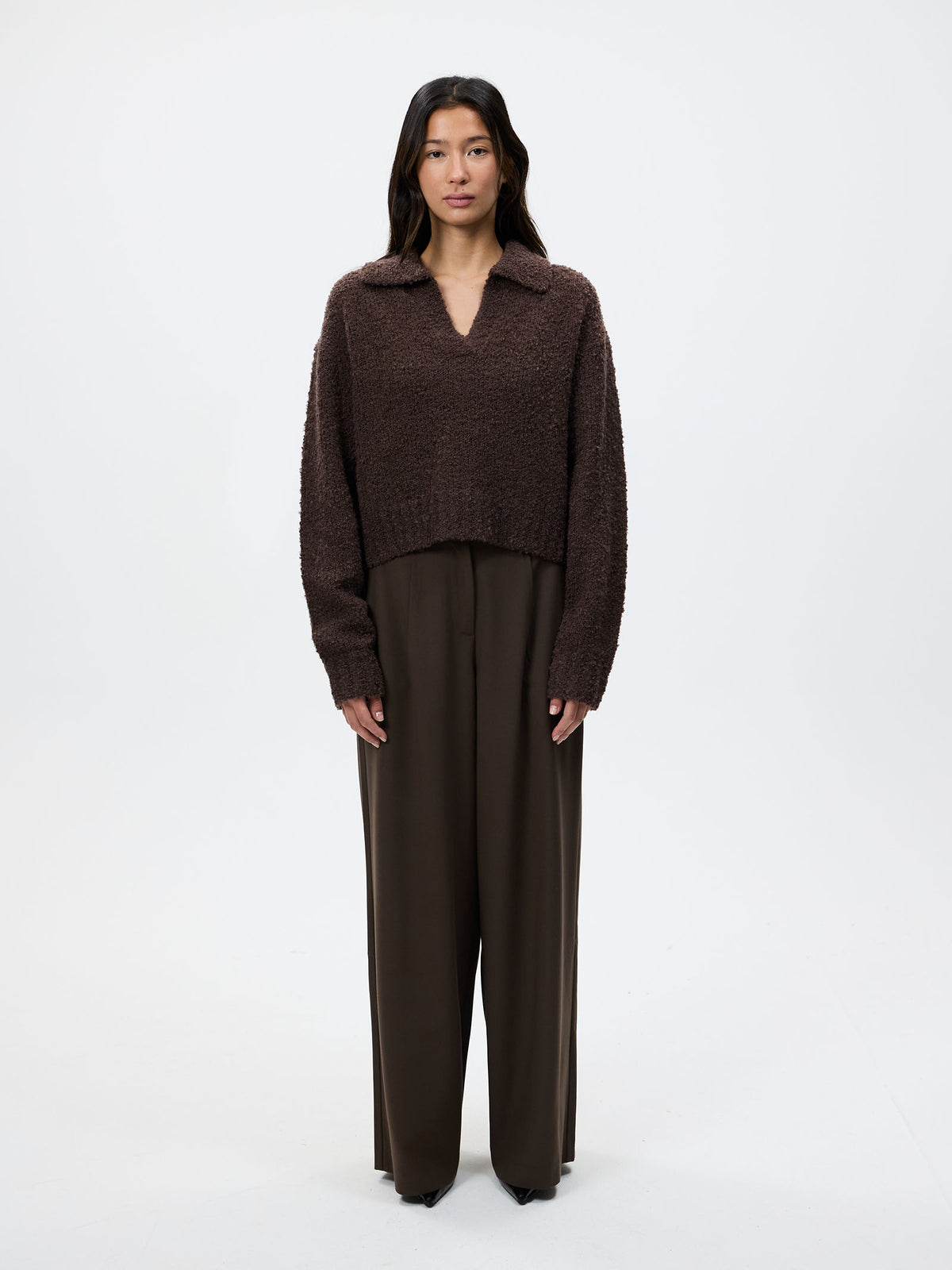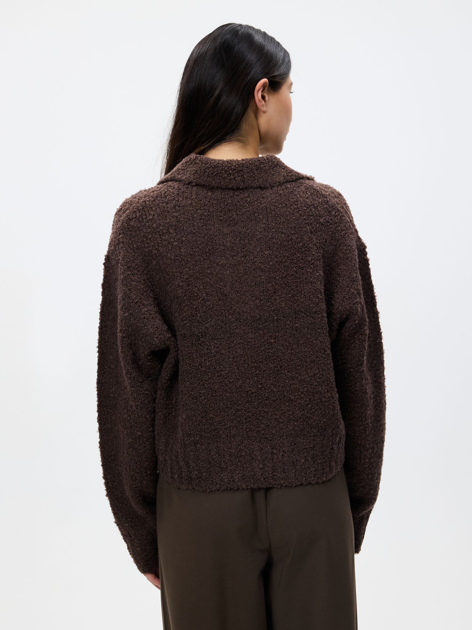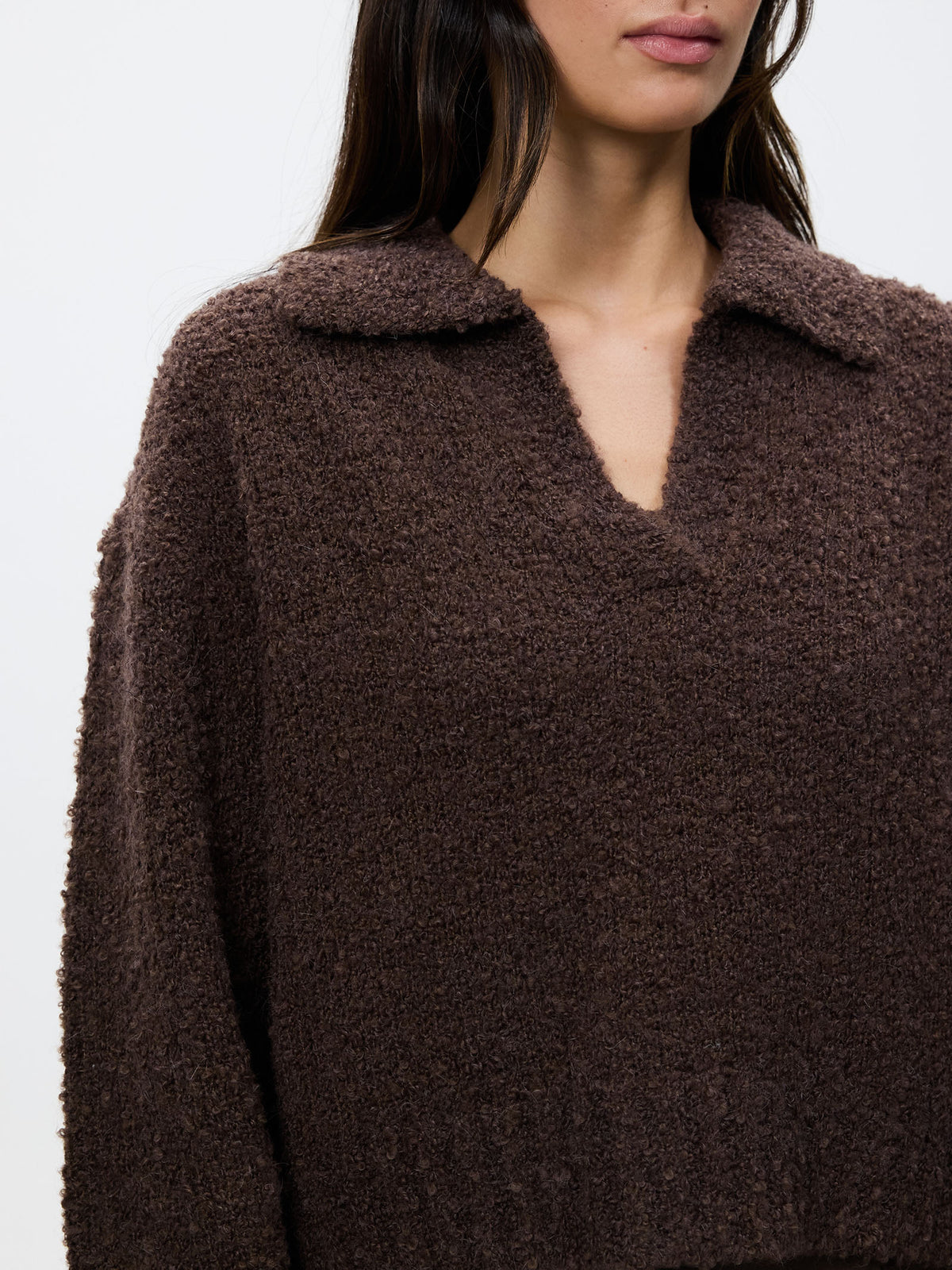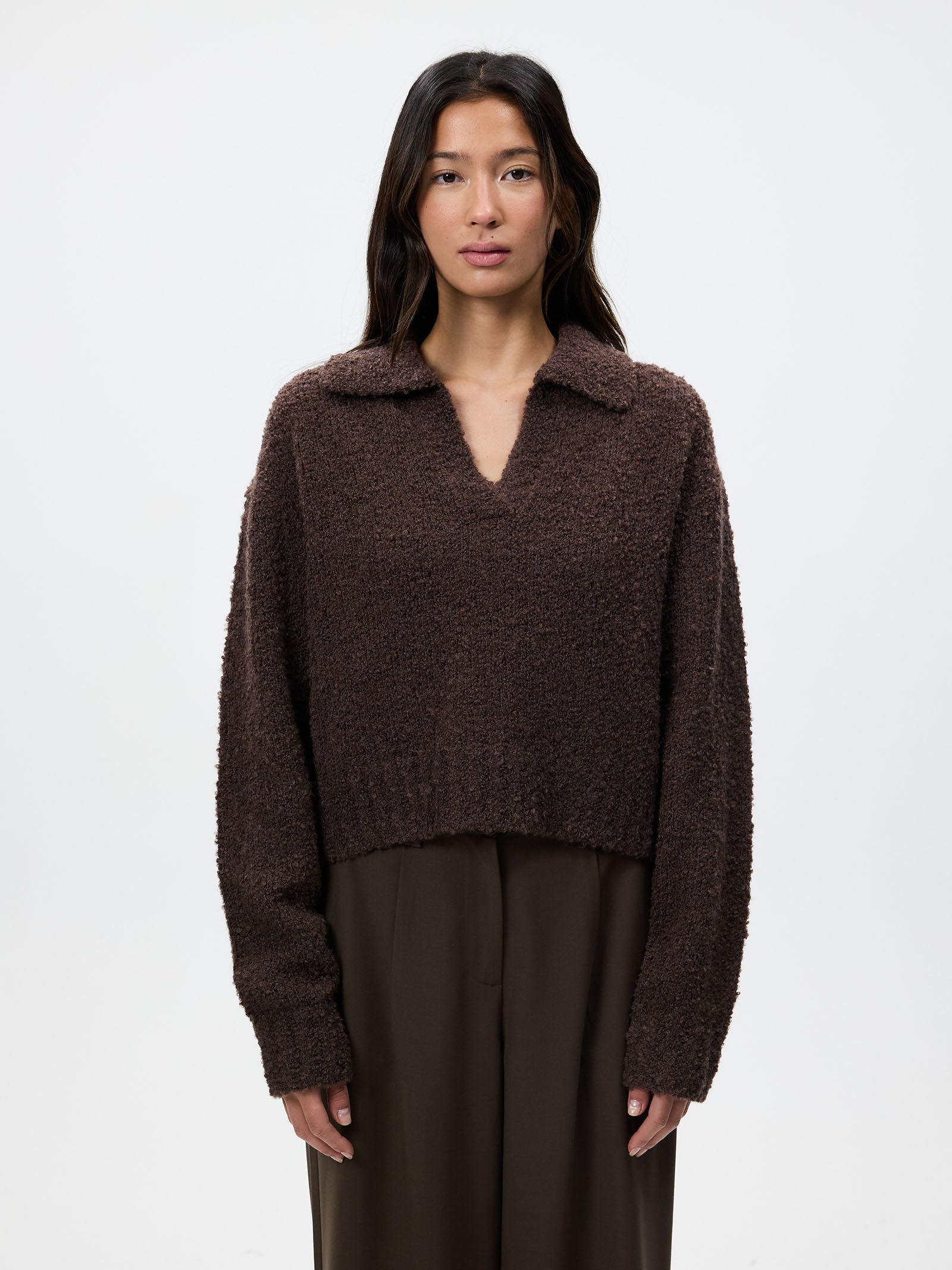 The Evie Rugby Knit in Espresso by Lulu & Rose is crafted from a soft knit fabric. This top features a structured collar and a relaxed fit.