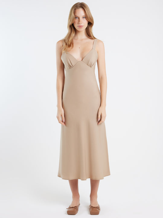 This midi dress features regular shoulder straps and a V-neckline, while also having angled seam detailing below the cups. The back of the straps also includes adjustable sliders, and the design has a slip style that skims over the hips and flows at the hem. Additionally, it has been expertly crafted with a bias cut for a flattering fit.