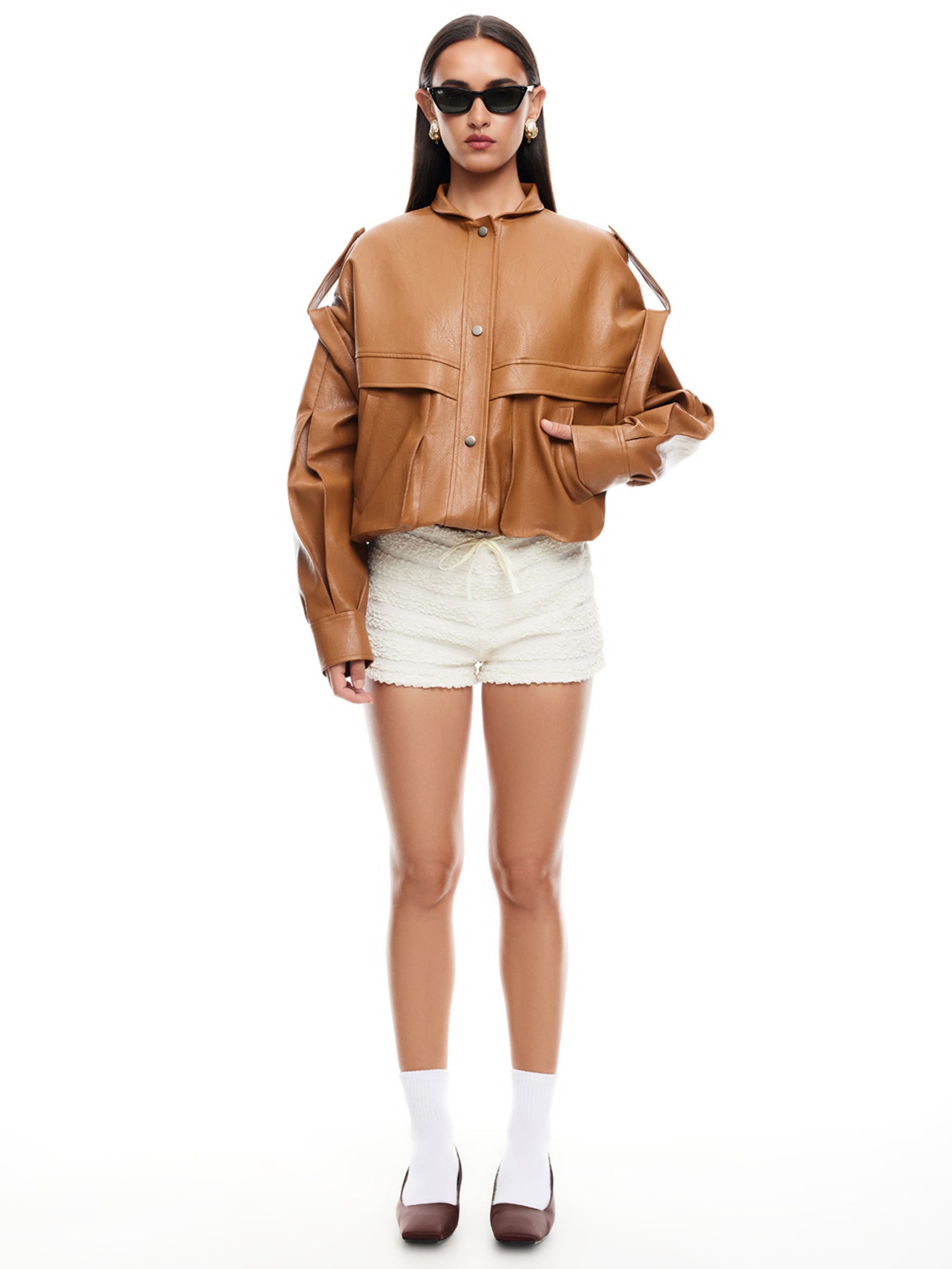 The Madame Bomber jacket is the perfect combination of style and comfort. Made with oversized proportions and vegan leather, it features a drop shoulder design and storm flap for a trendy look. The elasticated hem adds a touch of practicality, making this bomber jacket a must-have for any wardrobe.