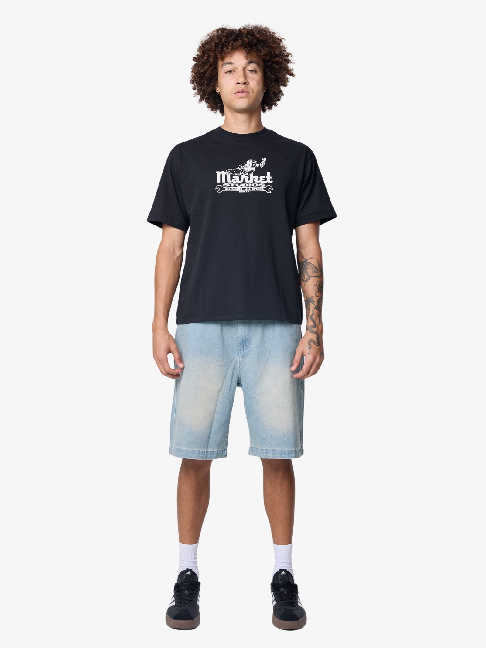 The Speed And Quality T-Shirt from Market Studios comes in black with cream screen-printed graphics on the front and back. The design features retro-inspired “Market Studios” artwork, bold text, and illustrated character details.