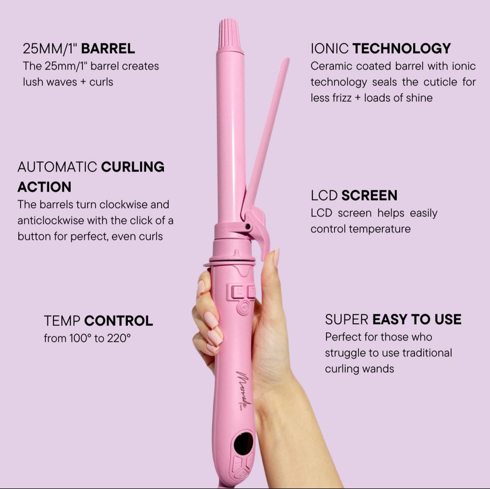 Achieve effortless, salon-quality curls with the Spin Curl Tong by Mermade, the ultimate styling tool for lush, medium-sized waves and curls. Featuring an automatic 360° rotating barrel, this curler simplifies styling, making it perfect for those who struggle with traditional wands. Its advanced ionic ceramic technology seals the hair cuticle, reduces frizz, and enhances shine, while the adjustable temperature range (100°C–220°C) ensures optimal heat for all hair types. With a 25mm barrel, rapid 60-second heat-up, and a tangle-free swivel cord, styling becomes quick and hassle-free. Complete with a heat-protection glove, universal voltage, and an auto shut-off feature, this curler combines safety, convenience, and professional results.