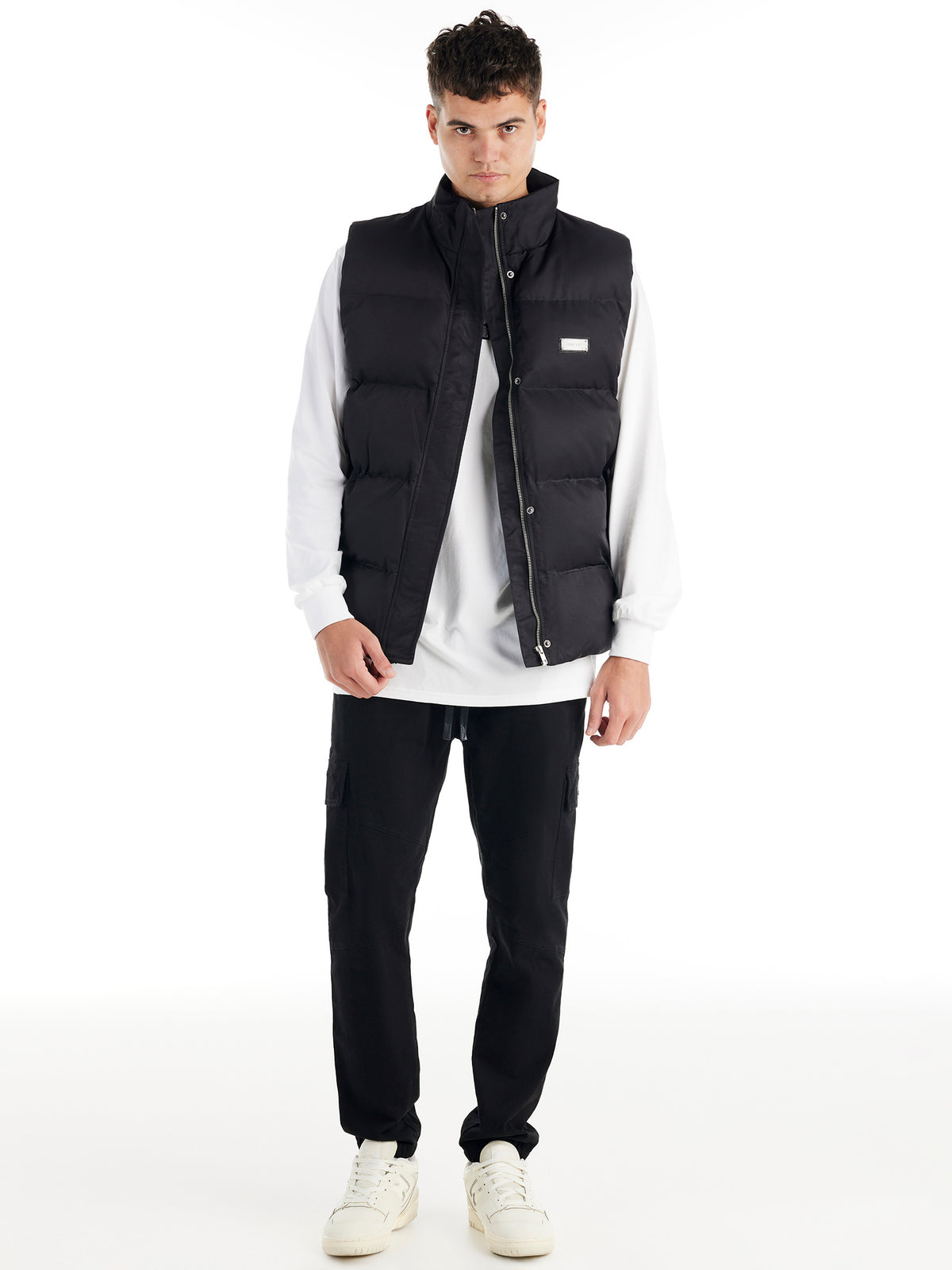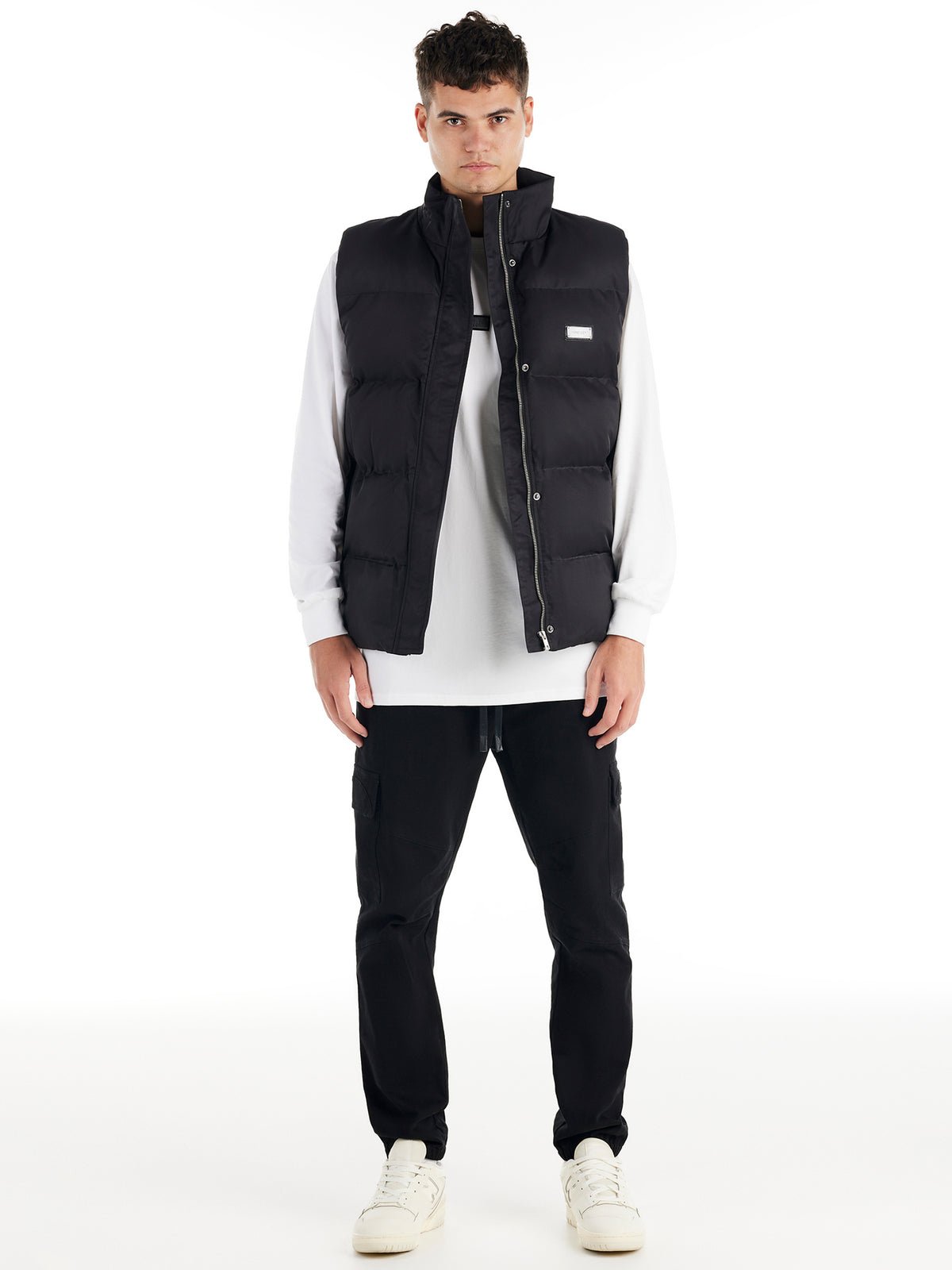 The Monet Puffer Vest comes in a sleek black color with horizontal quilted detail, providing a stylish and modern look. Designed for comfort and warmth during the colder months, the vest features a zip and button closure. A metal heritage logo plate on the chest adds a touch of sophistication. Ideal for the upcoming winter season.