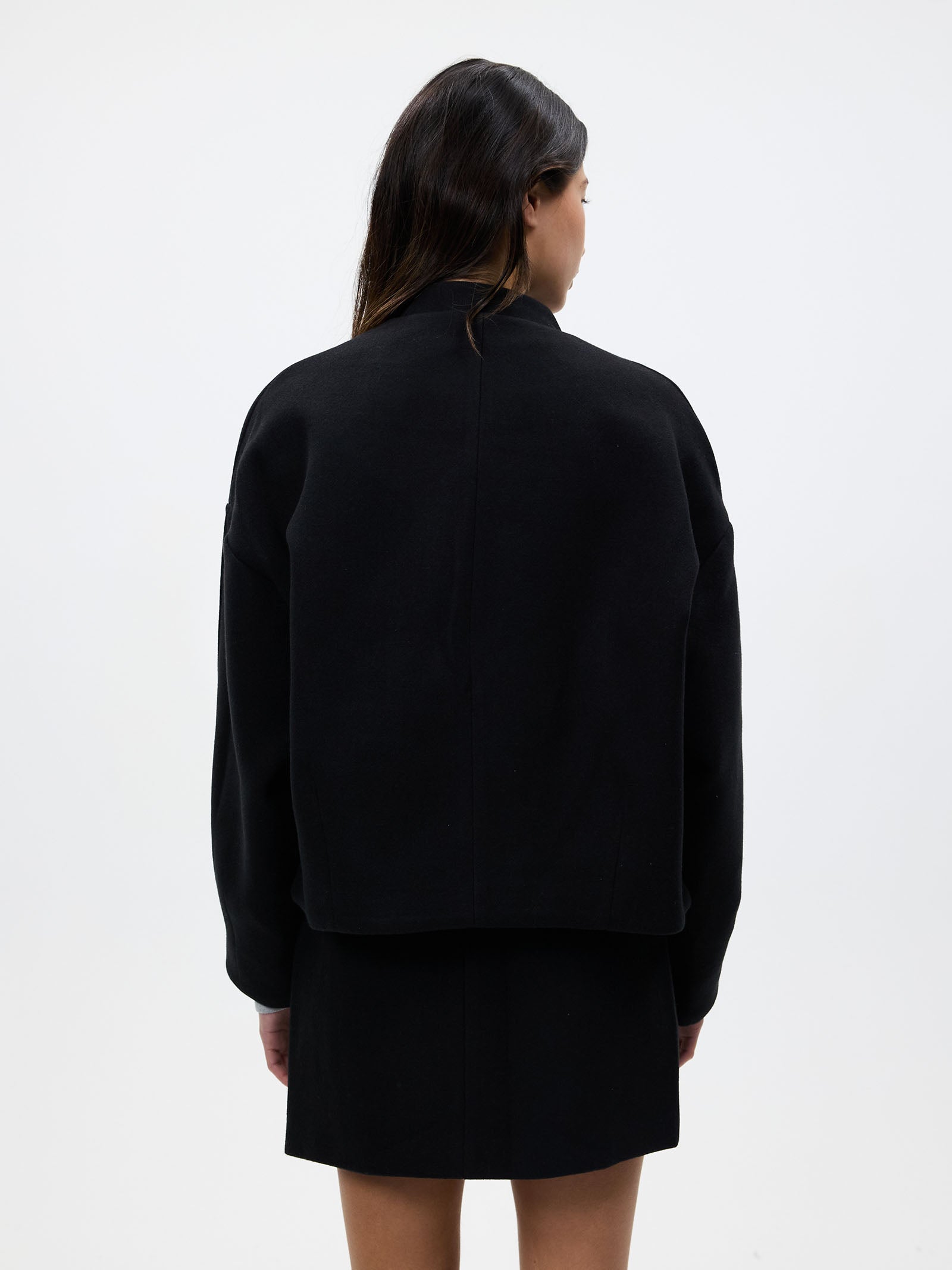 The Cocoon Bomber Jacket in Black by MSE offers an oversized fit with padded construction. This jacket features a button-up and a zip closure with side welt pockets.