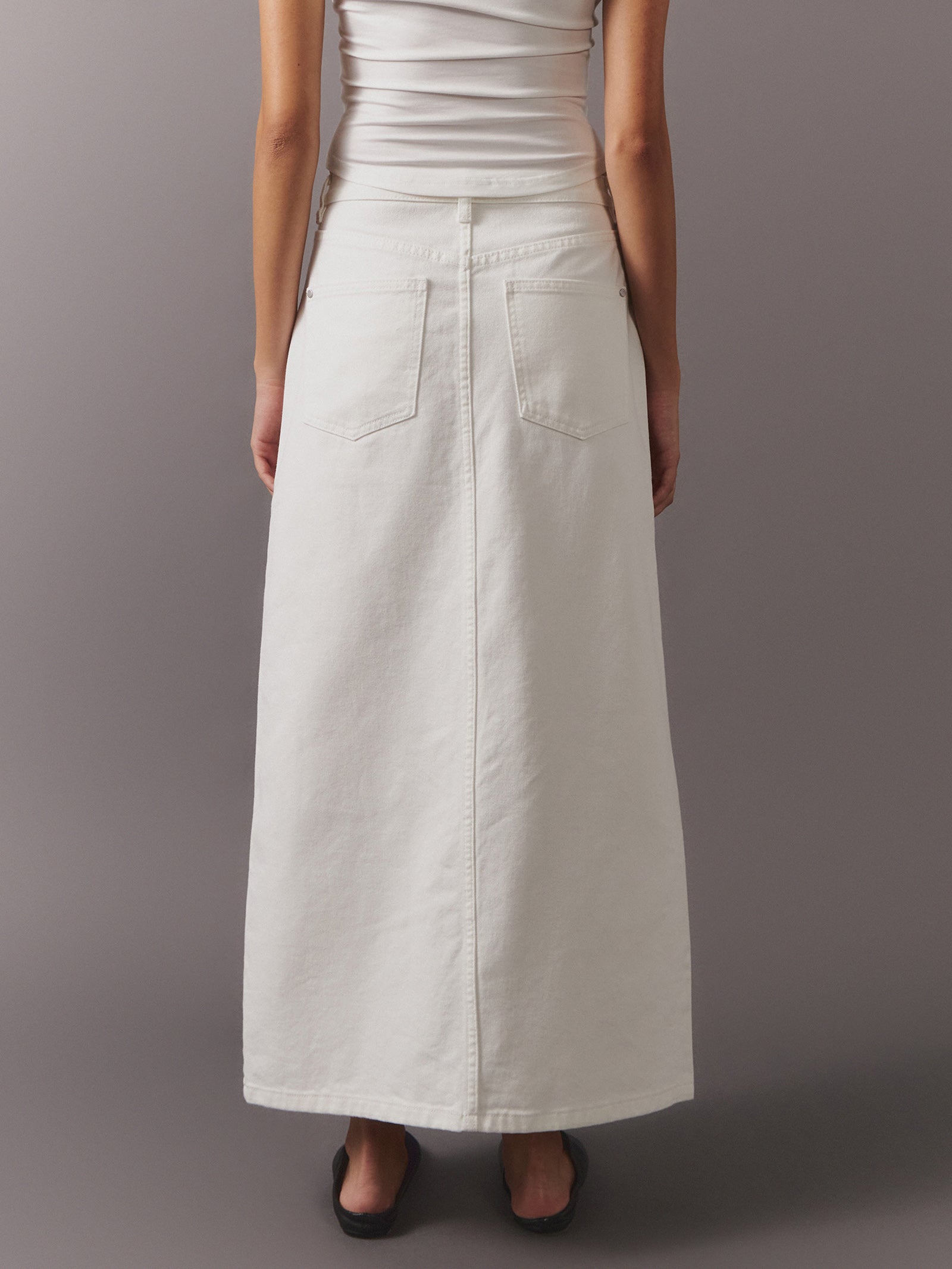 Elevate your everyday wardrobe with the Denim Maxi Skirt by MSE. Designed with a flattering high-waisted silhouette, this skirt features a front slit for ease of movement and a touch of edge. The classic button and zip closure add a timeless finish to this versatile piece. Perfect for pairing with a crisp shirt or a relaxed tank, it’s an effortless blend of style and functionality.