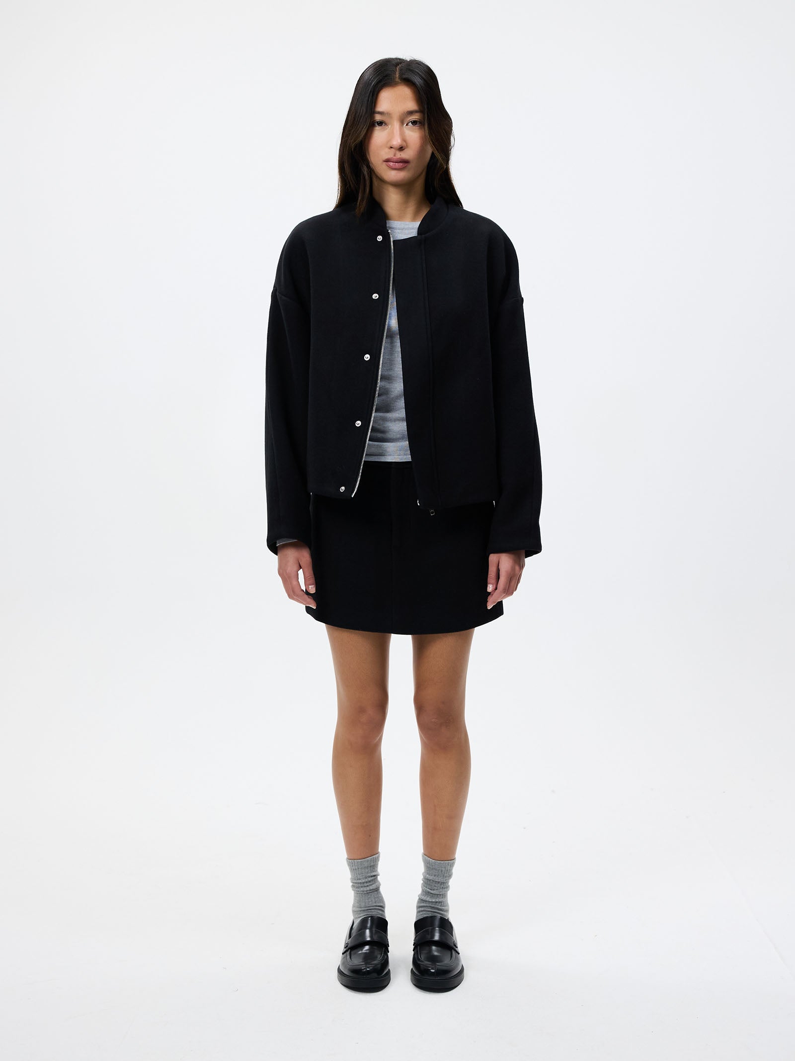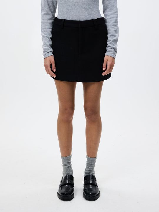 The Fitted Mini Skirt in Black by MSE offers a tailored and clean silhouette. The skirt features a structured waistband with a mid to high rise fit.