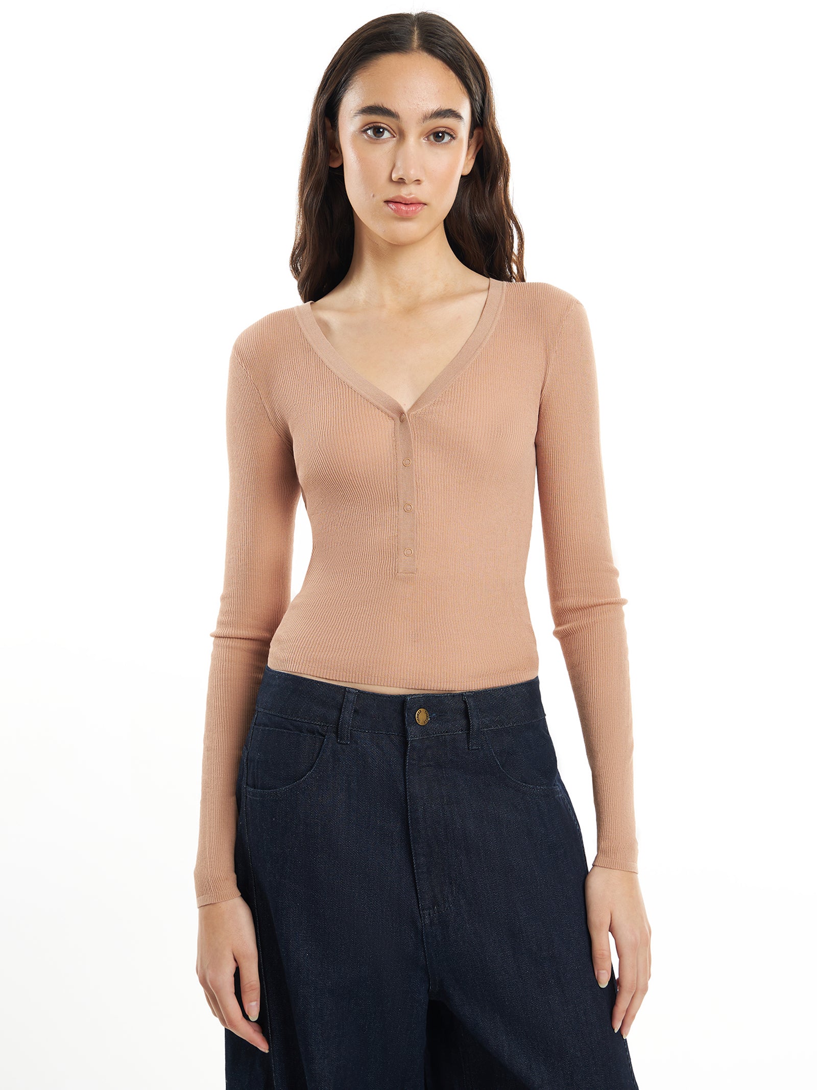 Featuring a deep V-neck and front buttons, this Mse Knit Button Top combines classic details with a modern twist. The snug fit hugs your silhouette, creating a sleek and sophisticated look that’s perfect for any occasion. Whether layered or worn on its own, this top brings a touch of effortless wear to your wardrobe.
