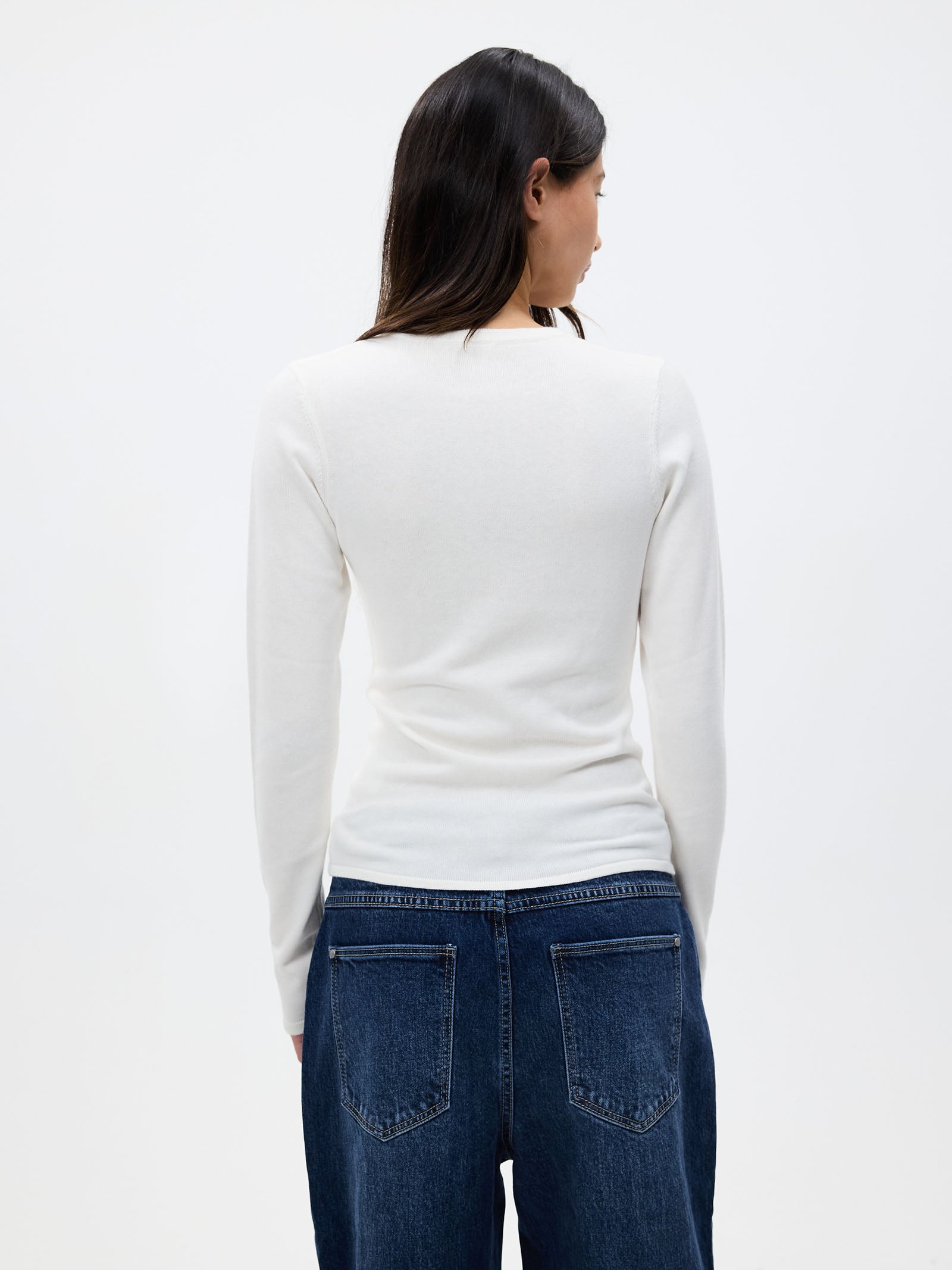 The Long Sleeve Knit Top in Off White by MSE features a crew neckline and straight hem. This top is crafted in a smooth, fine-knit fabric.