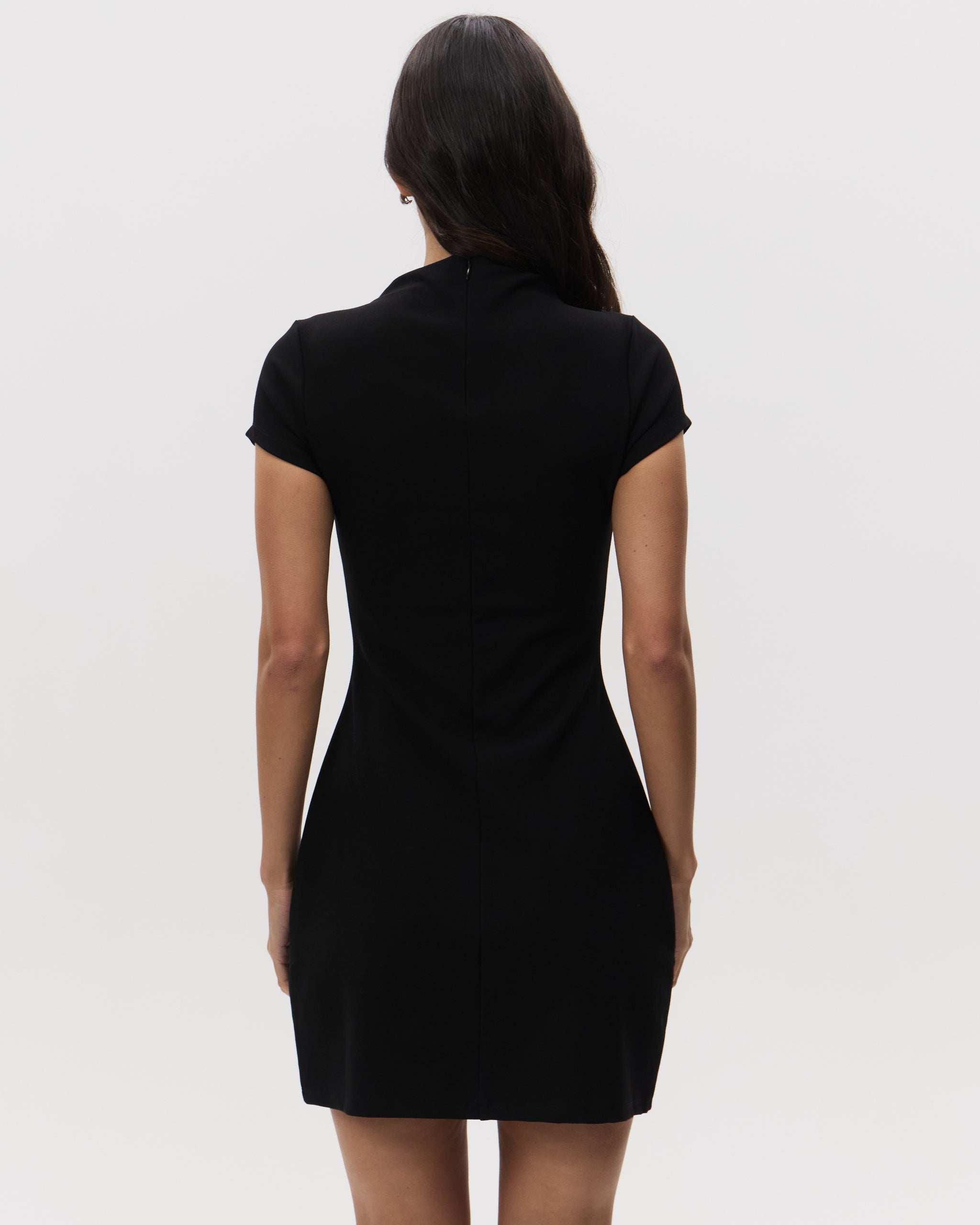 The Mock Neck Mini Dress in Black by MSE features a structured high neckline and cap sleeves in a fitted silhouette.