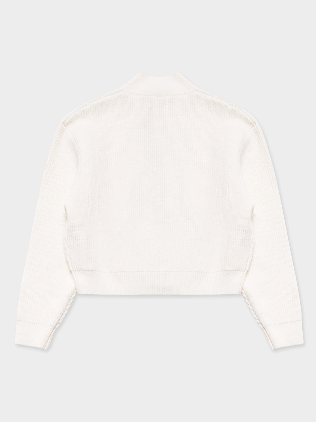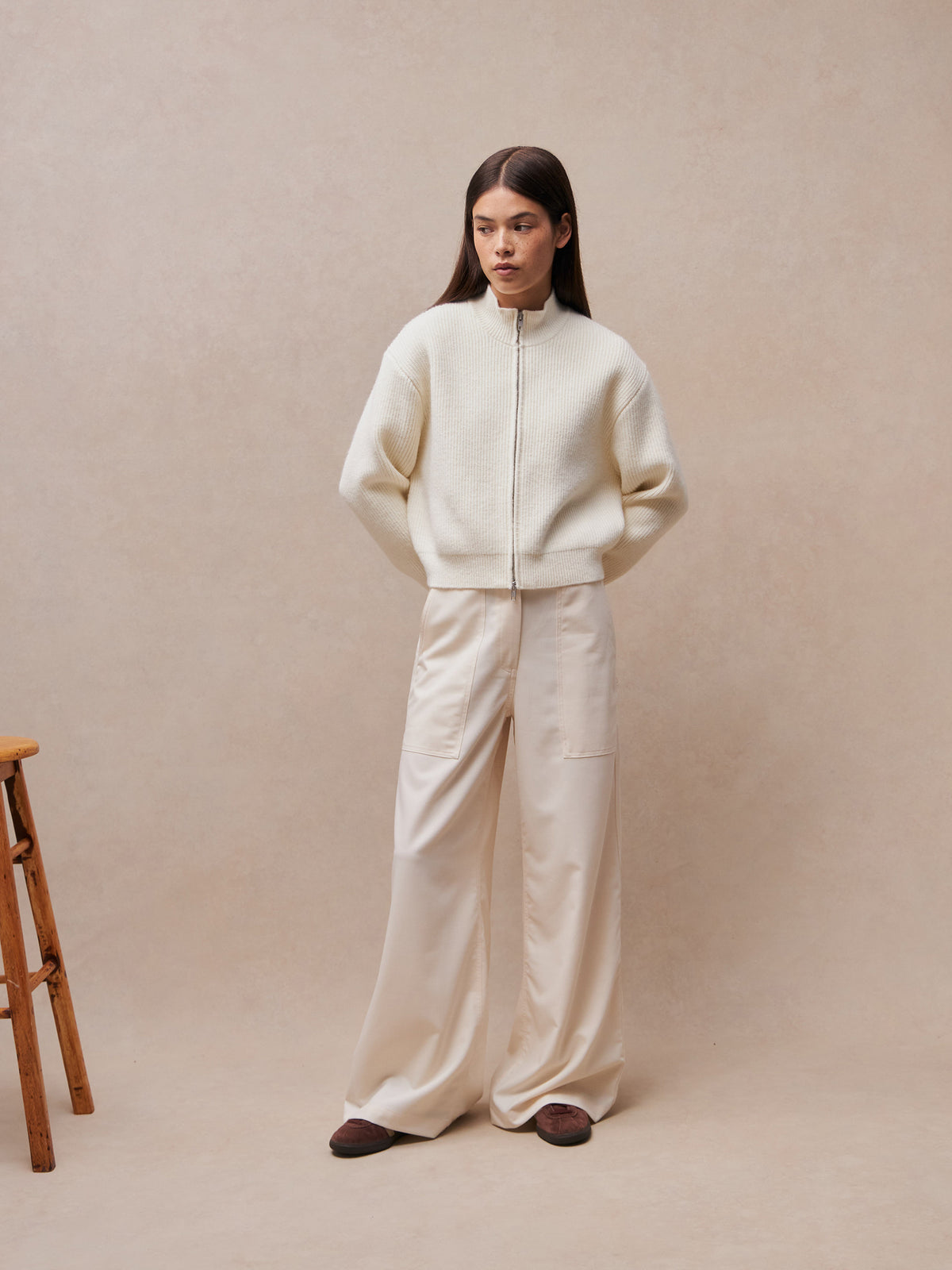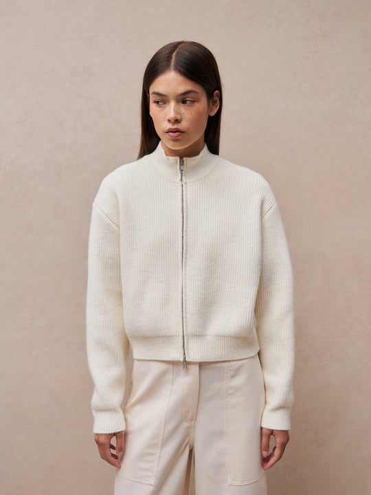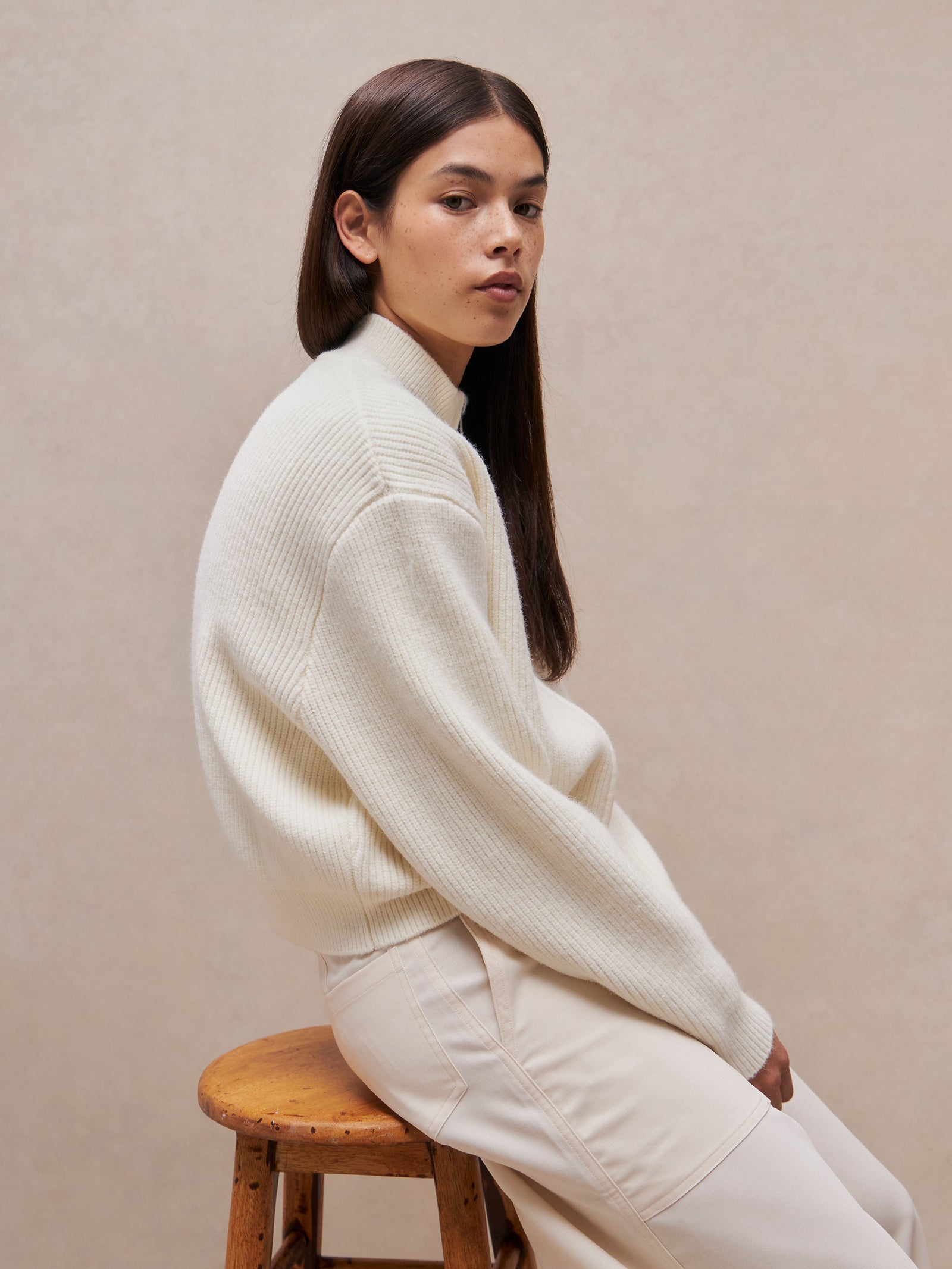 The Relaxed Zip Front Knit in Crema by MSE is crafted from a soft, knitted fabric. This top features a relaxed fit with zip front detail in a warm crema hue.