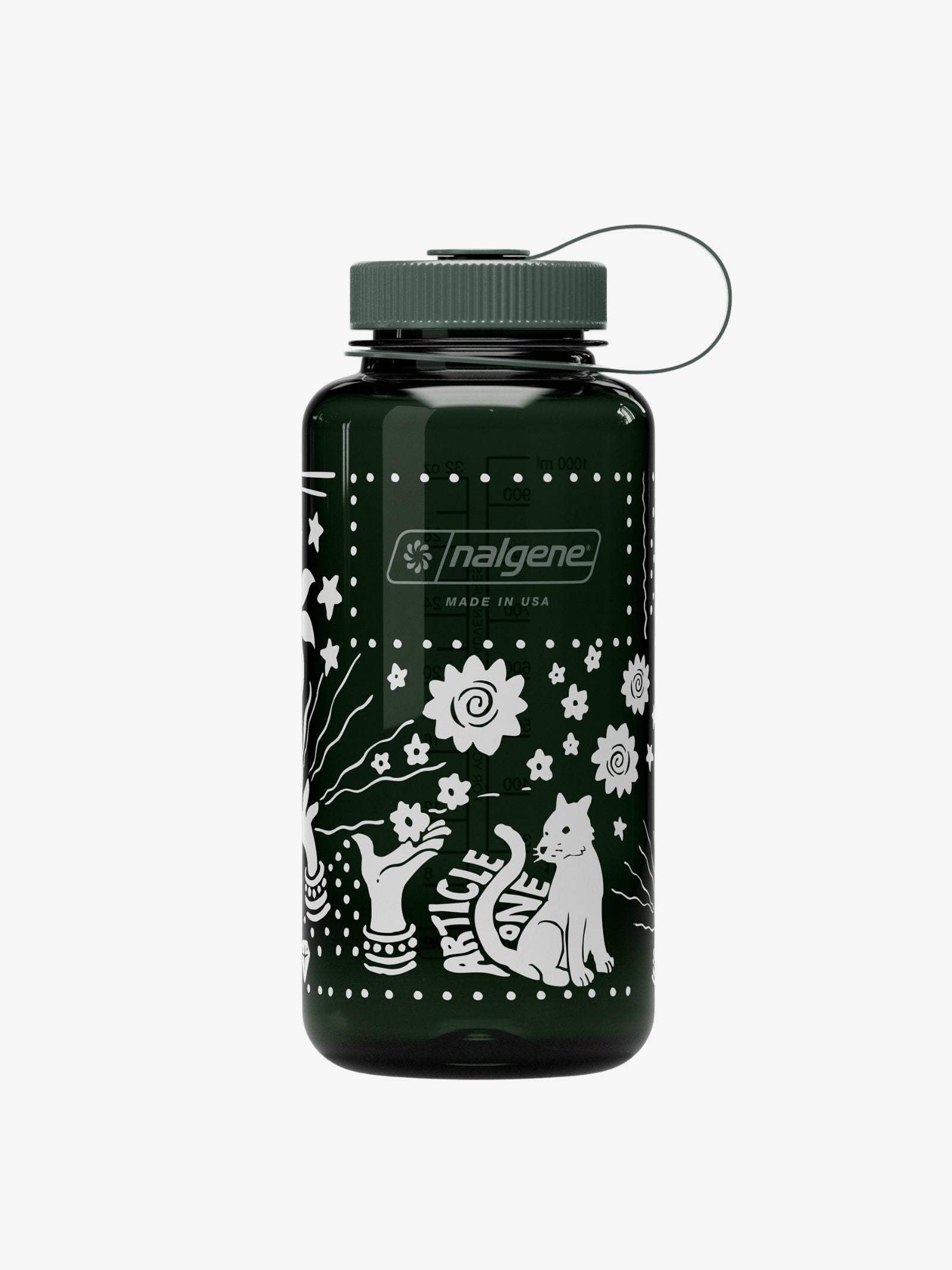 The Sustain Wide Mouth 1L Bottle A1 Gorilla by Nalgene is a high-performance, BPA/BPS-free hydration bottle made in the USA. Constructed using an innovative resin derived from 50% recycled plastic, this durable bottle features a secure, leakproof seal with straight-shouldered semi-buttress threads and a wide mouth for easy cleaning and adding ice. This iteration features a dark green transparent body defined by an intricate all-over white print featuring a seated cat, floral motifs, "ARTICLE ONE" typography, and celestial elements like suns and stars.
