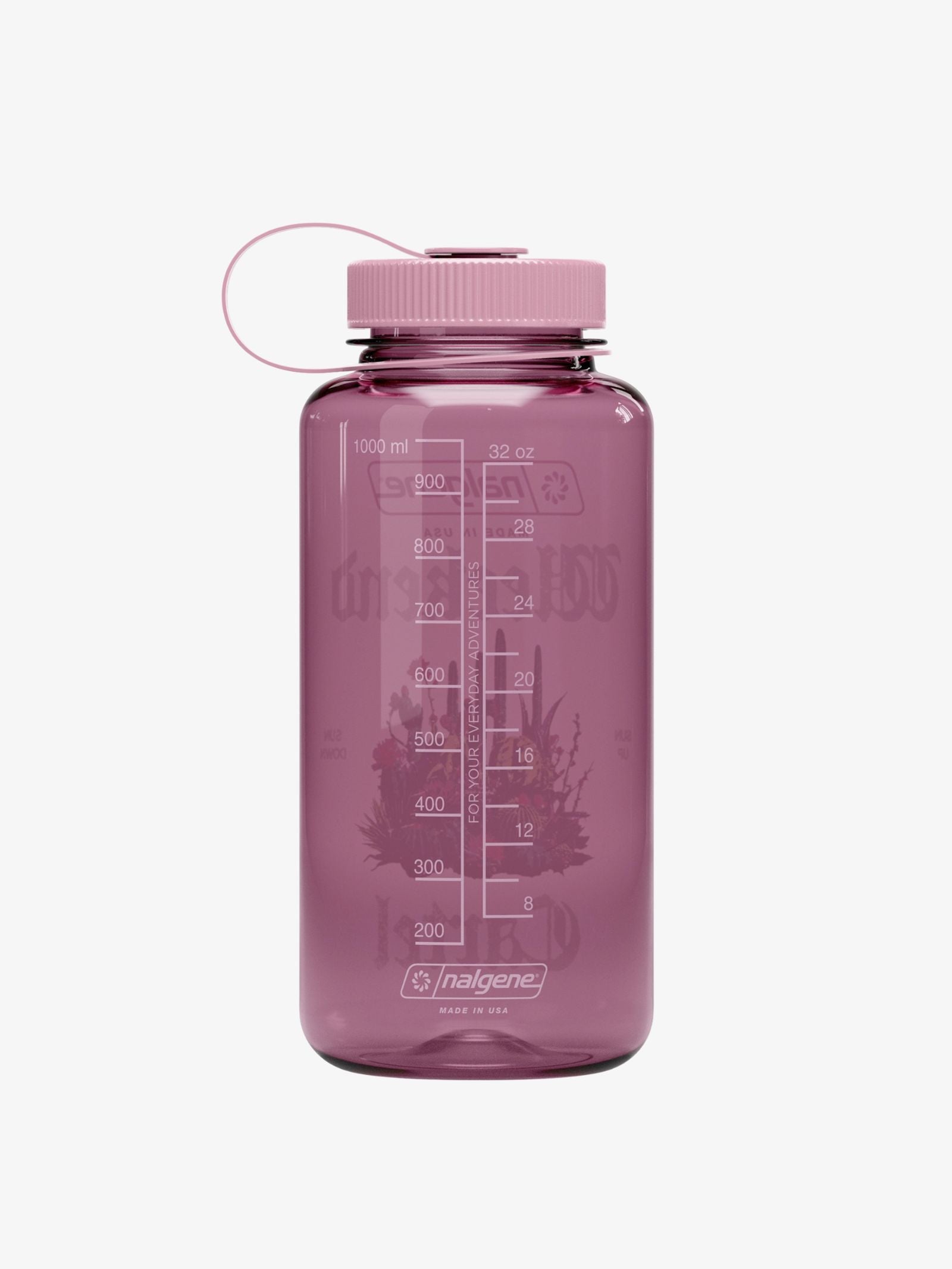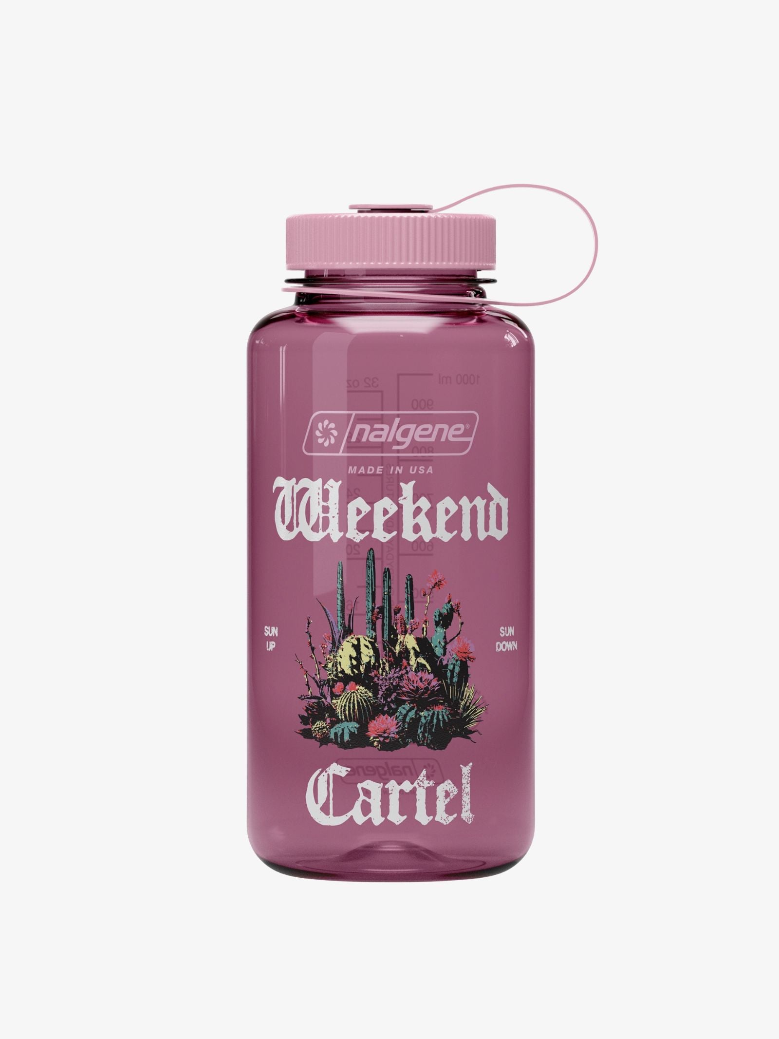 The Sustain Wide Mouth 1L Bottle WC Cactus by Nalgene is a high-performance, BPA/BPS-free hydration bottle made in the USA. Constructed using an innovative resin derived from 50% recycled plastic, this durable bottle features a secure, leakproof seal with straight-shouldered semi-buttress threads and a wide mouth for easy cleaning and adding ice. The front is defined by gothic "Weekend Cartel" typography framing a detailed desert cactus illustration with "SUN UP" and "SUN DOWN" text.