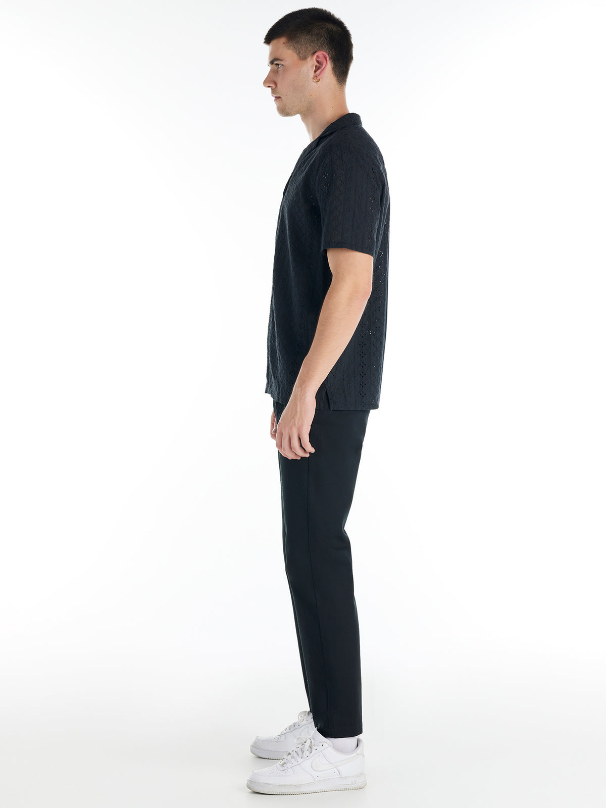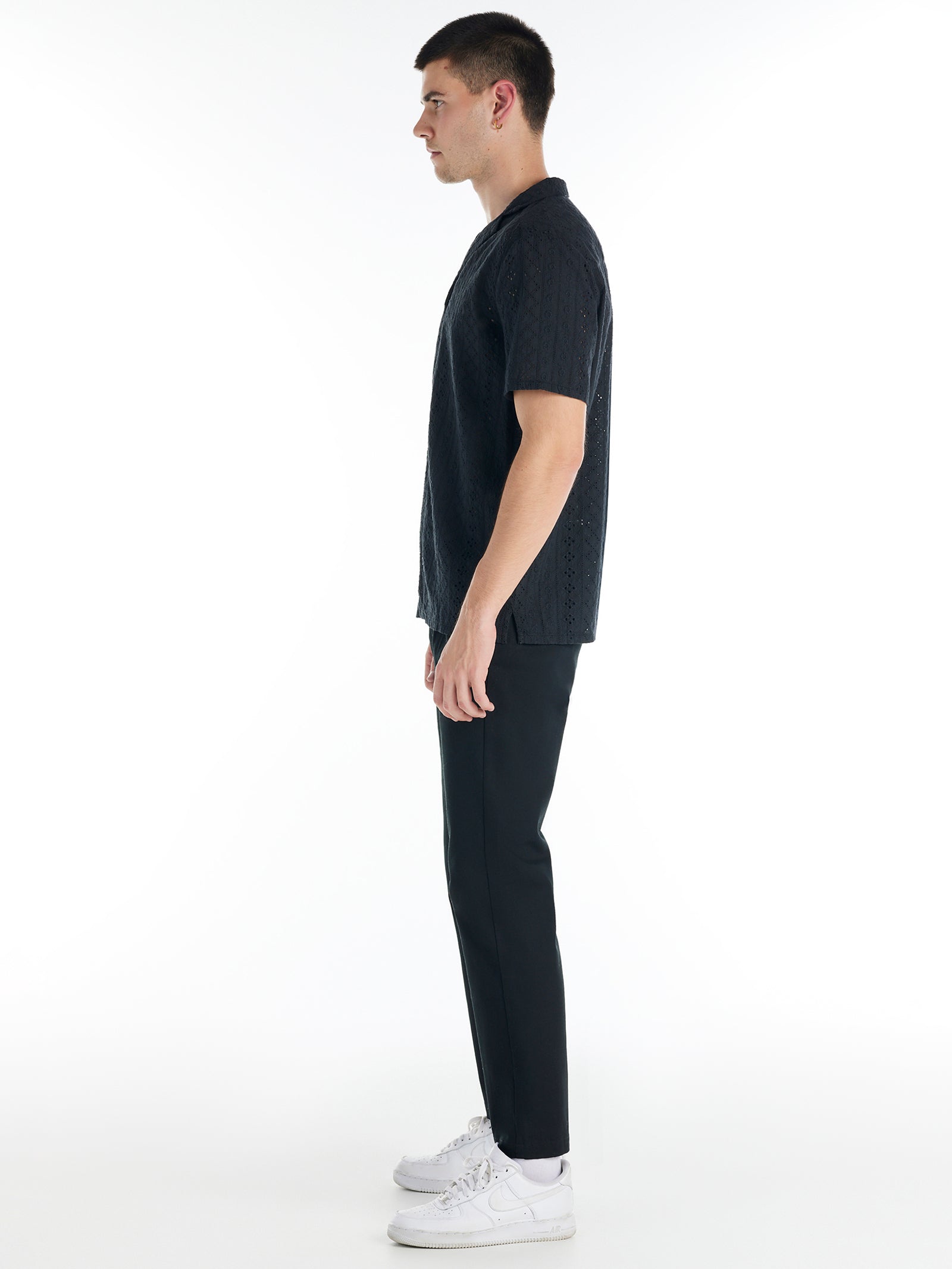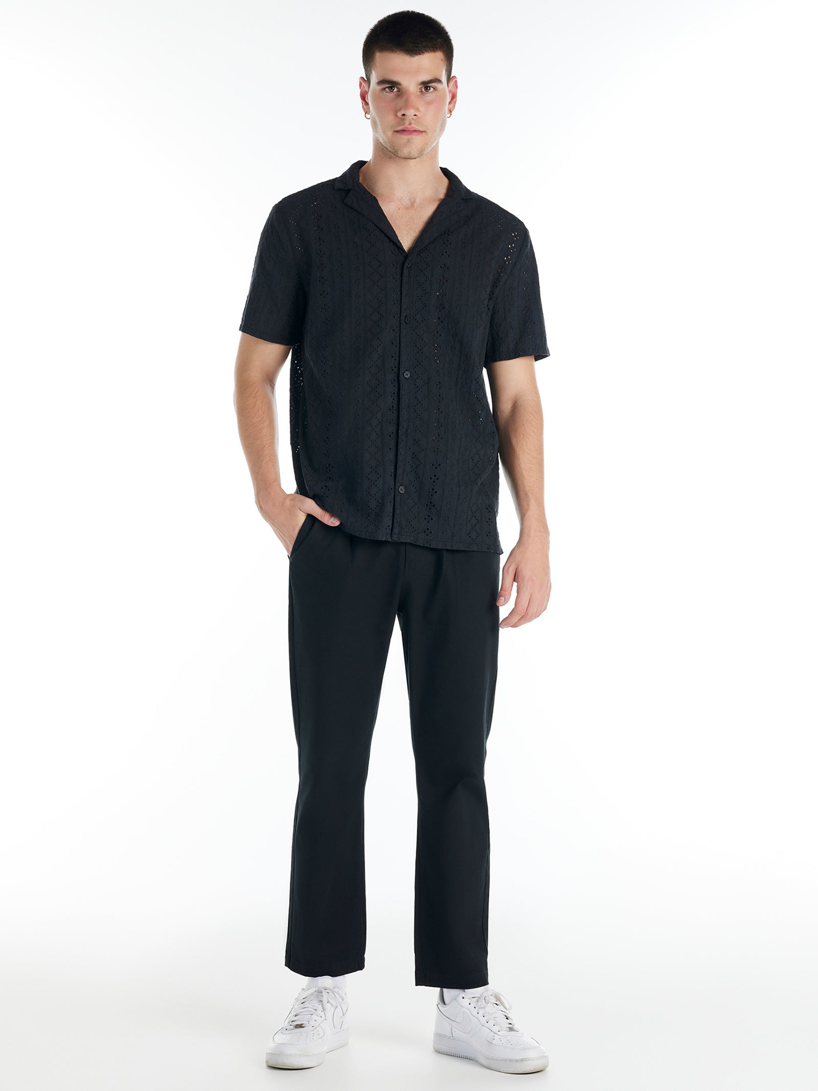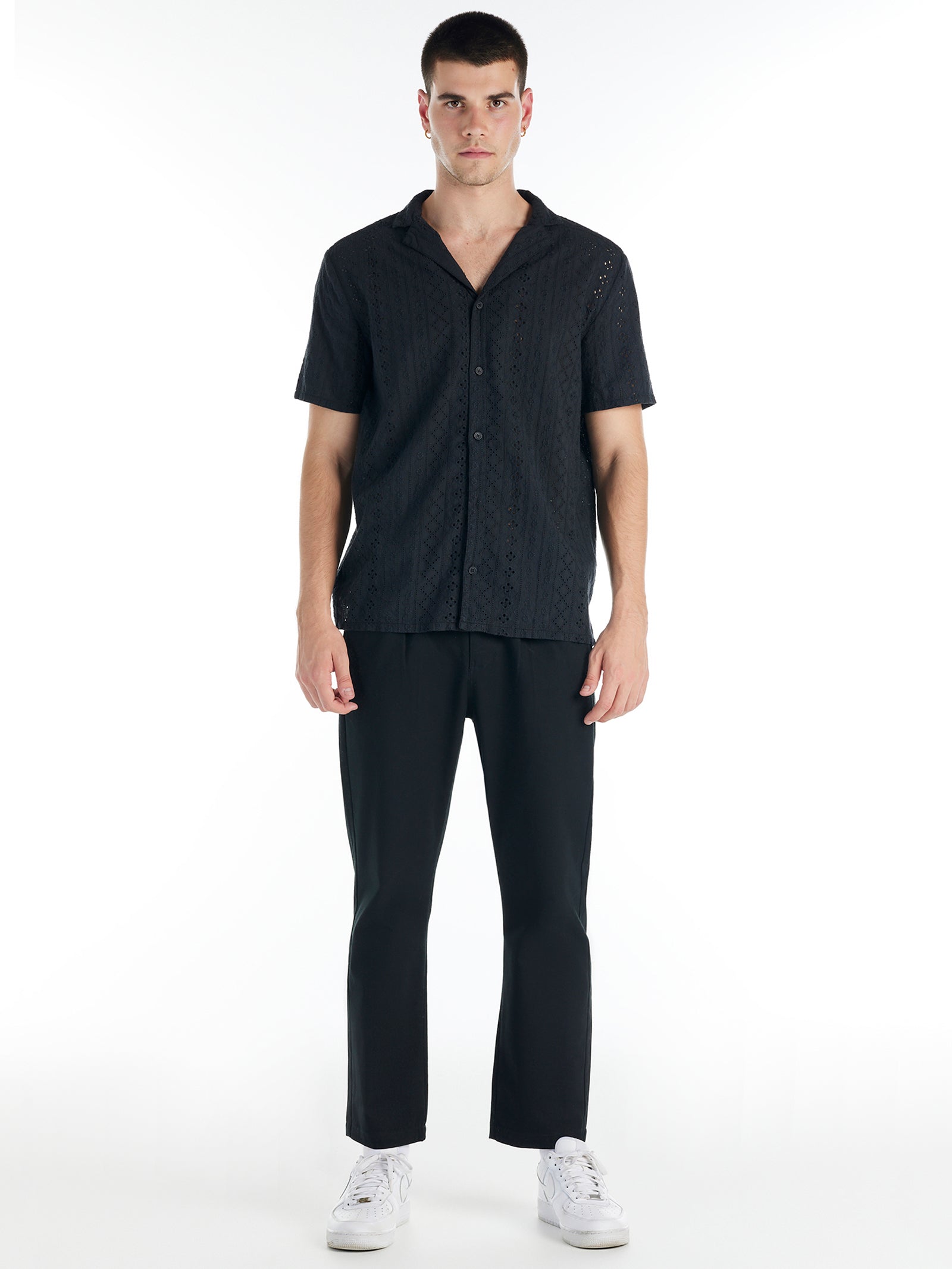The Aspen Shirt offers a perfect blend of style and timeless appeal. Featuring short sleeves and an open capri collar, its silhouette exudes effortless elegance. Crafted from 100% cotton broderie anglaise with an embroidered eyelet pattern, this white button-down shirt transitions seamlessly from day to night.