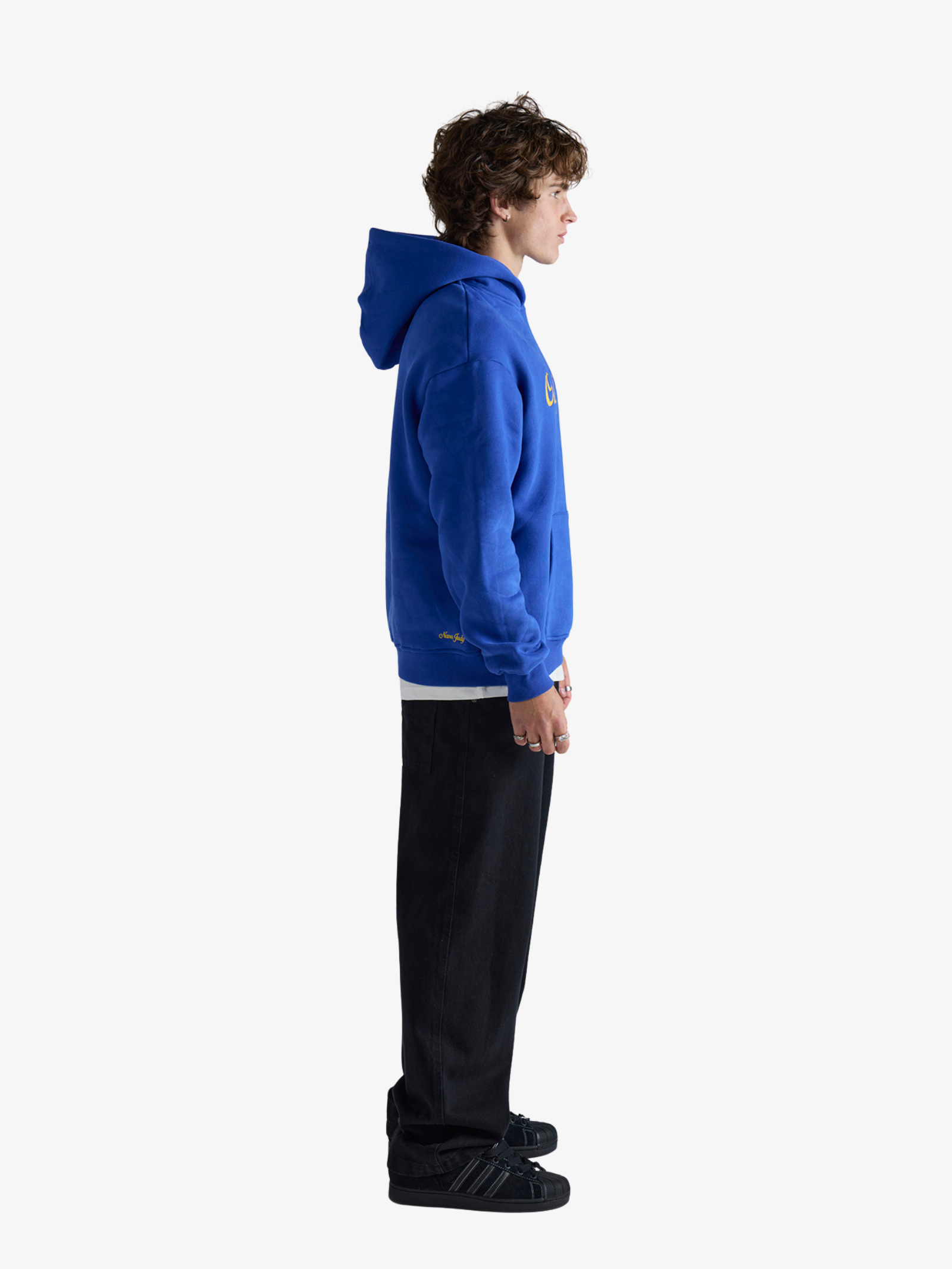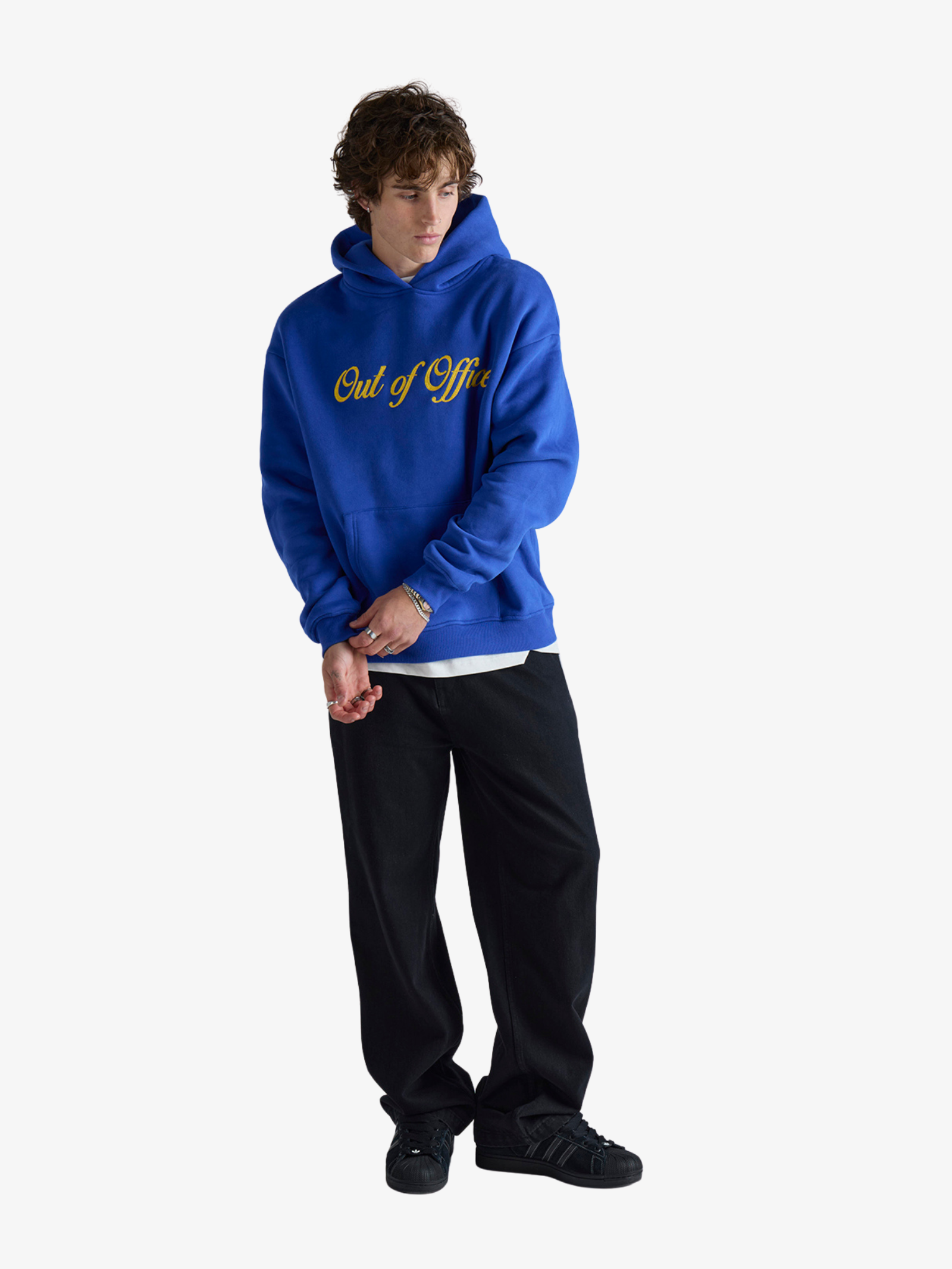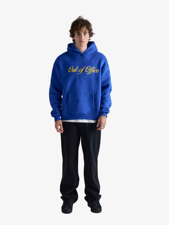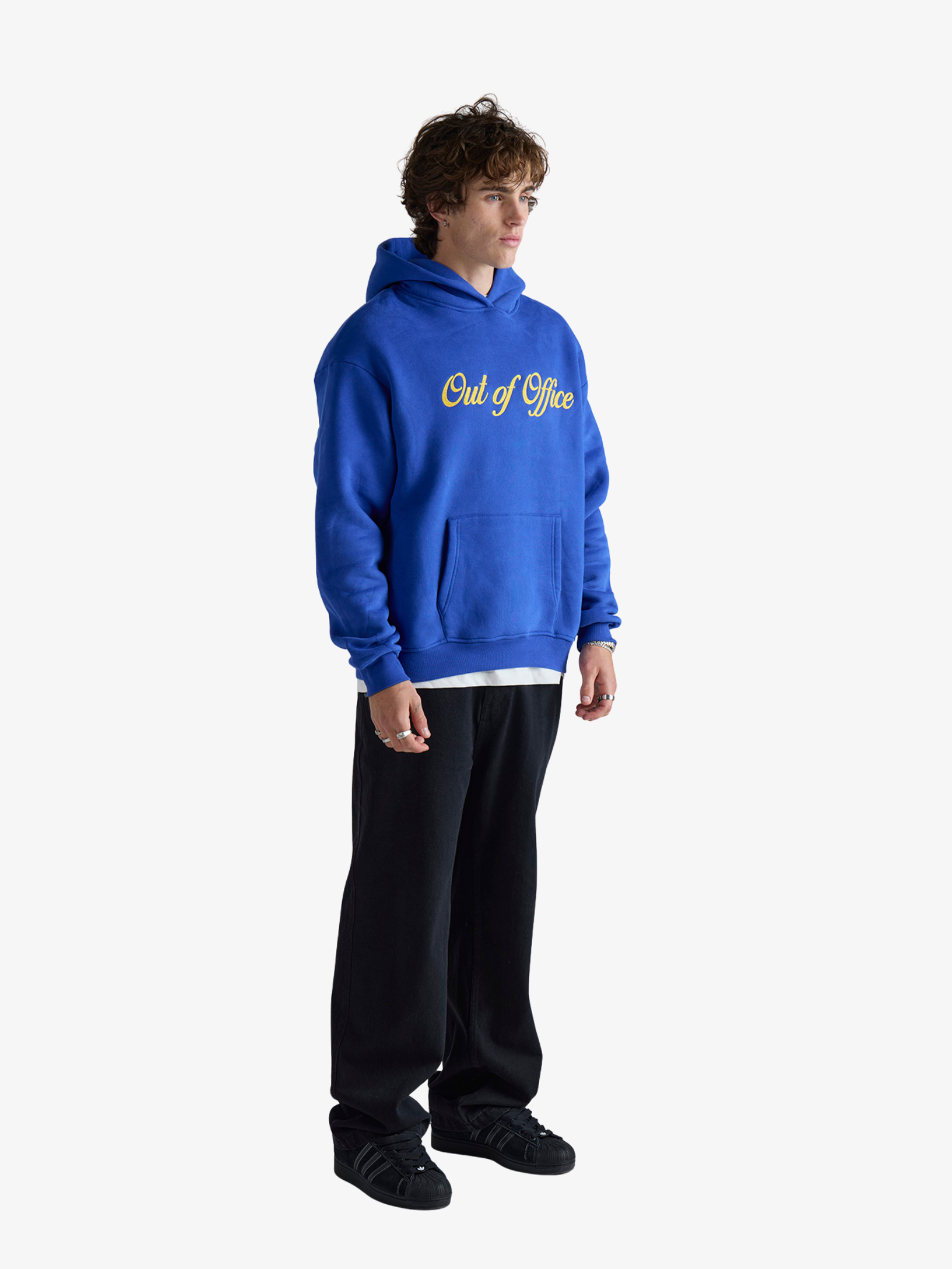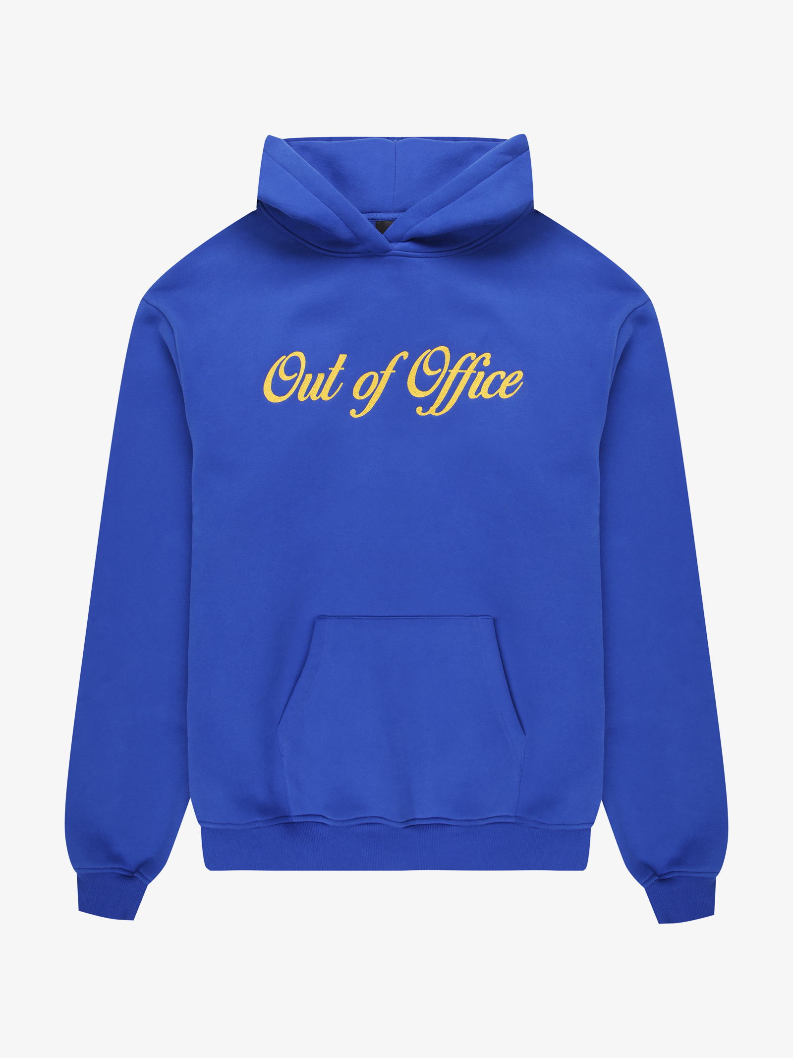 The Louis Hood in Cobalt by Nana Judy is crafted with premium heavy weight 380GSM brushed fleece and features a traditional front pouch pocket, seamless hood design and contrast yellow chain stitch “Out Of Office” expression to the front chest.
