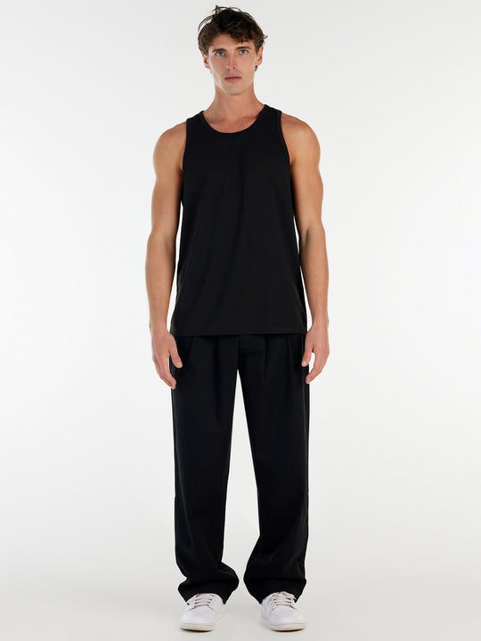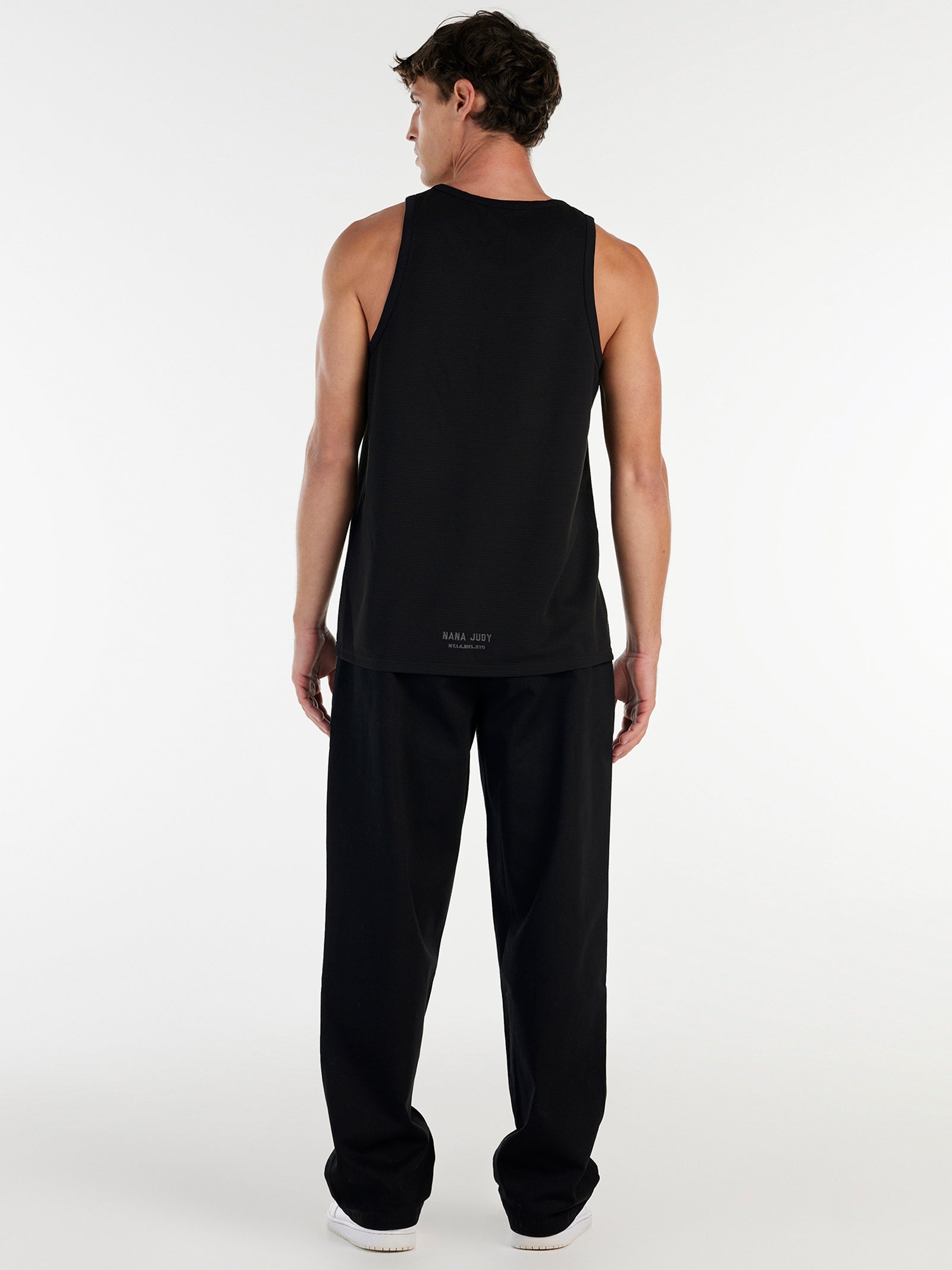 Elevate your look with the Roxford Singlet by Nana Judy. Crafted from a soft-touch fabric with a textured horizontal stripe, this black singlet is a versatile essential for the season. Whether layered under an open shirt or styled solo with our Baggy Drill Trousers, it’s the ultimate piece for effortless, edgy style.