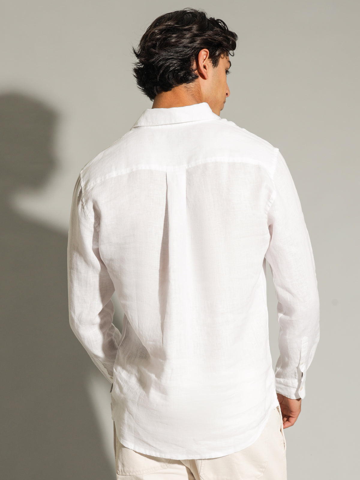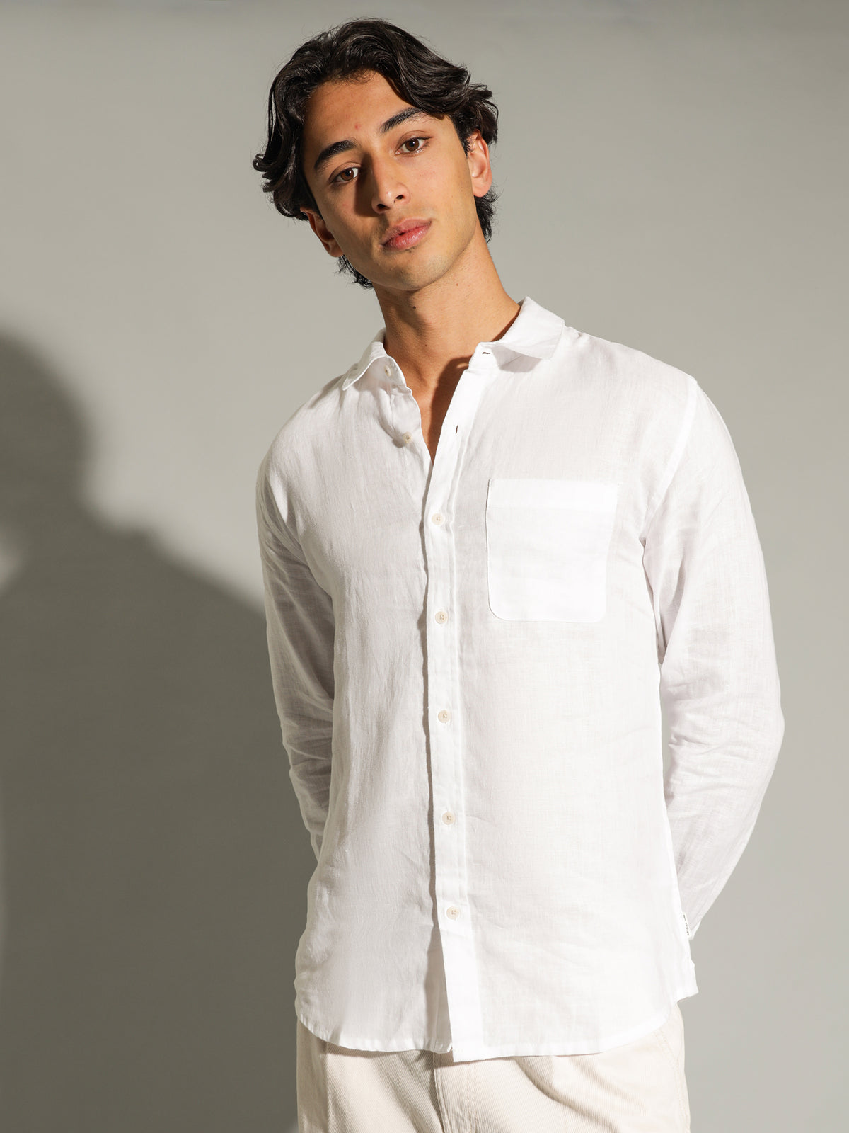 The Nero Linen Long Sleeve Shirt in White by Article One is crafted from 100% linen. This shirt features a regular fit, classic button-up placket, chest pocket, and a scalloped hem.