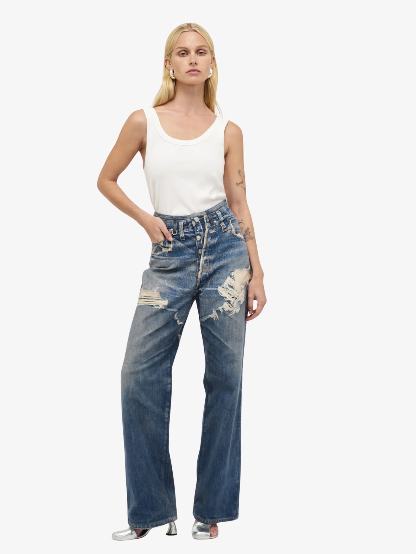 The Coco Relaxed Digital Summer by Neuw is cut with a high-rise and a straight full-length leg for a modern profile. Designed with an open top block, button fly, and five-pocket construction, it includes Neuw’s signature repair stitch and fob ring detailing.