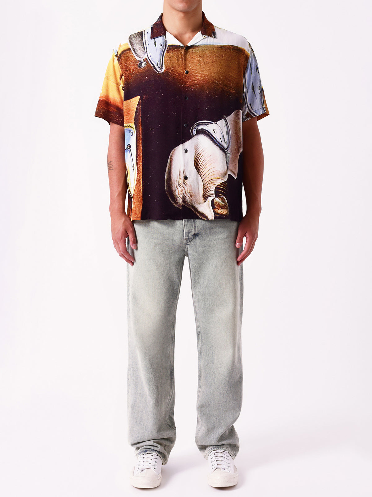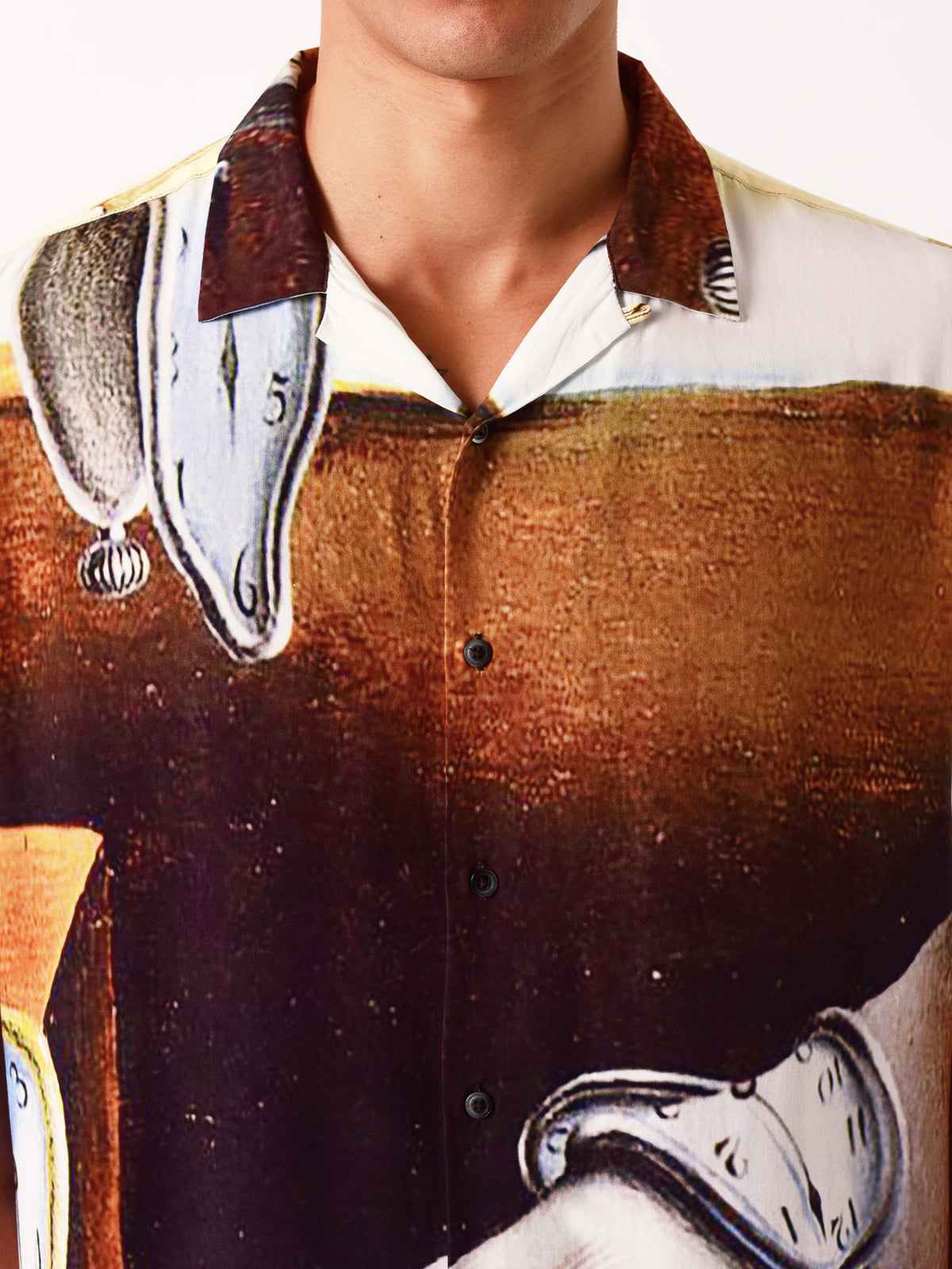 A design inspired by the great works of Salvador Dalí, this shirt features a unique distorted clock graphic, seamlessly integrated into the brown colourway. The classic collar and short sleeves offer a clean, contemporary look, while the full button-up design allows for versatile styling—wear it buttoned up for a refined appearance or down for a more laid-back feel. Neuw, known for its commitment to high-quality and forward-thinking fashion, presents this shirt as a perfect blend of artistic flair and modern elegance.