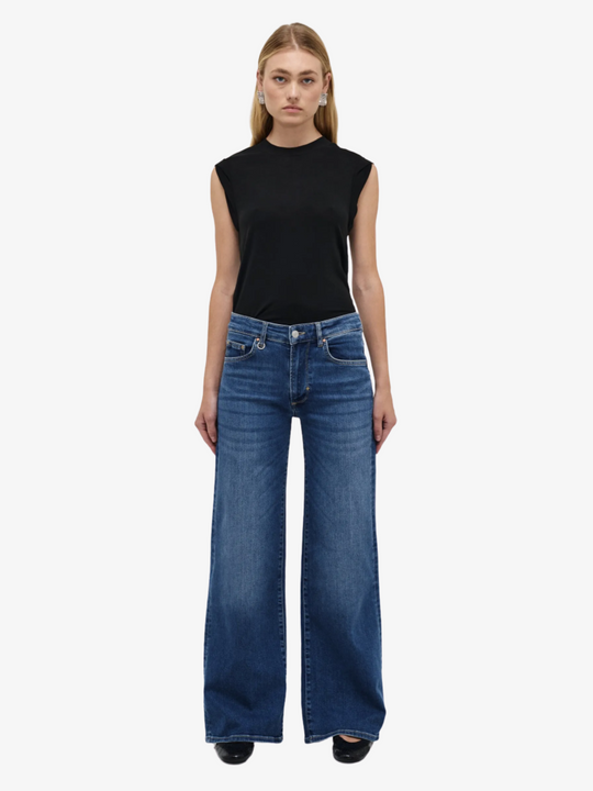 The Eva Wide Jean in Indigo by Neuw is crafted from a premium comfort-stretch denim blend. These jeans feature a fitted mid-rise waist that elegantly skims the hips, transitioning into a tailored A-line wide-leg silhouette