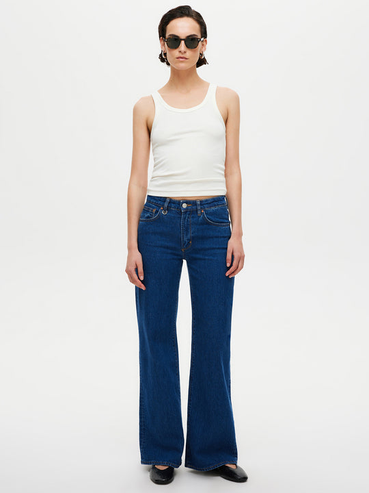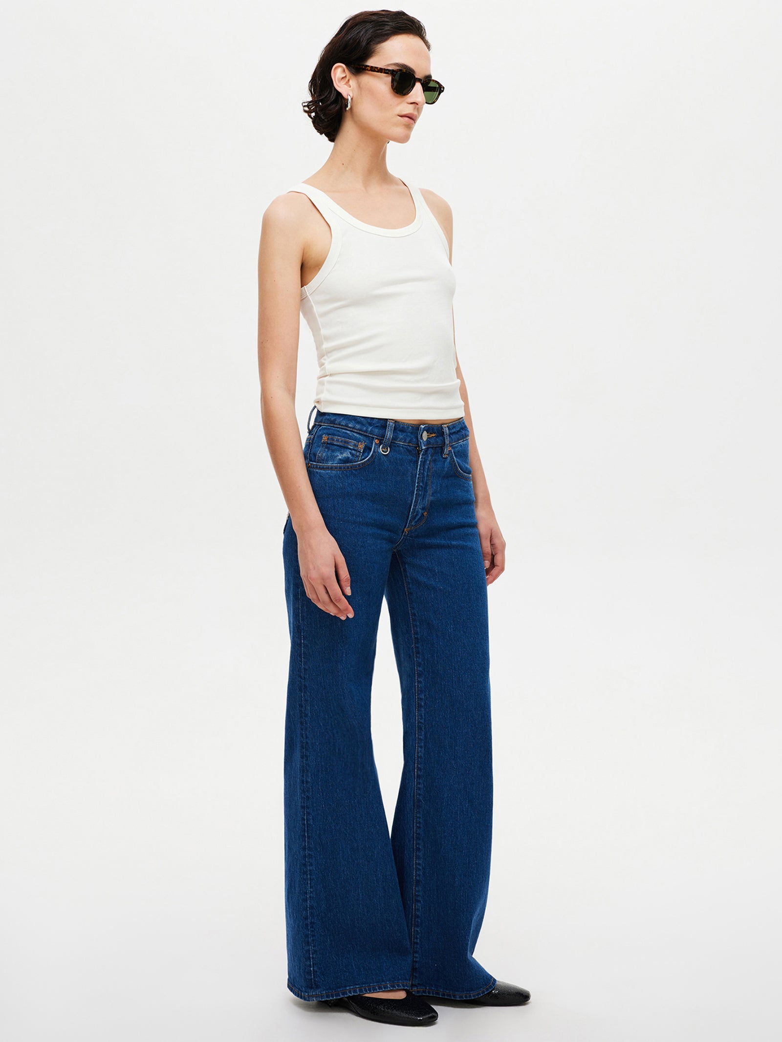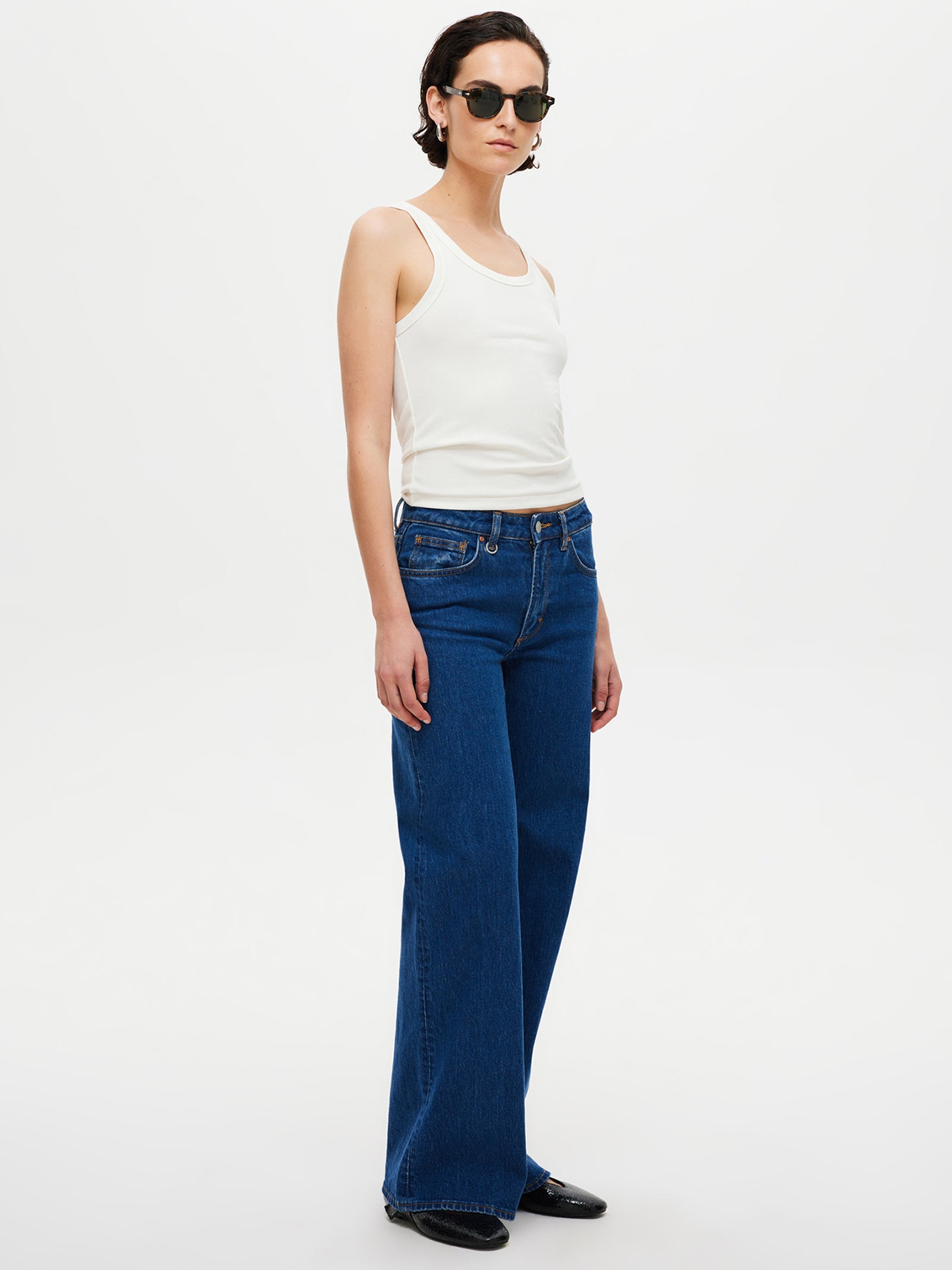 The Eva Wide Gala jeans are crafted from organic cotton in a Mid Indigo wash. These jeans offer a timeless appeal with a modern twist. The mid-rise fit ensures a flattering silhouette, perfect for everyday or to go for slightly more sophisticated look. Embrace the versatility of these jeans, whether paired with sneakers or heels.