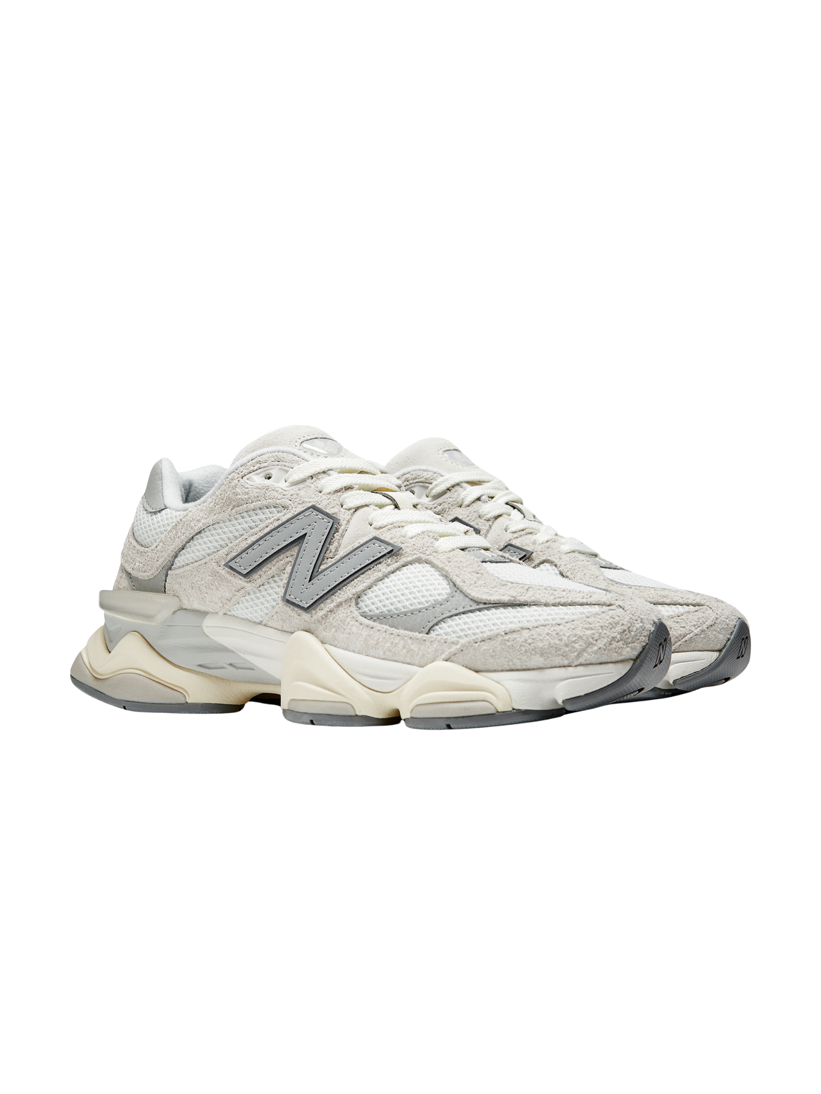 The 9060 Sneaker in Light Beige by New Balance is designed with a dual-density midsole combining ABZORB and SBS cushioning. This sneaker features a tongue logo, translucent CR heel and a diamond-patterned outsole.