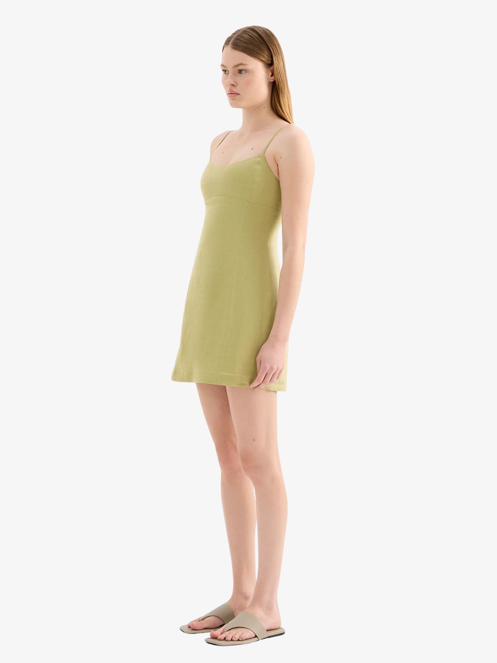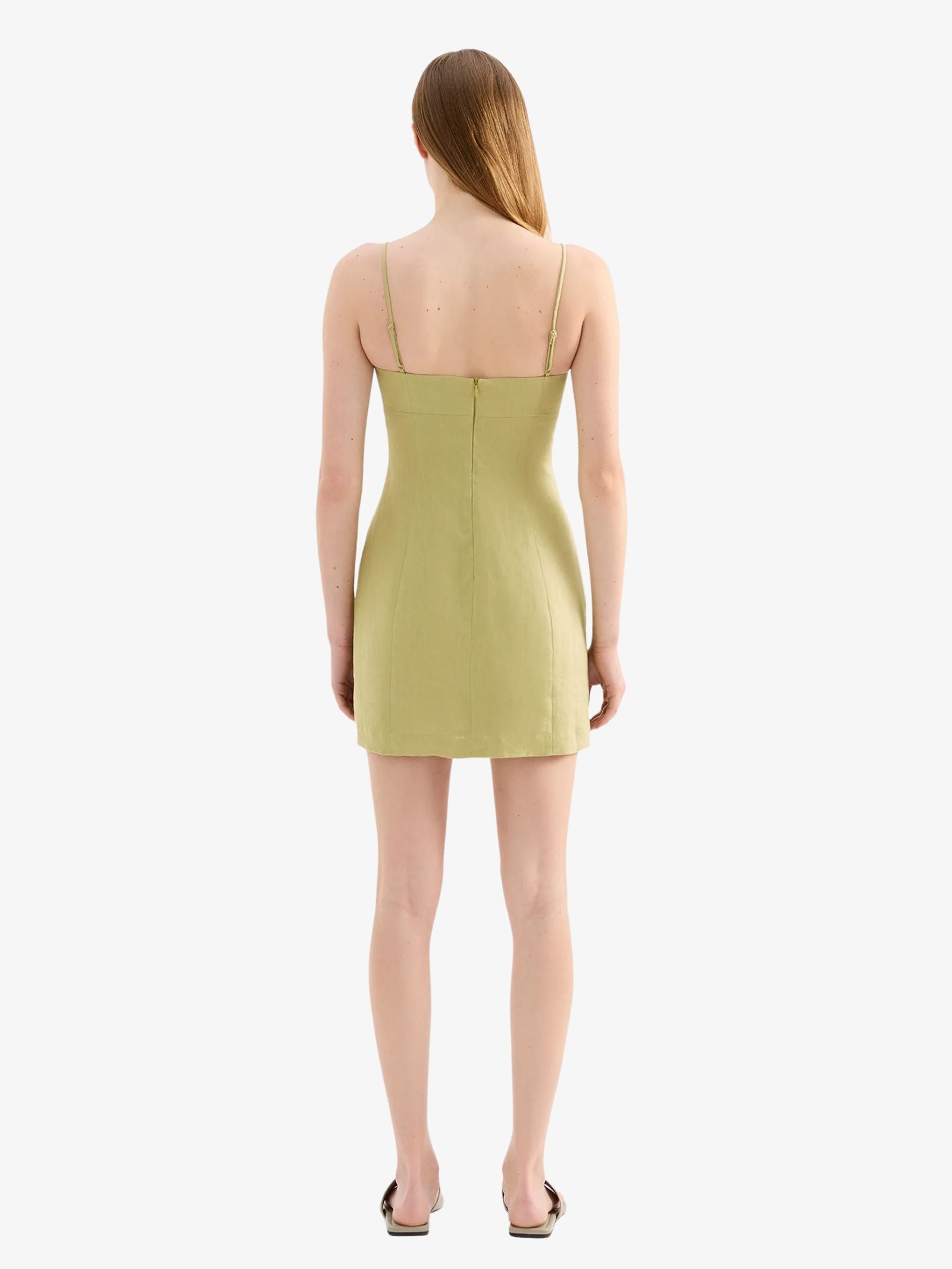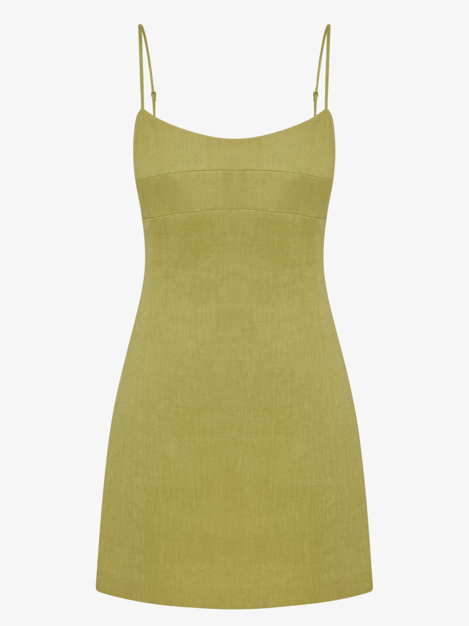 The Carmela Linen Mini Dress by Nude Lucy is made from breathable linen with a soft hand feel. Designed in a slim fit silhouette with an A-line mini skirt, it features thin adjustable straps, a soft scooped neckline, bust paneling, and an invisible back zipper. The dress is fully lined for comfort and coverage.