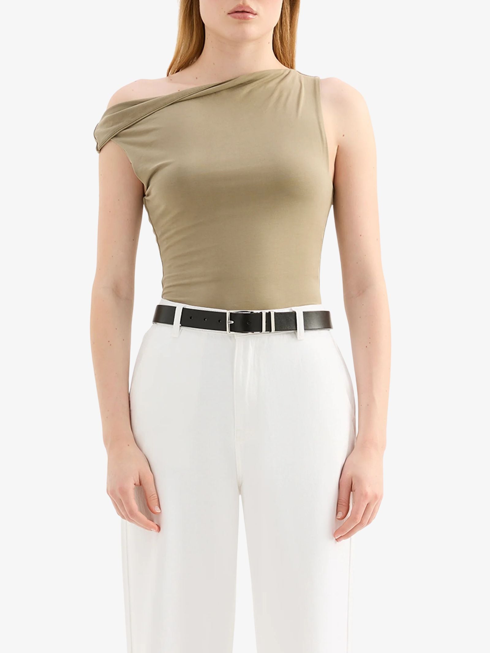 The Chelsea Top by Nude Lucy is crafted from a midweight stretch modal with a soft, fluid feel against the skin. Designed with a figure-hugging silhouette, it sits neatly at the hips and creates a clean, modern shape. An asymmetric neckline adds edge, finished with a subtle off-shoulder twist that elevates the look without feeling overworked.