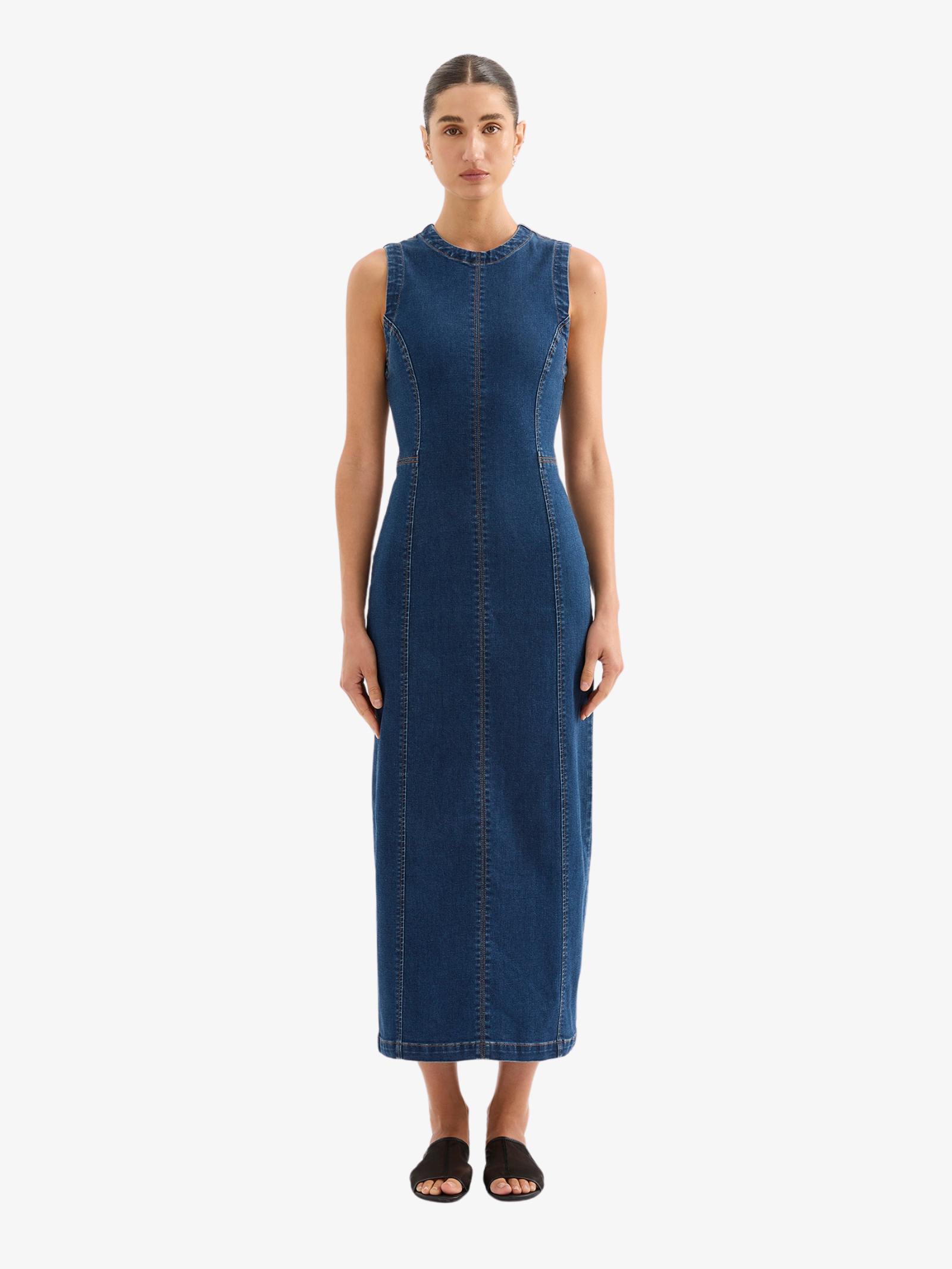 The Nude Lucy Ida Denim Maxi Dress in Force Blue exemplifies modern sophistication, aligning seamlessly with Glue Store's contemporary aesthetic and Nude Lucy's commitment to timeless design. Crafted from a soft organic cotton blend with slight stretch, this dress offers a comfortable, form-fitting silhouette that gracefully falls above the ankles. The crew neckline and panelled construction provide a refined structure, while the back zipper and vent add functional elegance.