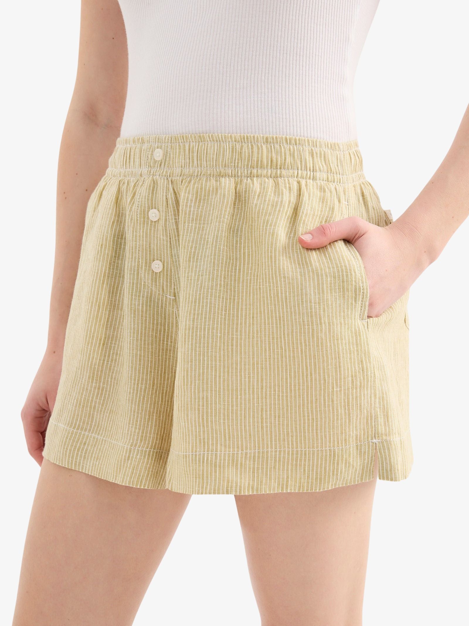 The Lounge Stripe Linen Short by Nude Lucy offers a relaxed, wide-leg silhouette for effortless summer style. Designed with an elasticated waistband, mock button front, and functional pockets, it pairs perfectly with a Nude Lounge top for a coordinated look.