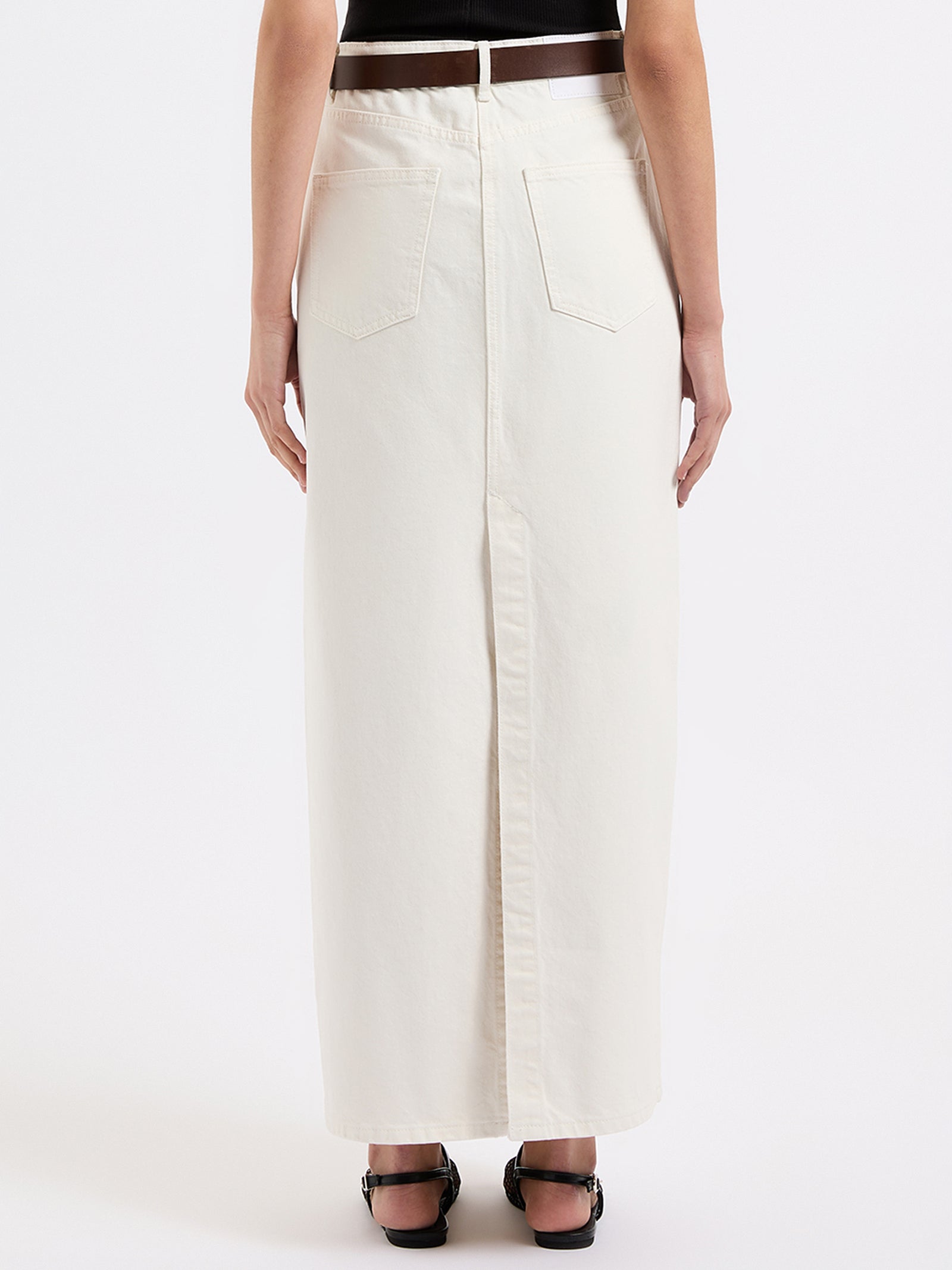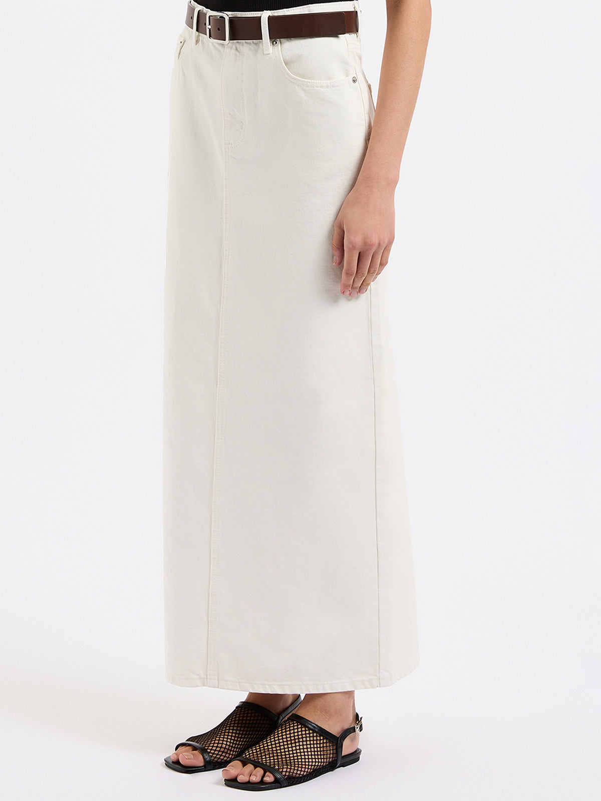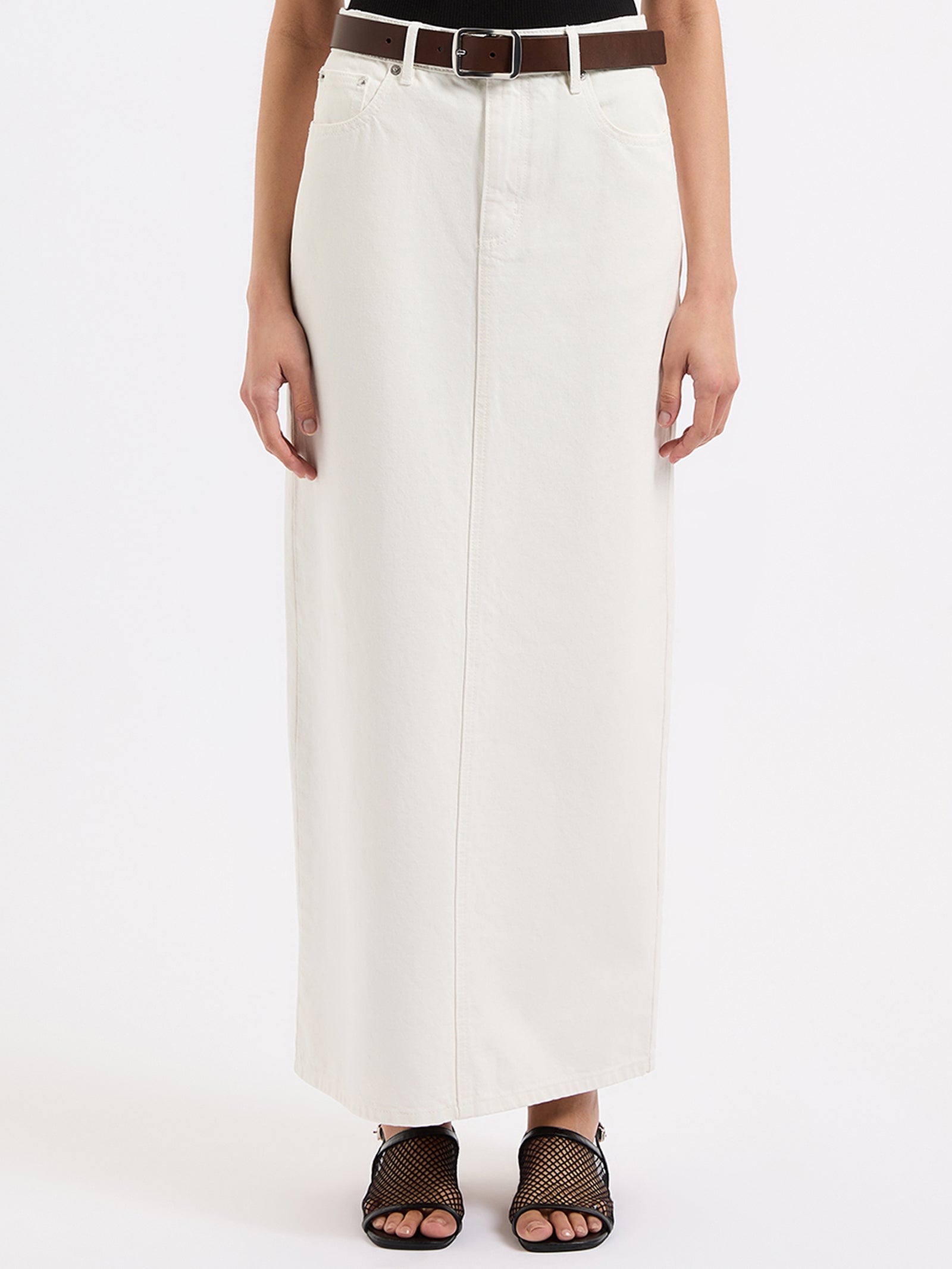 The Organic Denim Maxi Skirt is crafted from 100% organic cotton denim. It features a mid to high rise, straight silhouette that ends just above the ankles. Details include a branded shank button, rivets, and a back patch. The skirt fits true to size, though sizing up will provide a more relaxed fit. Nude Lucy denim undergoes a detailed stone wash process, which may cause slight variations in color.