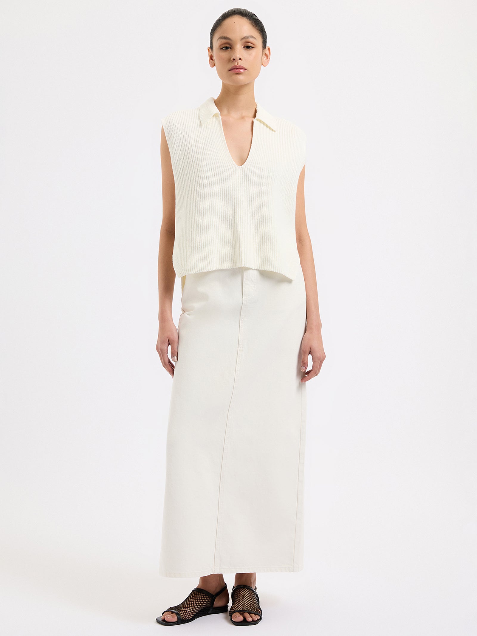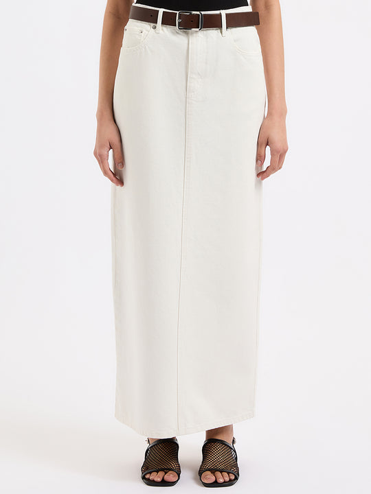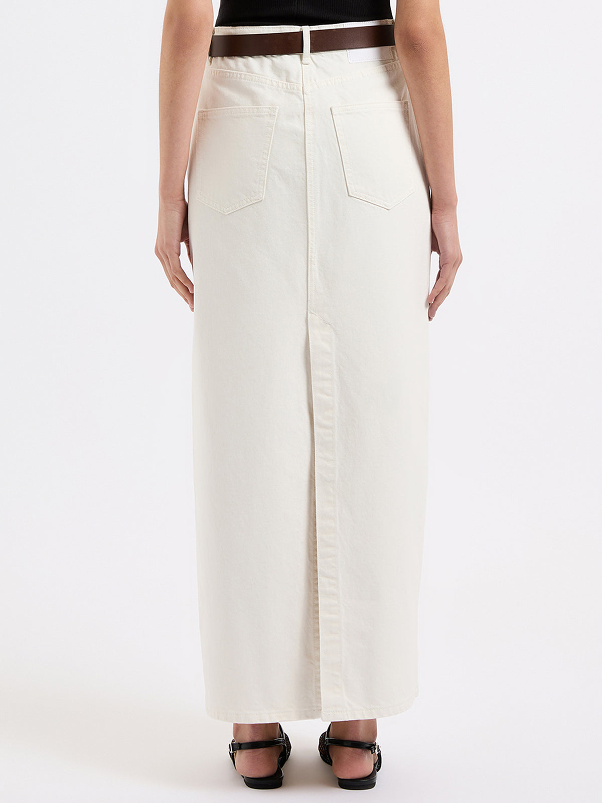 The Organic Denim Maxi Skirt is crafted from 100% organic cotton denim. It features a mid to high rise, straight silhouette that ends just above the ankles. Details include a branded shank button, rivets, and a back patch. The skirt fits true to size, though sizing up will provide a more relaxed fit. Nude Lucy denim undergoes a detailed stone wash process, which may cause slight variations in color.