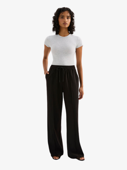 The Quincy Pant by Nude Lucy features a relaxed silhouette with a wide full length leg. This pant offers an elasticated waistband with an external draw cord, a pin stitch detailing along the centre of the legs, and convenient side seam pockets.