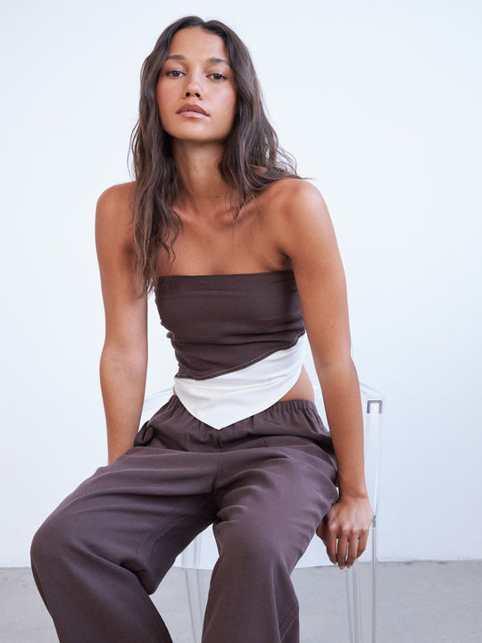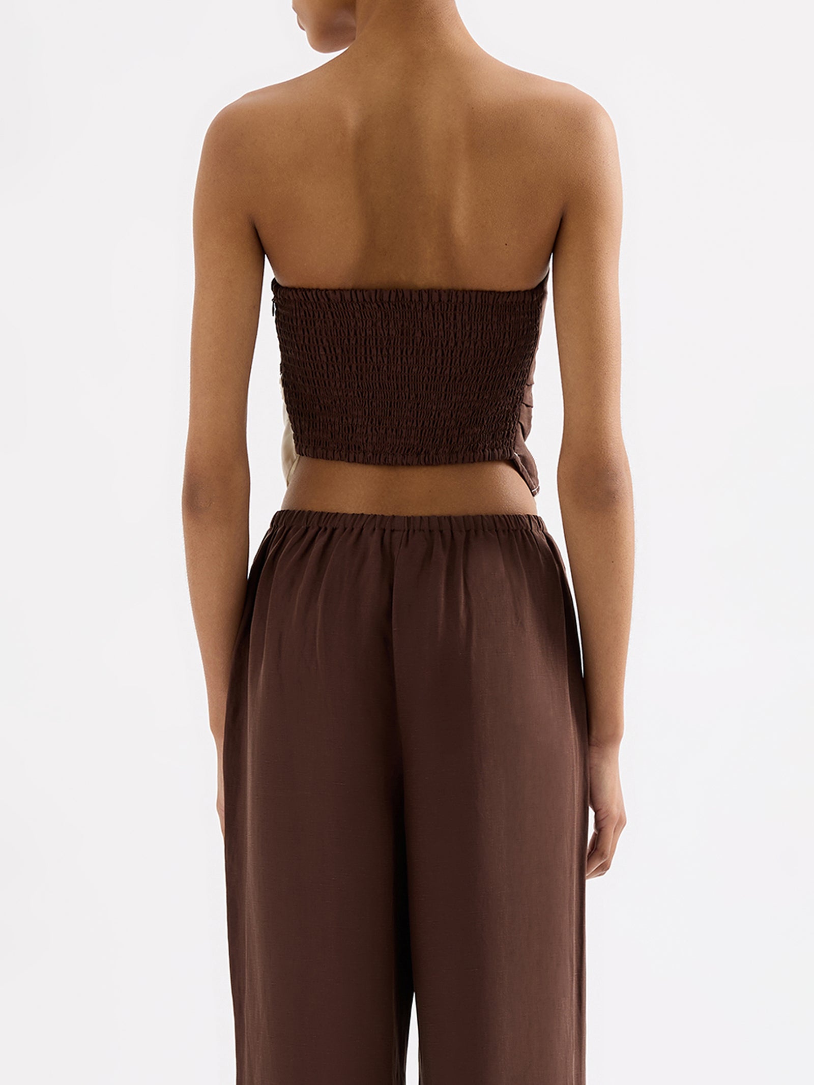 The Serafin Bodice is crafted from a Tencel blend, offering a smooth, soft touch. This strapless, fitted bodice has a cropped length, featuring a contrast panel on the front and shirring at the back for added comfort and style.