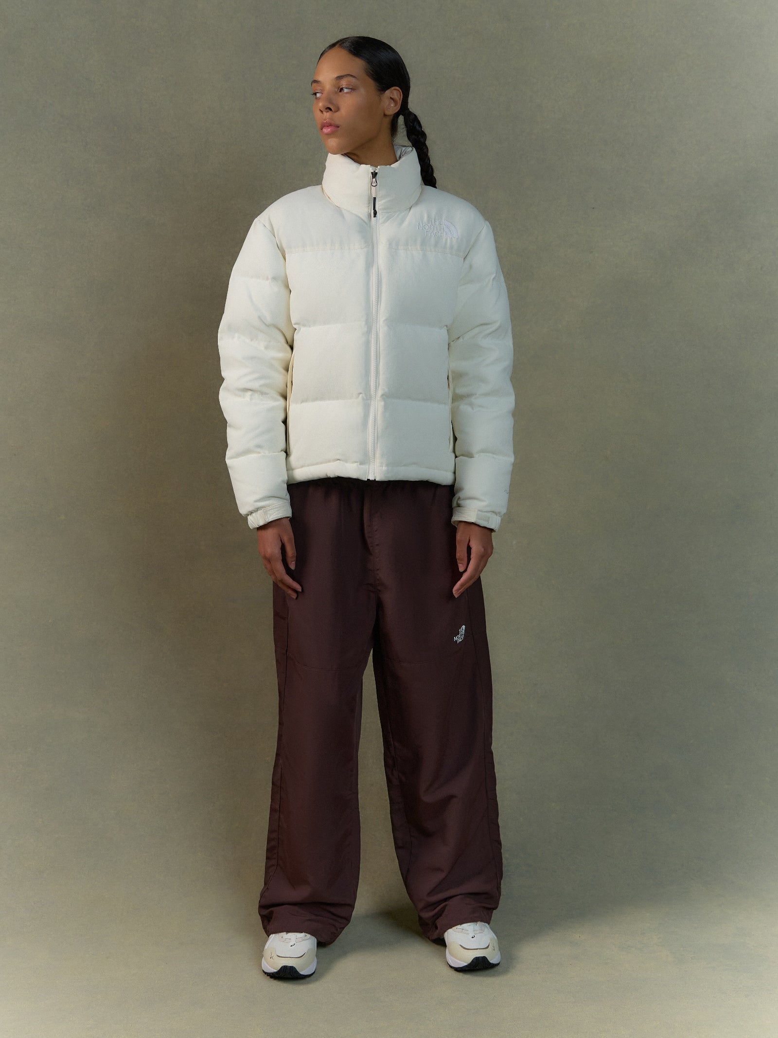 The Nylon Easy Pant offers a relaxed fit. The branding on the left side adds a touch of style to this versatile garment. Perfect for effortless and stylish everyday wear.