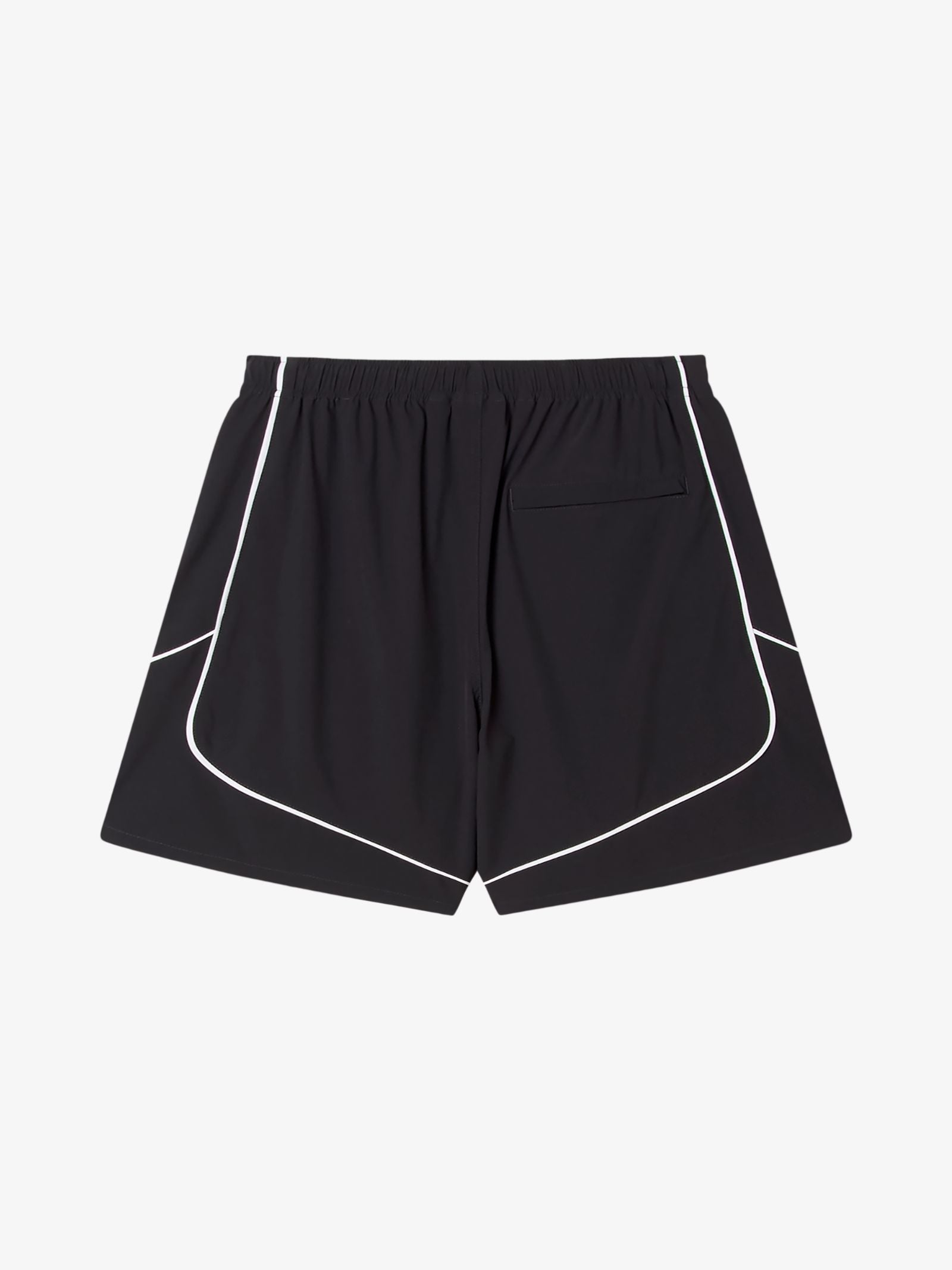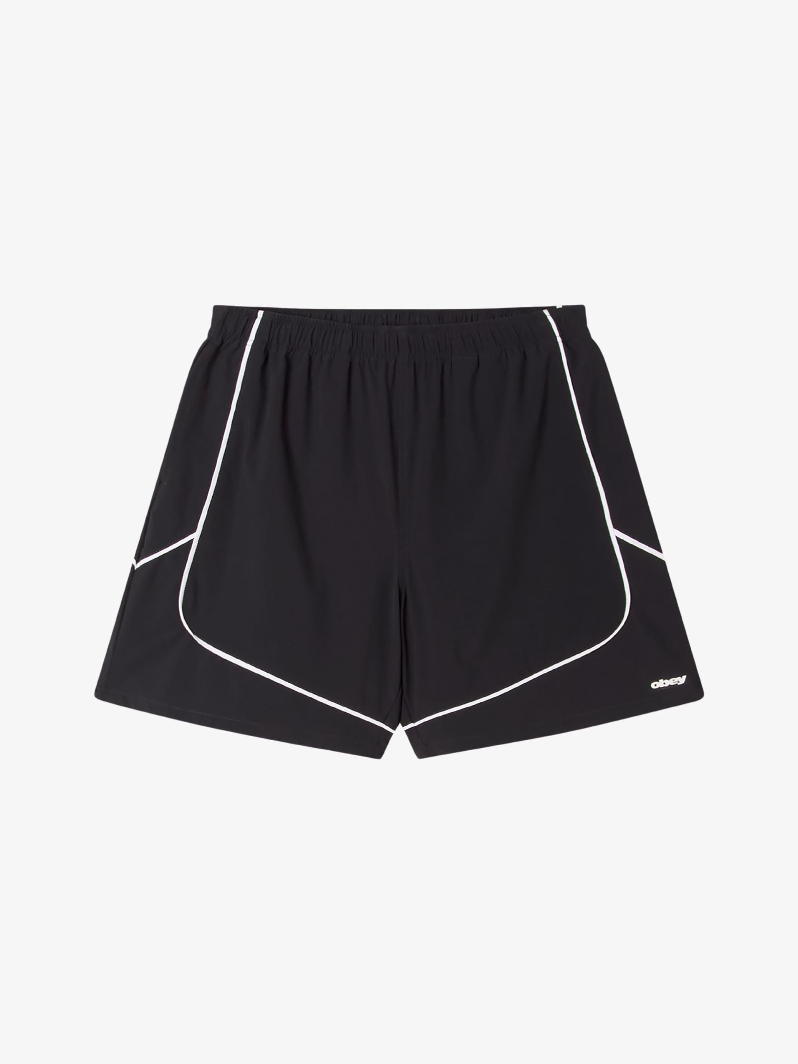The Corner Shorts by Obey are lightweight athletic bottoms featuring distinctive contrast piping across the front and back panels. These shorts are designed with a technical aesthetic, including a small "obey" typographic logo on the lower left hem and an elasticated waistband.