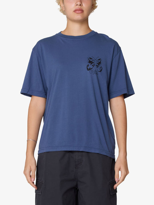 The Flutter Face Tee from Obey offers a relaxed fit with a bold butterfly graphic on the back and a smaller version on the front. Made from soft cotton, it features a crewneck and short sleeves for comfort.