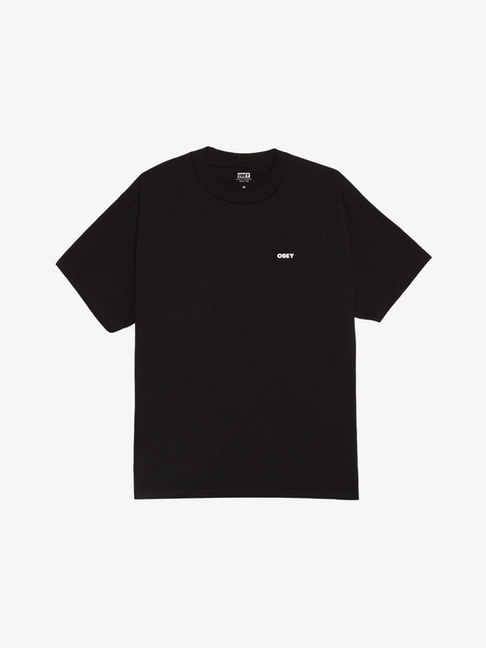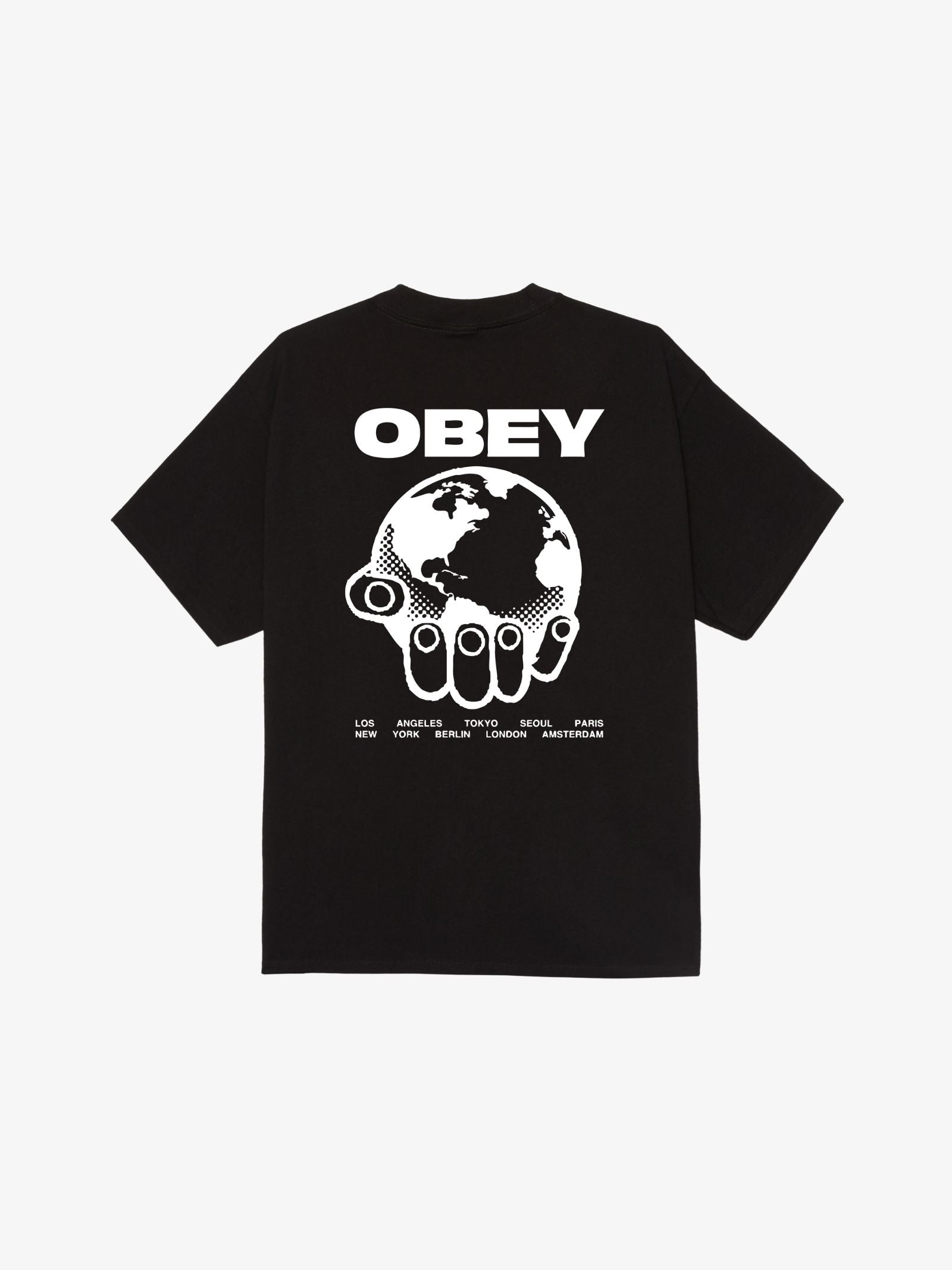 The Helping Hand Tee by Obey is a short-sleeve top featuring a small "OBEY" typographic logo on the front left chest. The back of the garment displays a large graphic of a hand holding a globe, accompanied by a list of international cities including Los Angeles, Tokyo, and London.