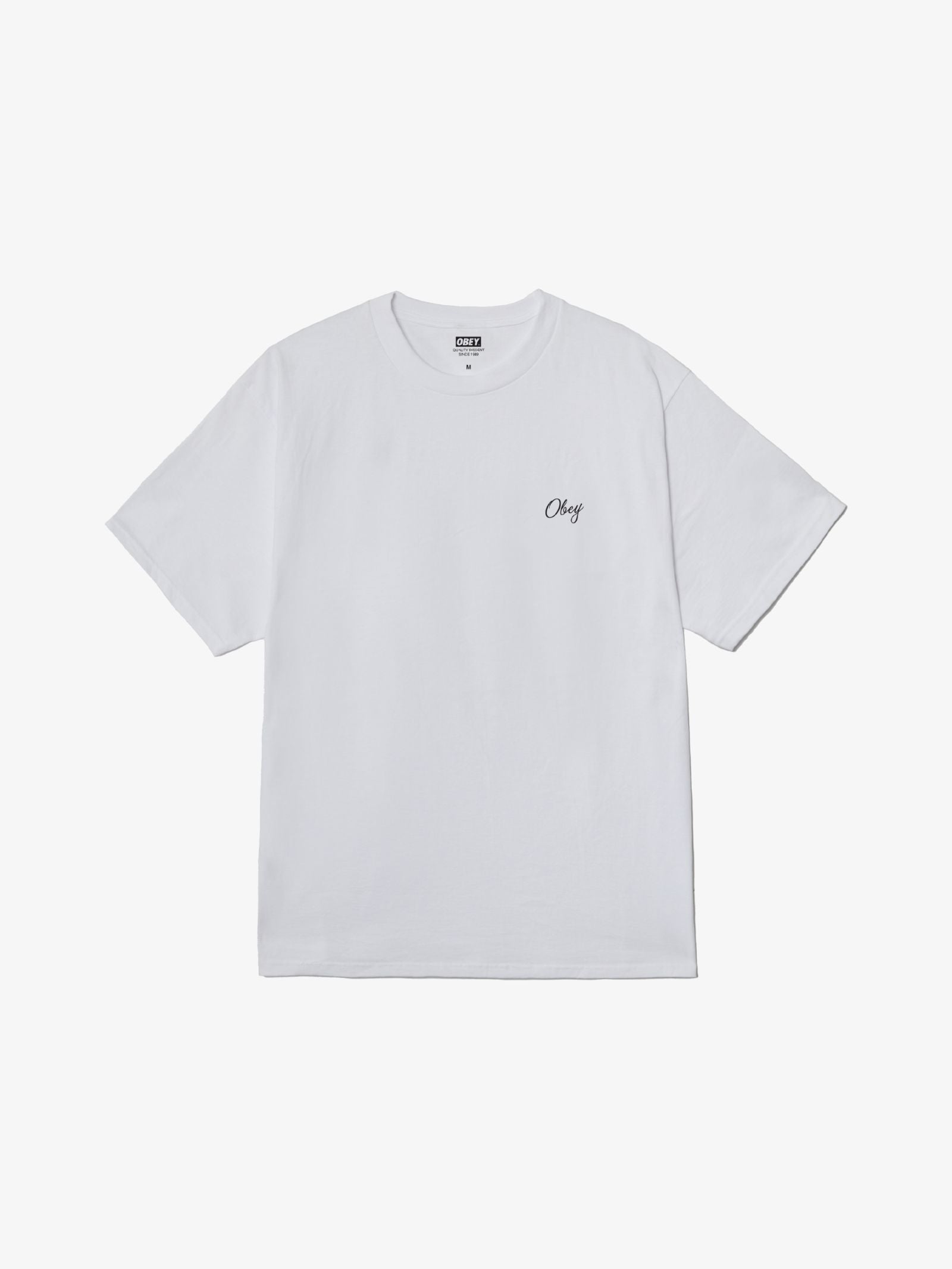 The Paper Rose Tee by Obey is a short-sleeve top constructed with a classic crew neck and a small cursive "Obey" logo on the front left chest. Complemented by a large, colorful rose graphic with typographic branding across the back.