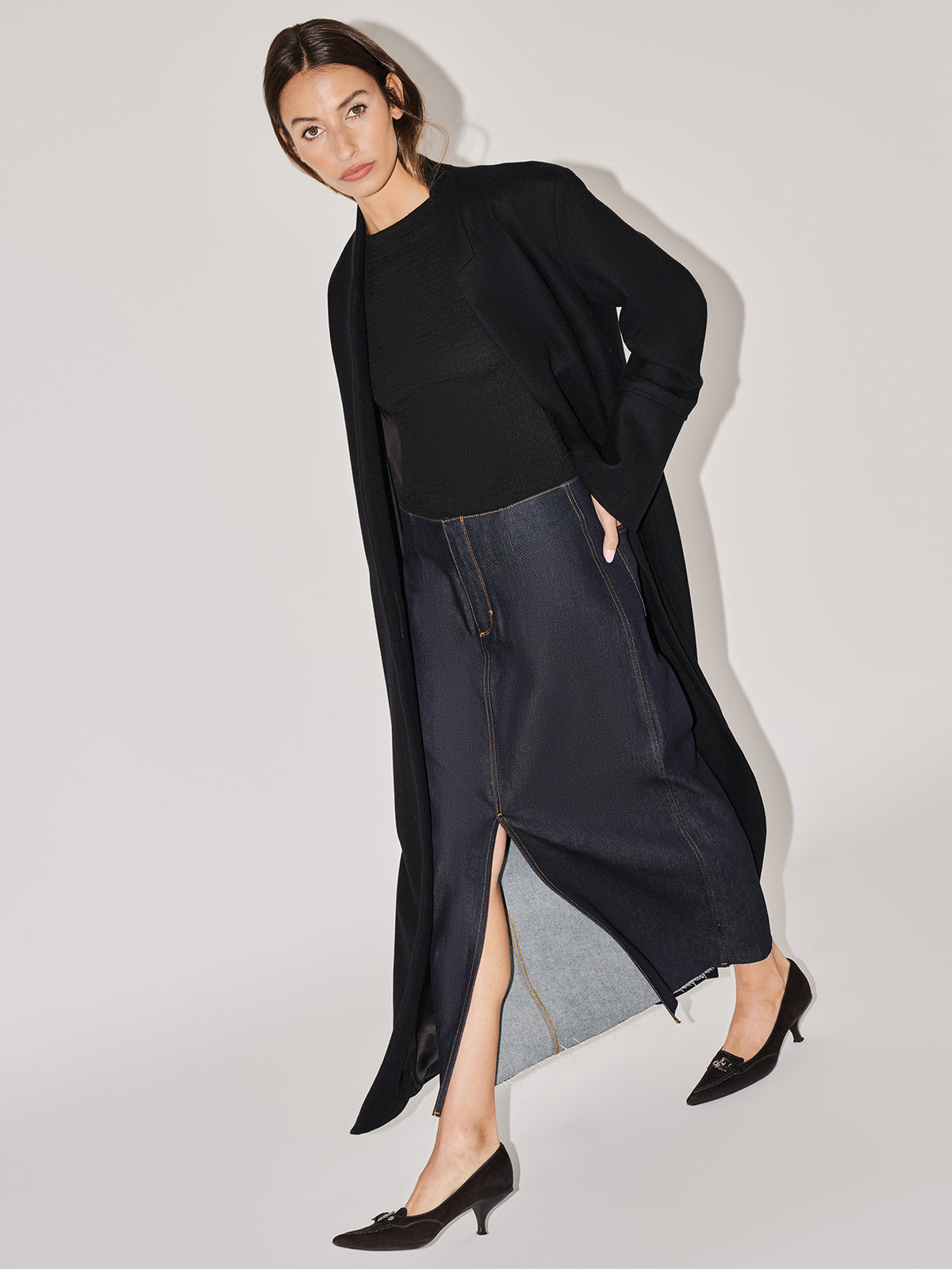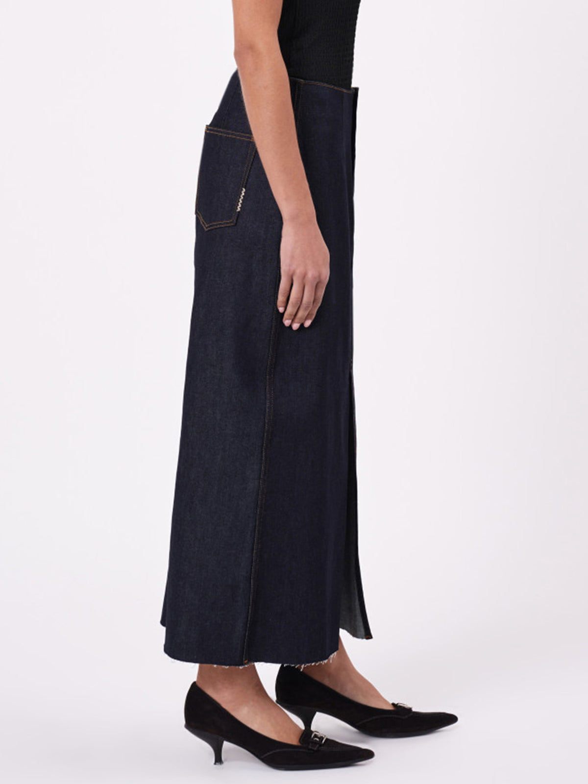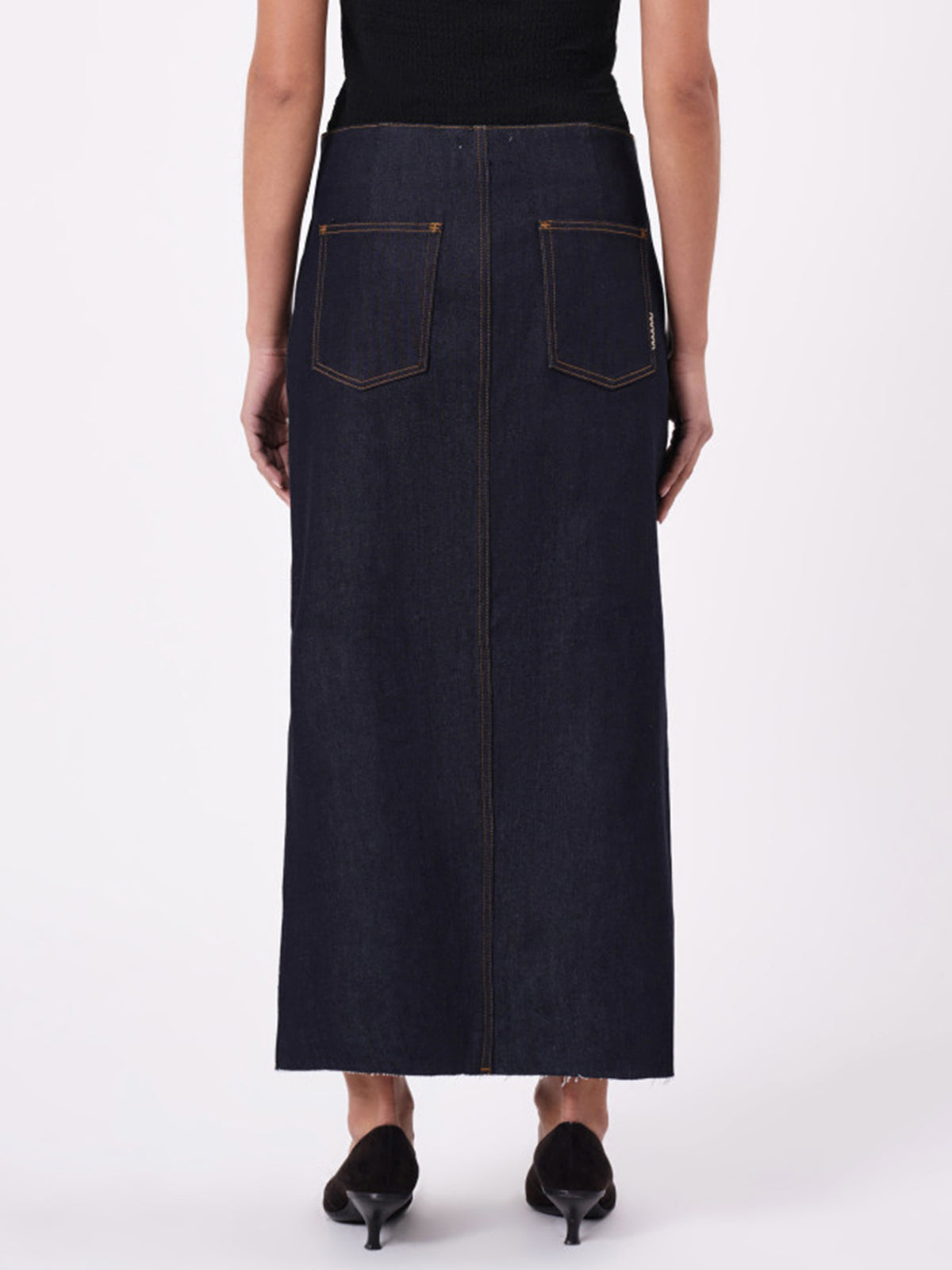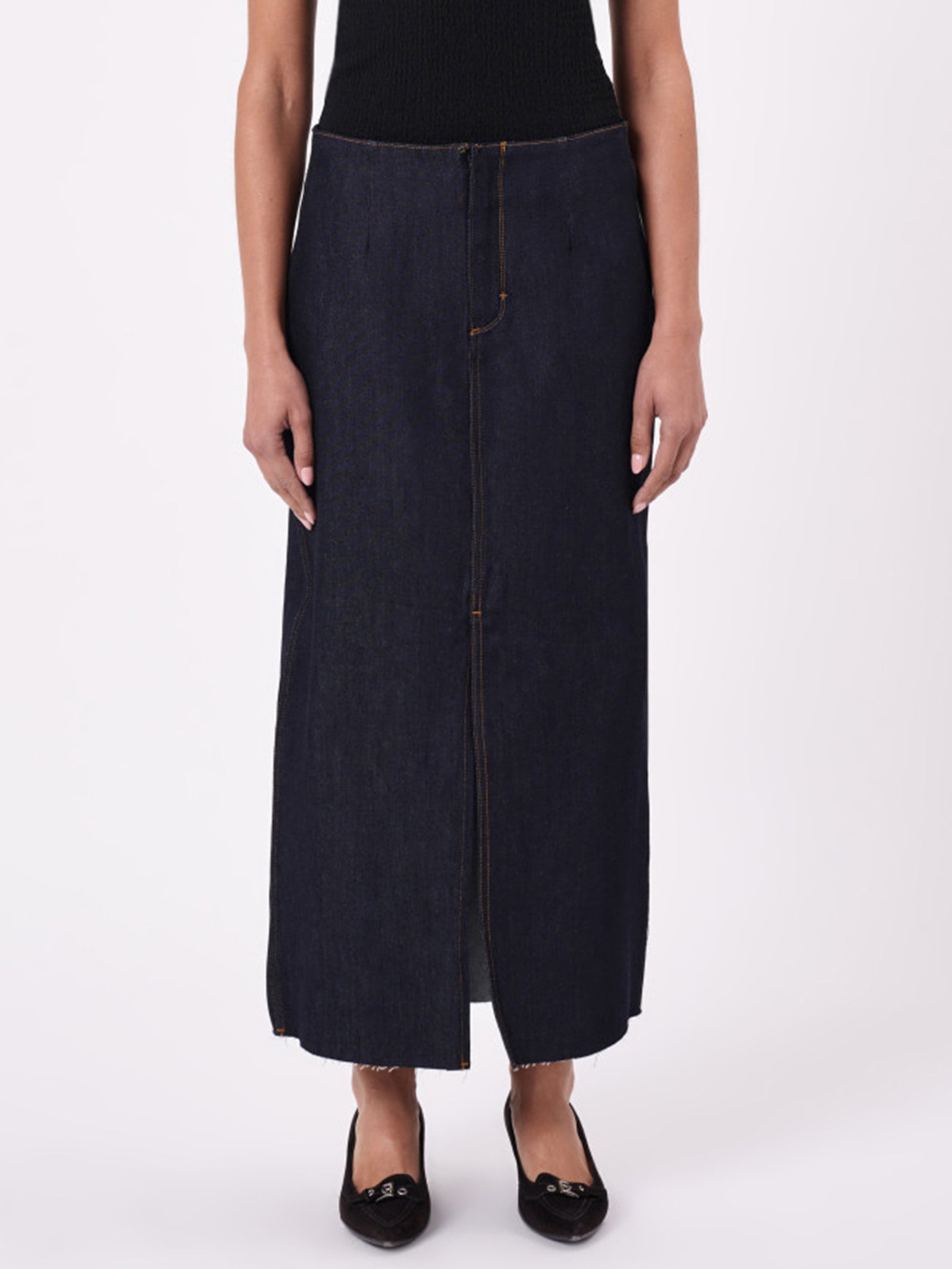Crafted from recycled cotton denim, the Recut Maxi Skirt Resonate delivers a slim, mid length silhouette. With a zip front and waist darts for shaping, this skirt is both chic and sustainable. The front hem split detail and contrast tobacco stitching add subtle yet stylish touches.