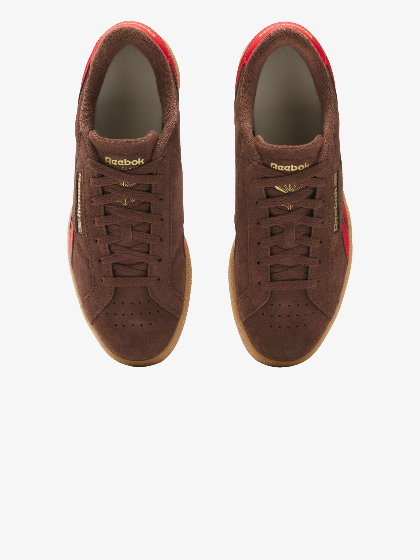 These Men's Club C Grounds UK Shoes from Reebok features a suede upper with leather accents, earthy colors, and gold branding. They are finished with a textile lining.